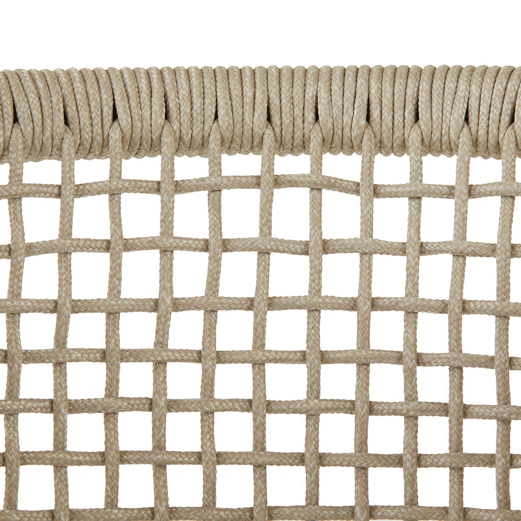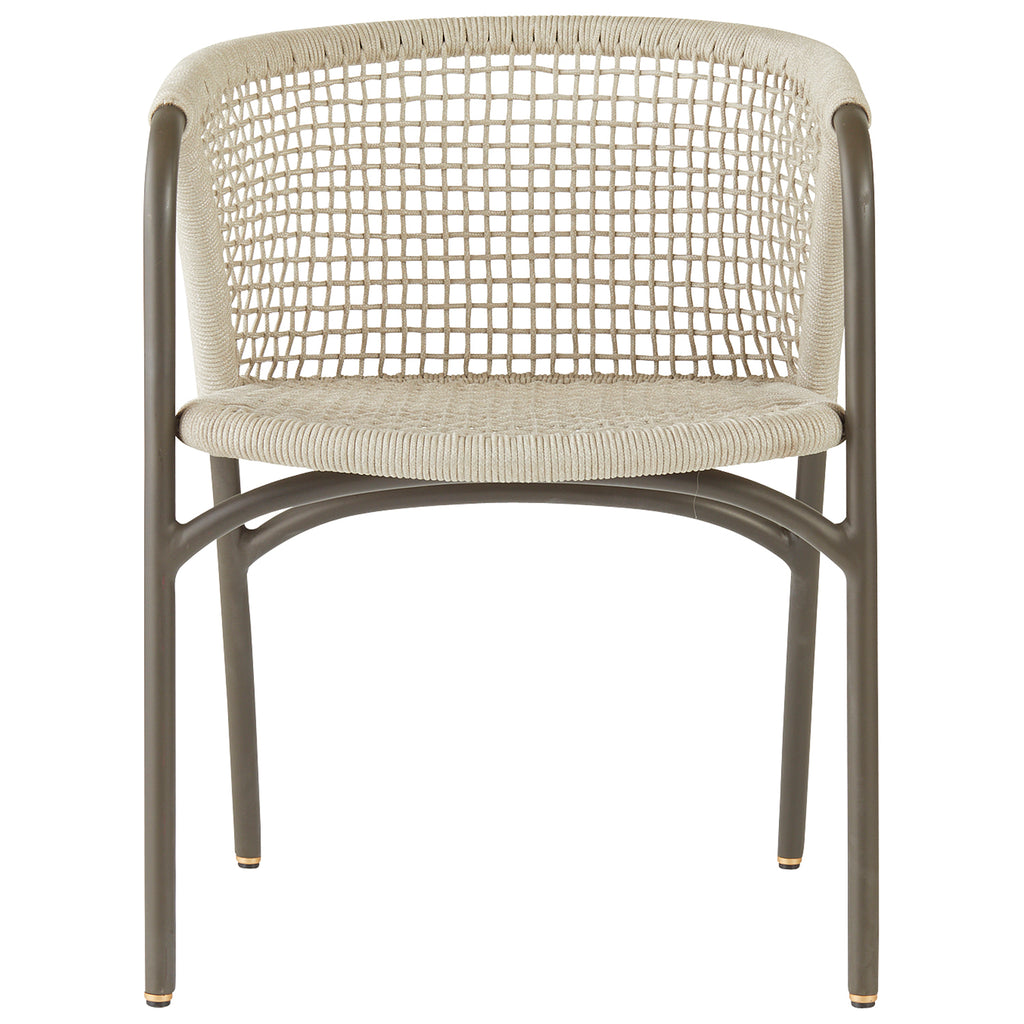 Swooping lines and gestural back legs give this dining chair a feeling of captured motion. An extruded arch frame of blackened bronze aluminum juxtaposes an organic woven seat of buff synthetic rope to add a textural allure to the minimalist silhouette.