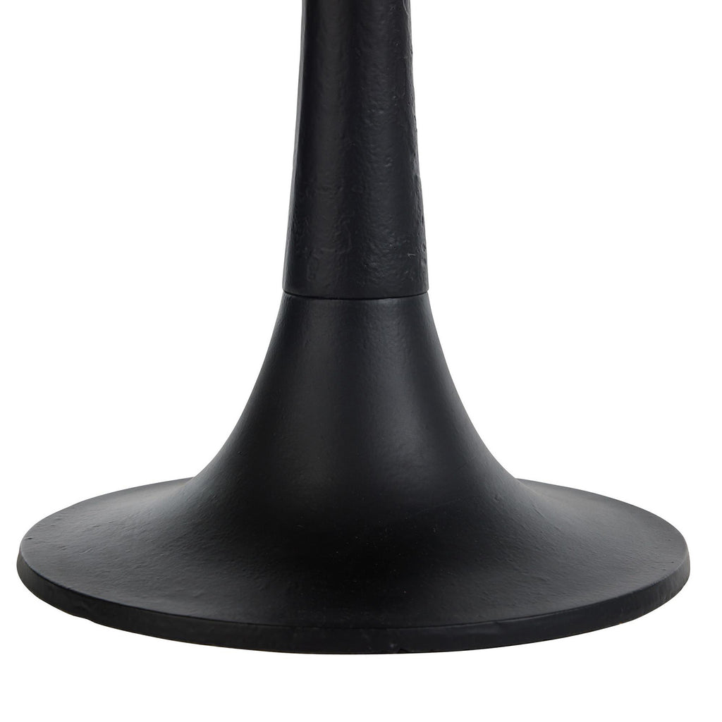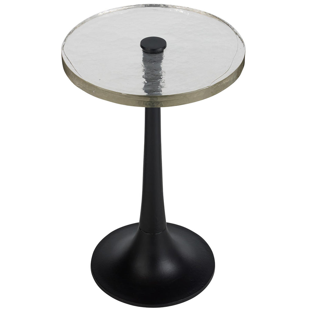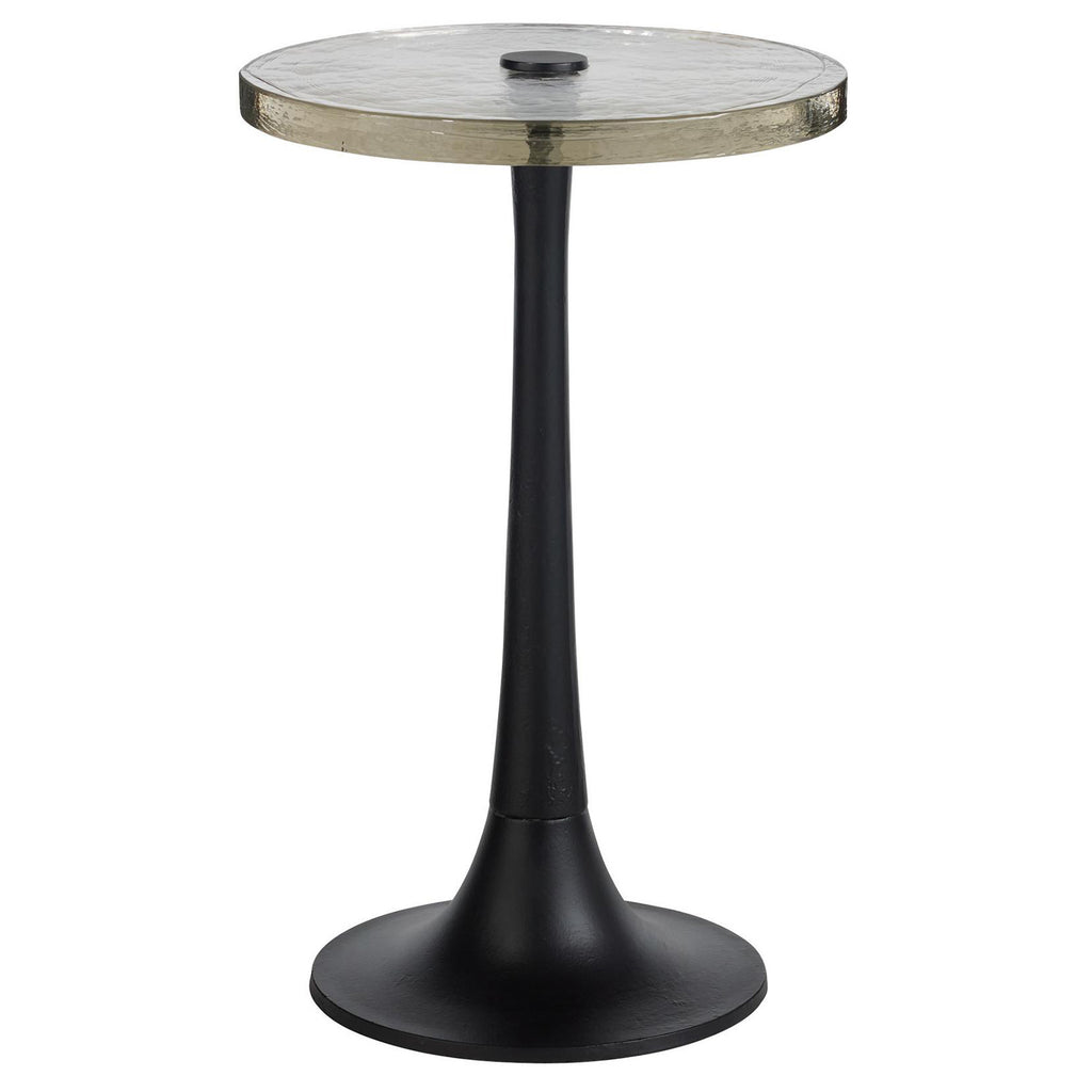 A timeless silhouette sets the stage for this all-occasion accent table. A thick clear cast glass top showcases an artisanal texture that offers an organic feel—a technique used since the Egyptian period. A modern tulip iron base penetrates and suspends the glass to offer a more contemporary take on traditional pedestal-style tables. Finish will vary.