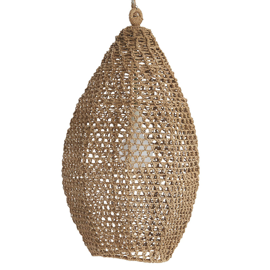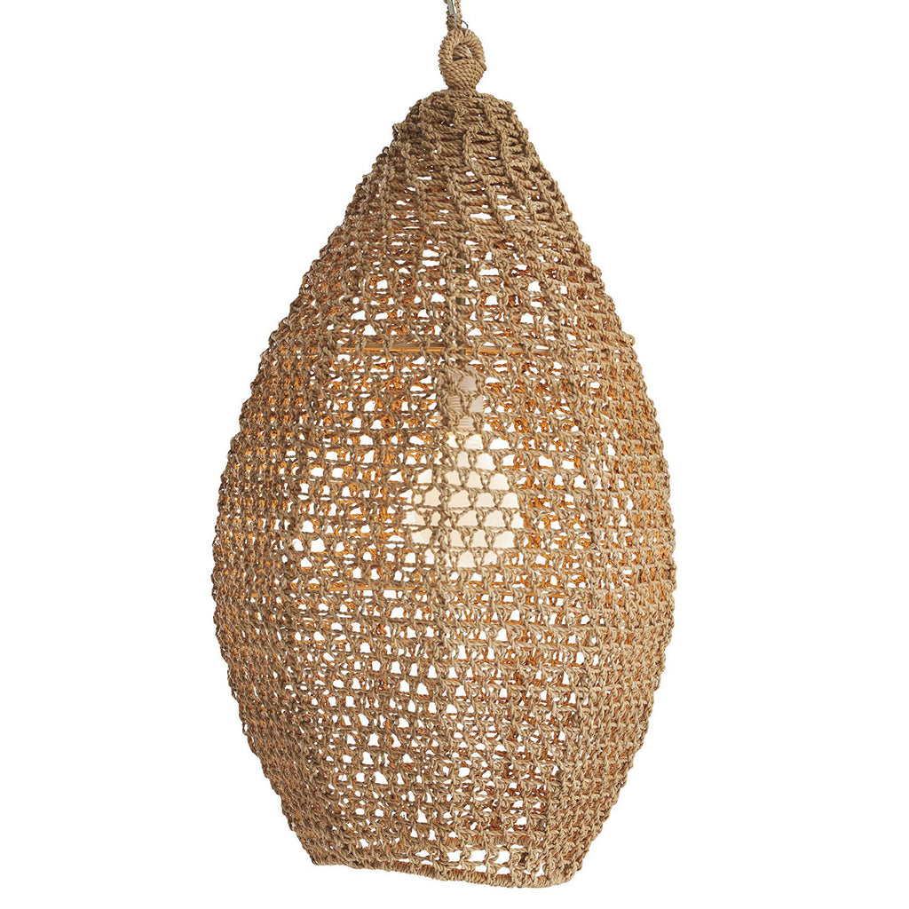 Hand woven sea grass in its natural coloration forms a graceful teardrop shade. A single bulb floats inside its own hive. Shown with a 4″ frosted globe bulb. Due to the nature of the jute-wrapped cord, it cannot be adjusted; finish will vary.