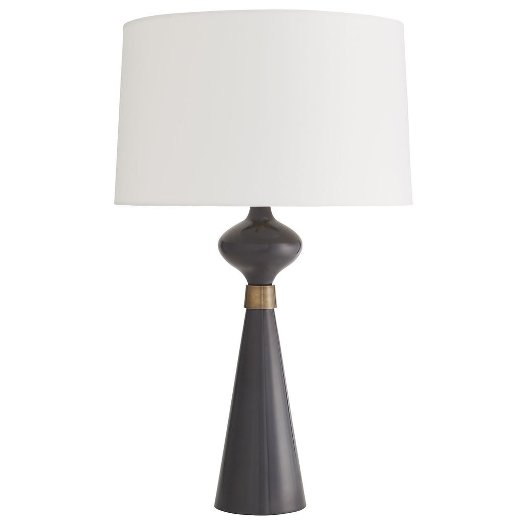 With clean lines and spherical curves this debonair table lamp draws inspiration from vintage empire waist dresses. Its aluminum foundation features a bold bronze finish with a contrasting antique brass band that cinches its top and accentuates its flourishing form. Topped with an off-white cotton drum shade with off-white cotton lining; finish will vary.