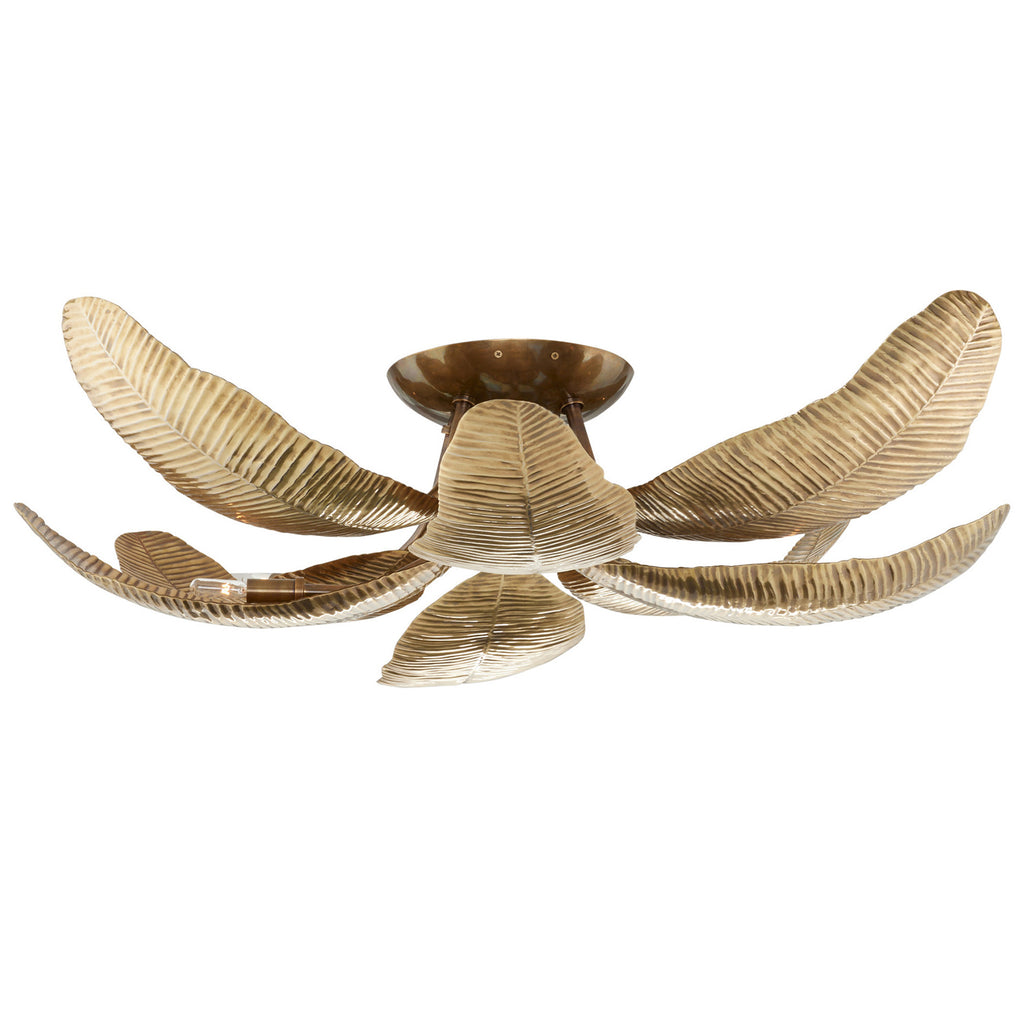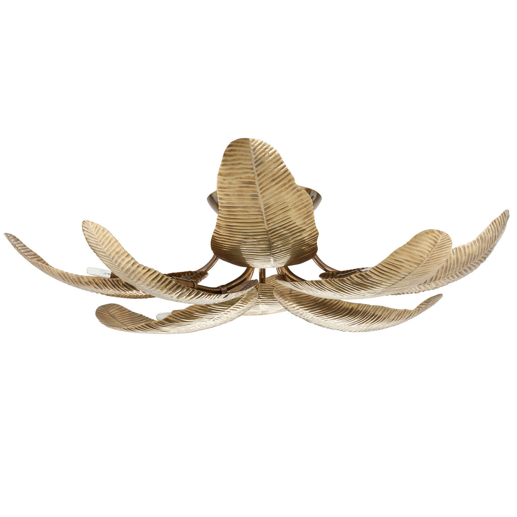 Botanically inspired, our vintage brass fixture's shades are carefully sculpted to recall the fronds of a banana leaf tree. An update of the classic '70s-style palm lamp, the Farah radiates light upward for dramatic illumination. Vintage brass-plated iron canopy. Damp-rated, although limited covered outdoor areas may affect finish; finish will vary.