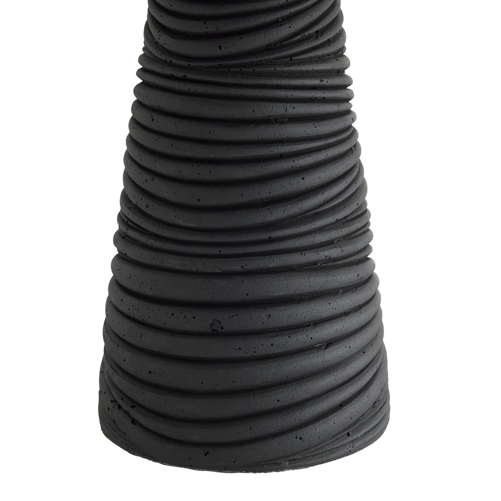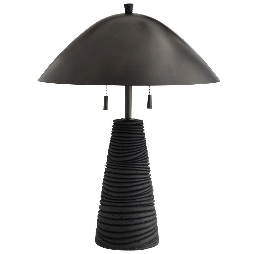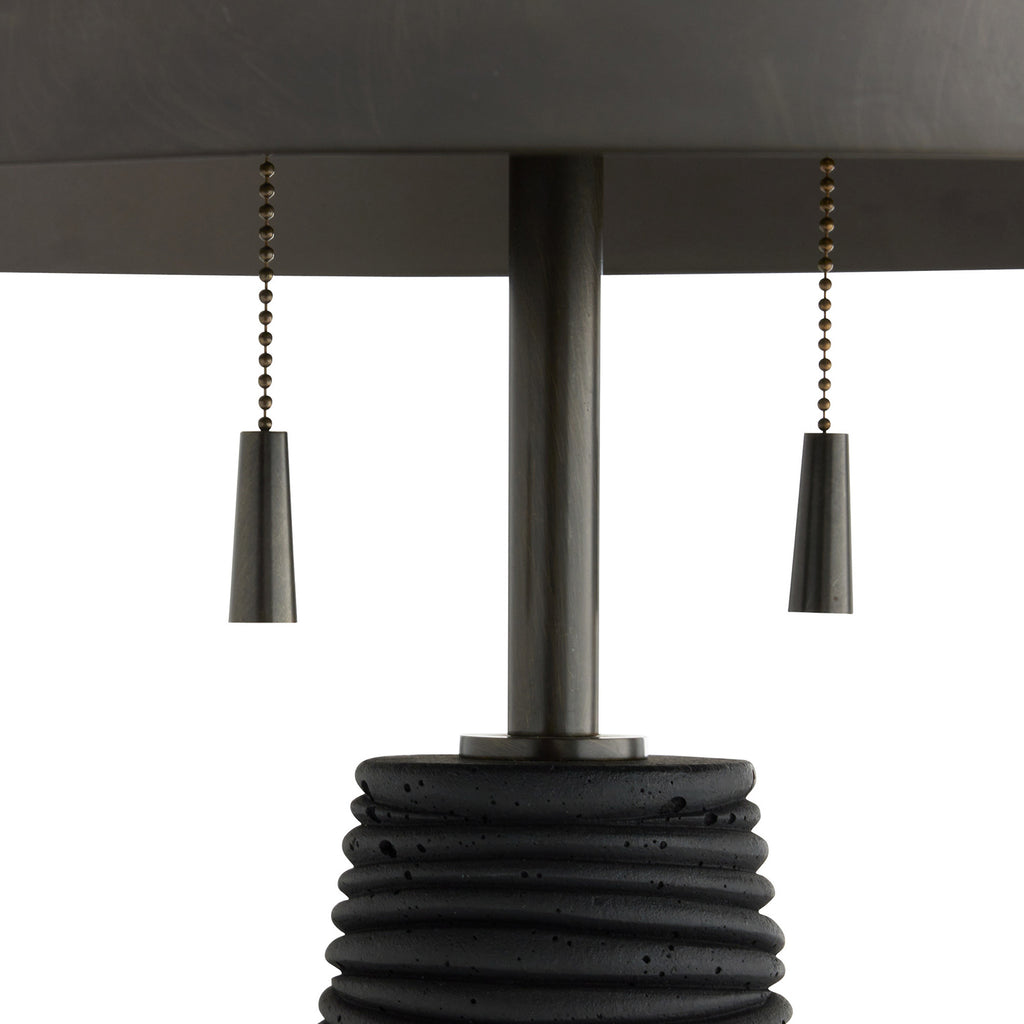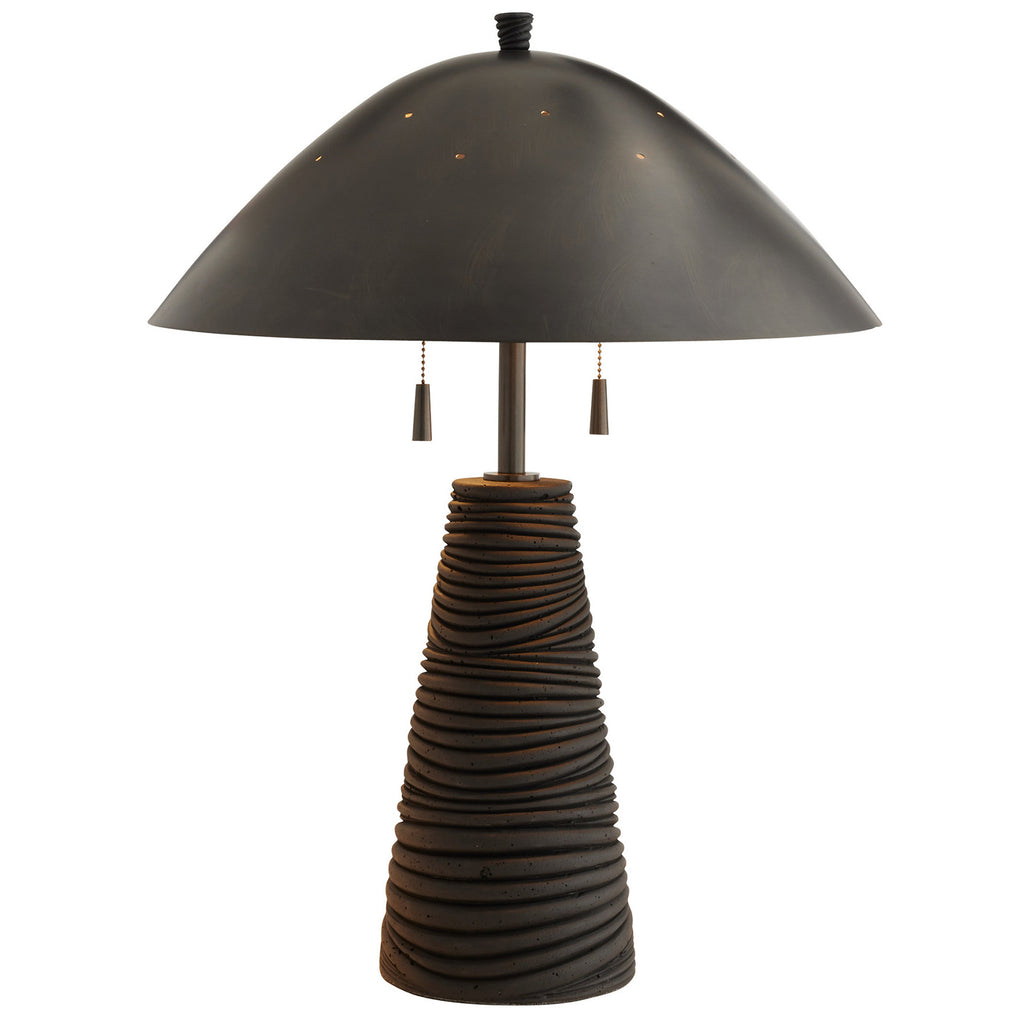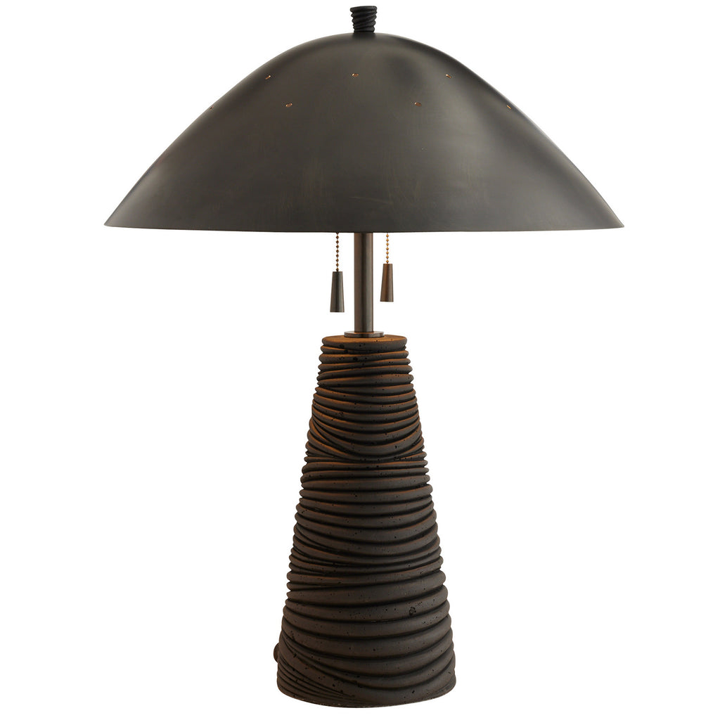 Crafted of black lava stone composite, the Fender has an eroded, ridged surface that lends textural intrigue. A helmet-like shade of bronze-plated steel reflects light to lend a moody vibe to any surface. Matching swirl texture finial and double bronze pull chains; finish will vary.