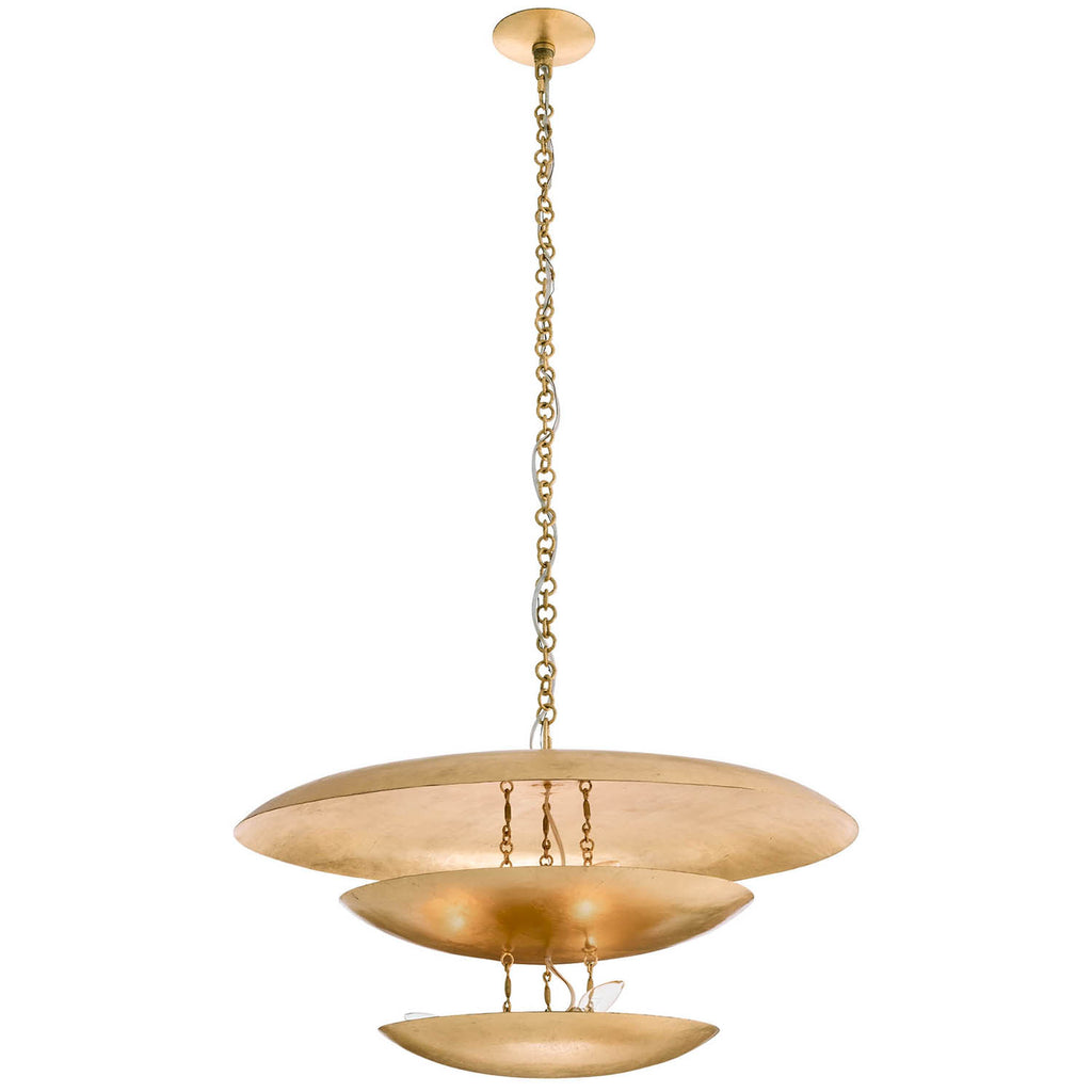 The Florko Chandelier is out of this world. This eight-light design features gold-leafed iron curved discs that float effortlessly under the space-like dome. Both lower levels hold lights, creating a soft glow. Hand-applied gold leaf finish may vary. Additional chain available (CHN-123); finish will vary.