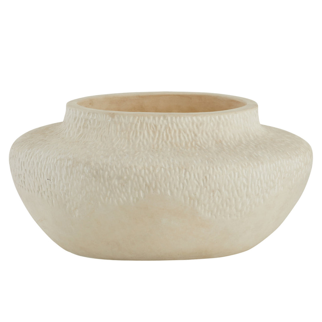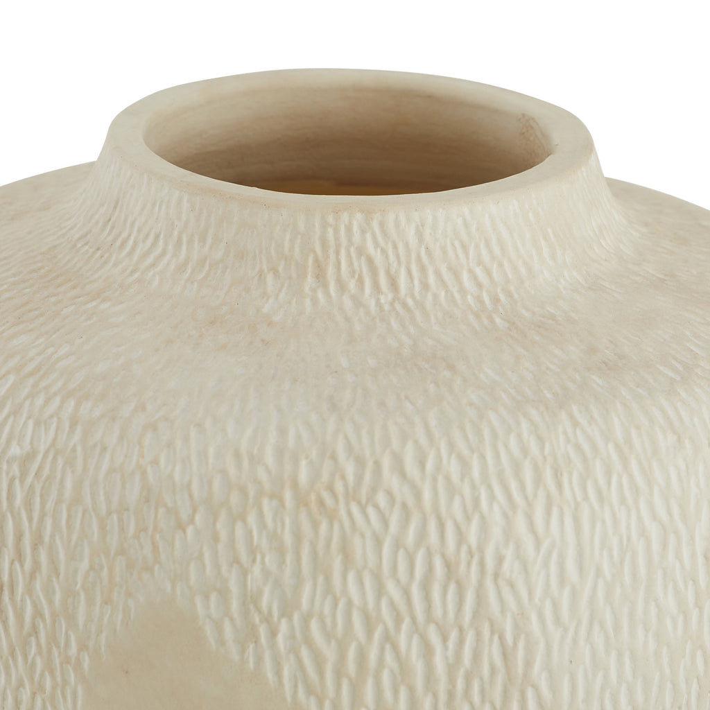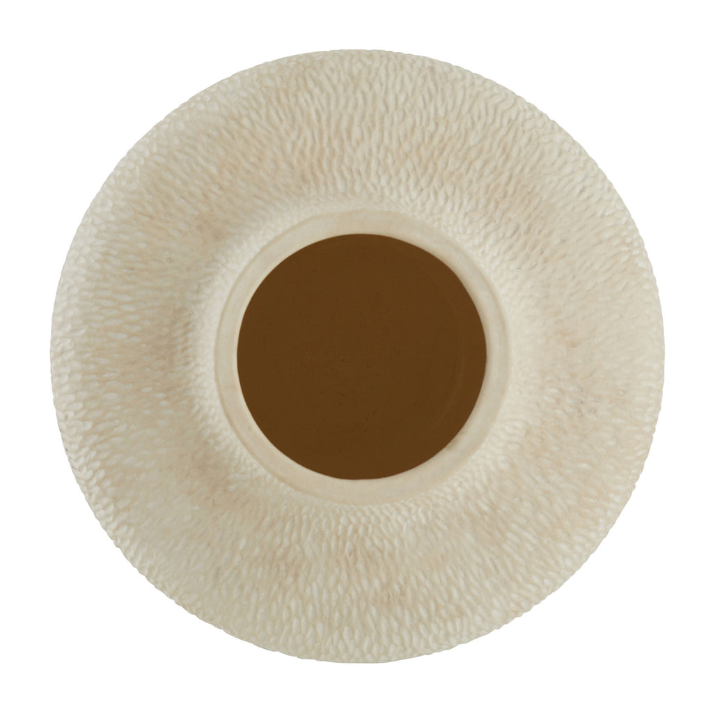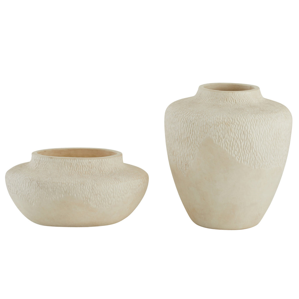 Like ancient urns, these classical terracotta accents have a moss-like texture and weathered finish, embodying the feel of a found object. Each vase is glazed in an eggshell shade; finish will vary.