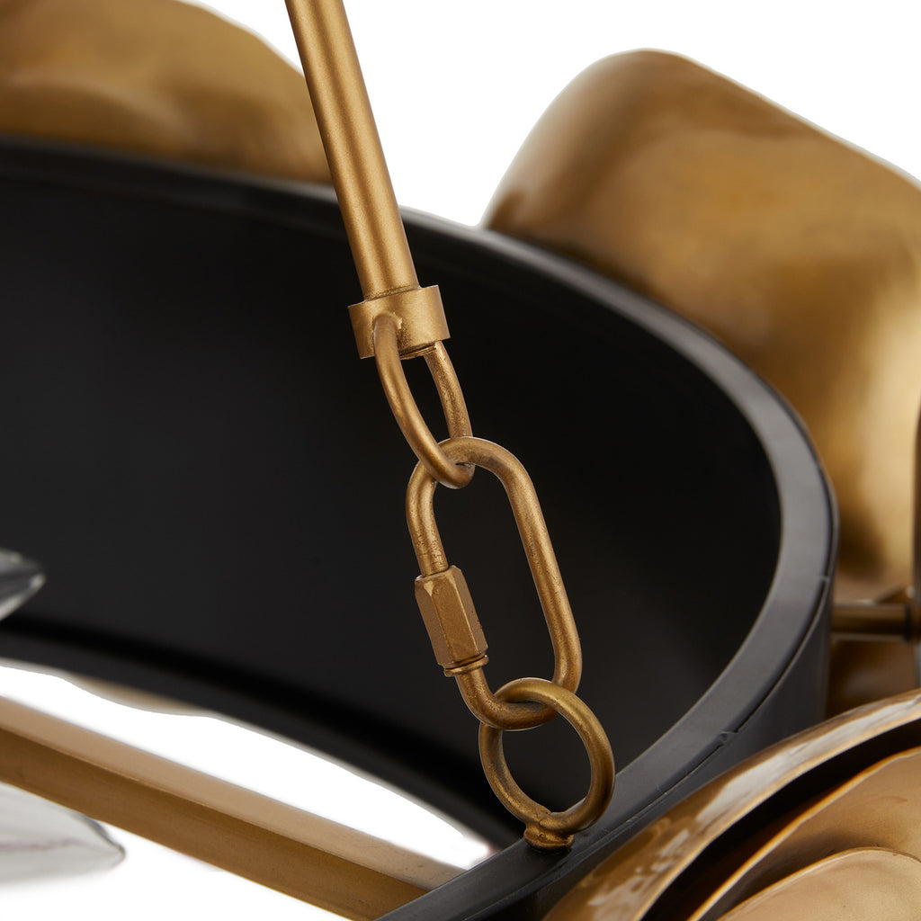 Like the rings found in a natural agate stone, hand-formed accents of antique brass-plated aluminum add depth and interest to this dramatic fixture. Adorning a bronze-plated steel drum shade, the bold motifs hint at botanical abstraction while delivering moody, ambient light. Damp-rated, although limited covered outdoor areas may affect finish; finish will vary.