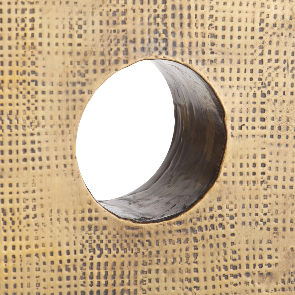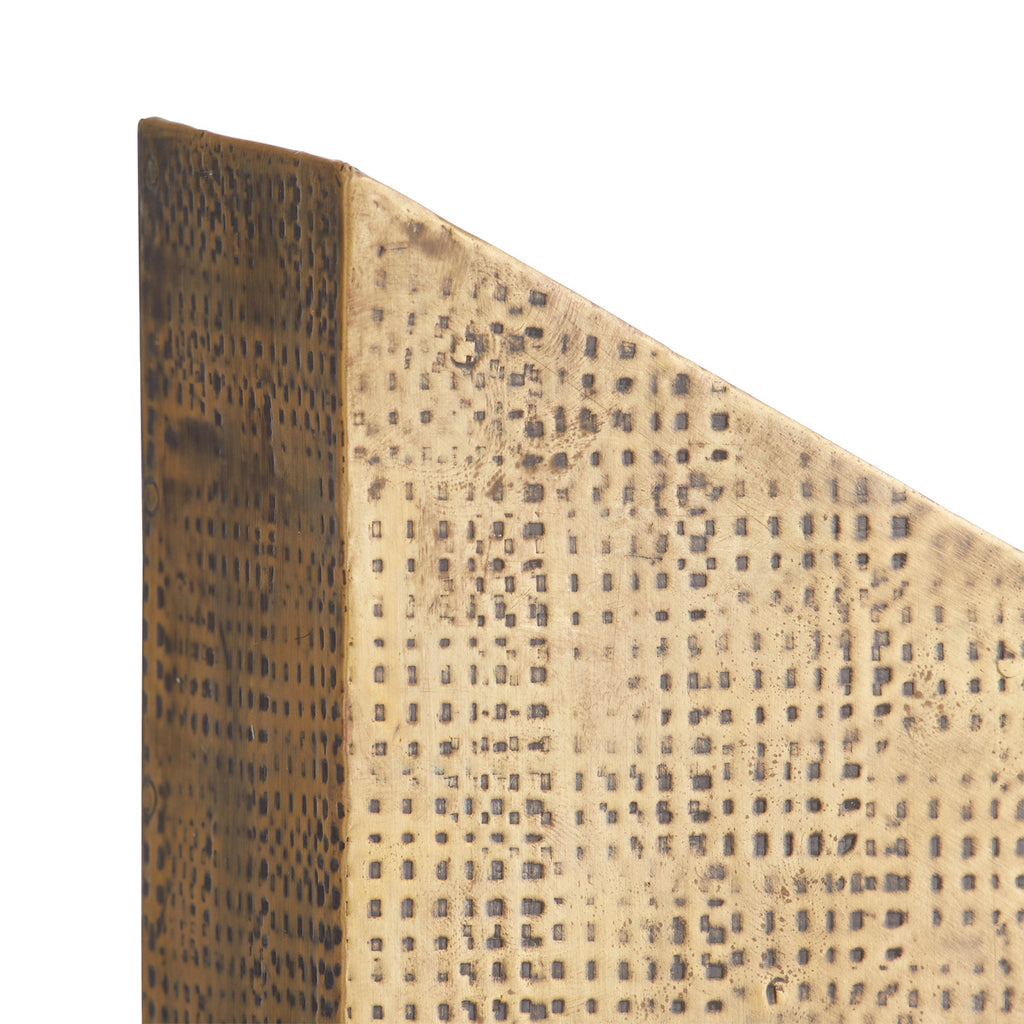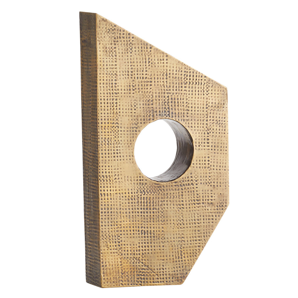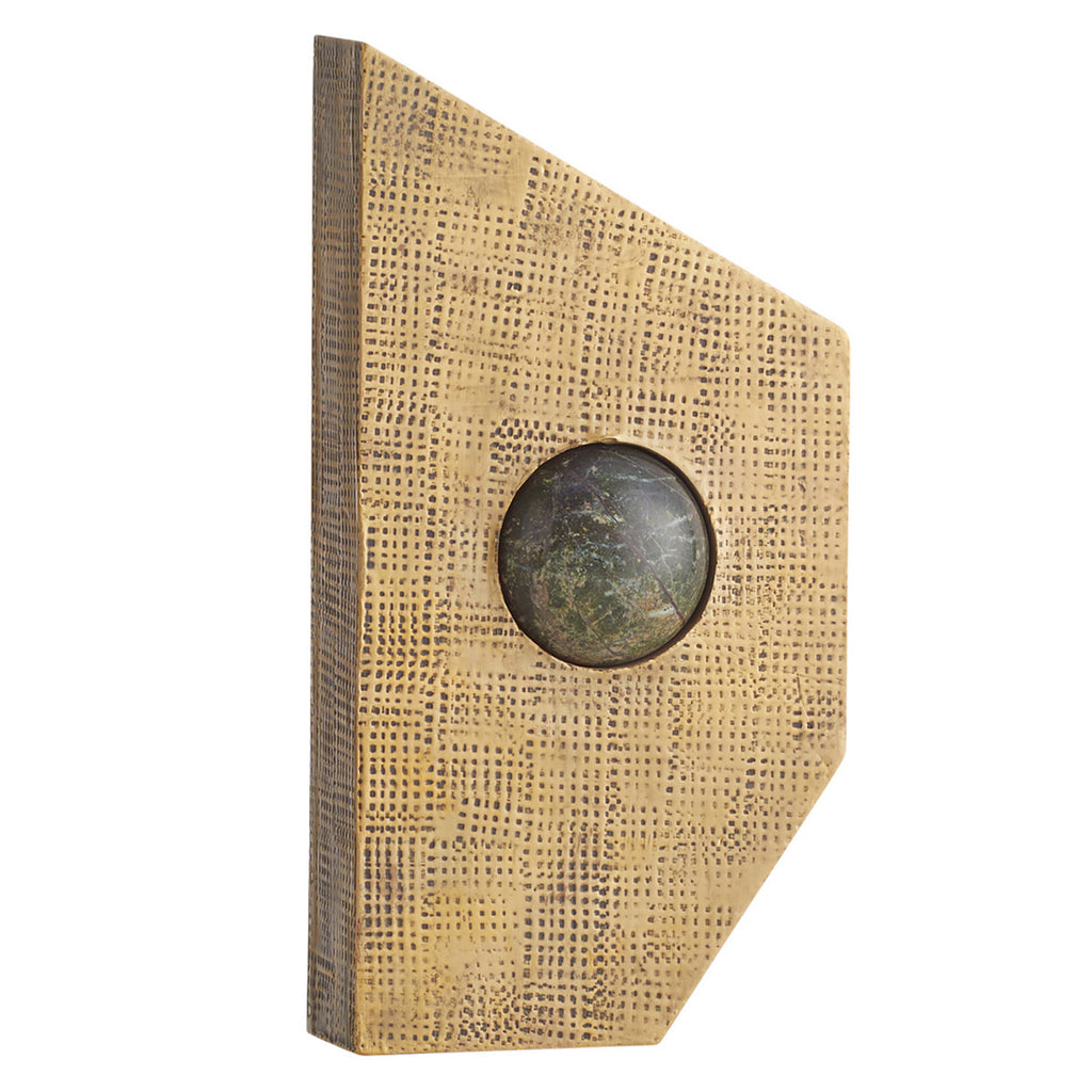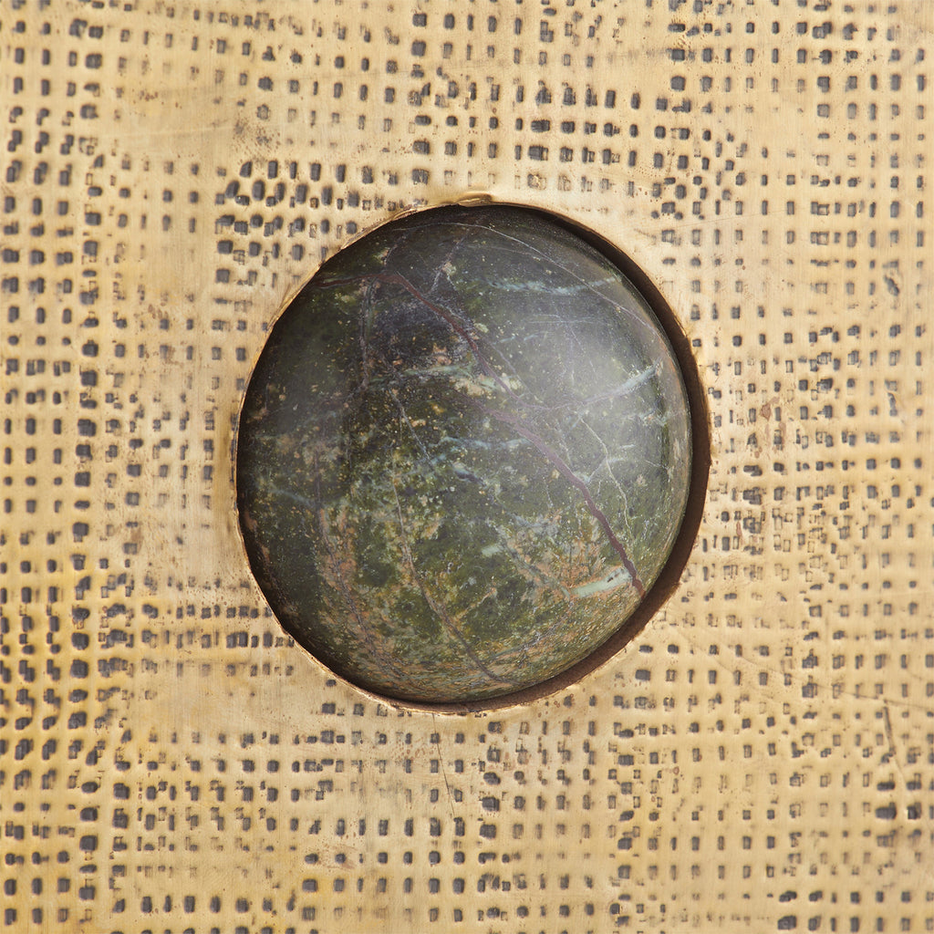 Evoking classic architectural forms, antique brass-clad bookends possess a geometric texture. A single orb of jungle marble adds a playful, puzzle-like accent to one of the pair; finish will vary.