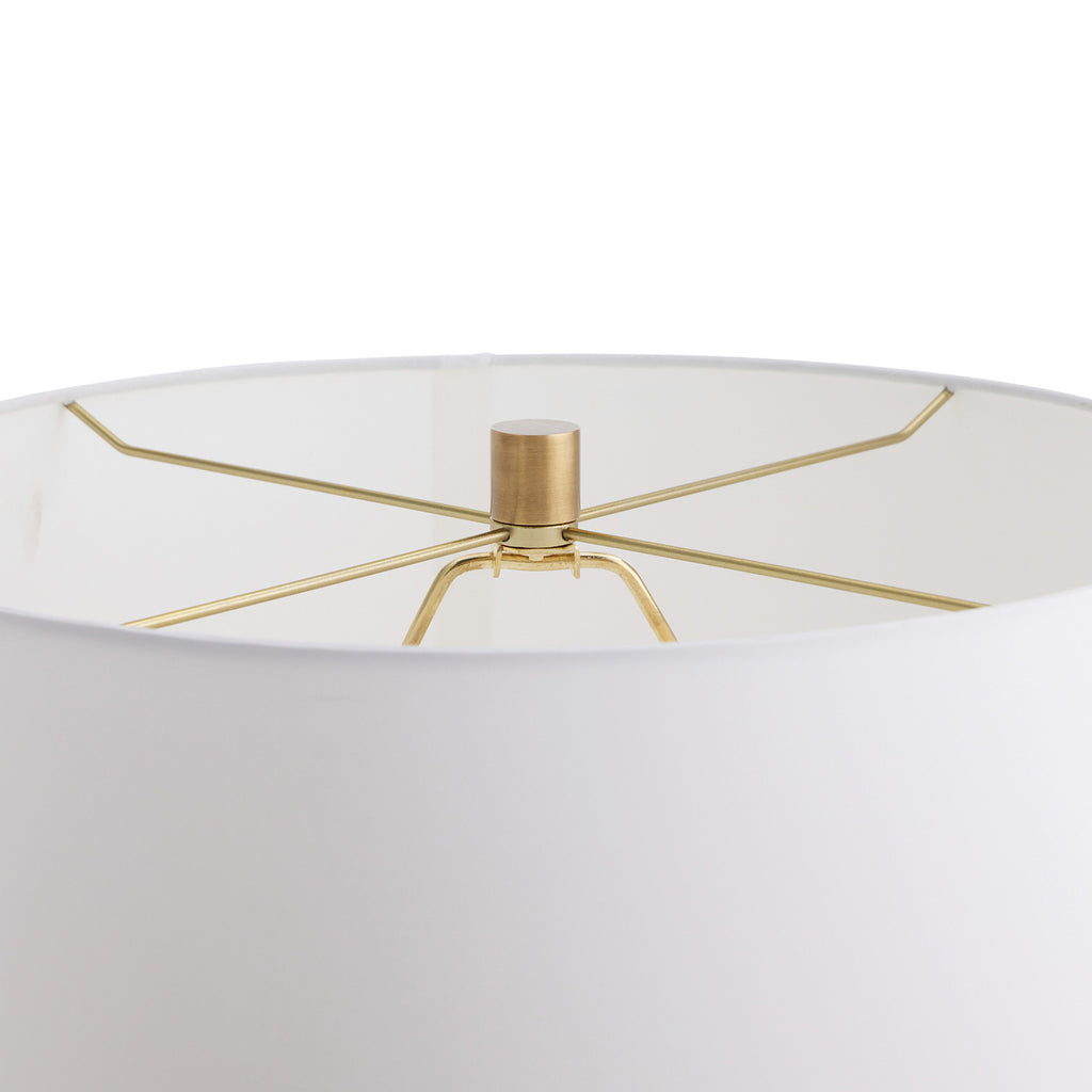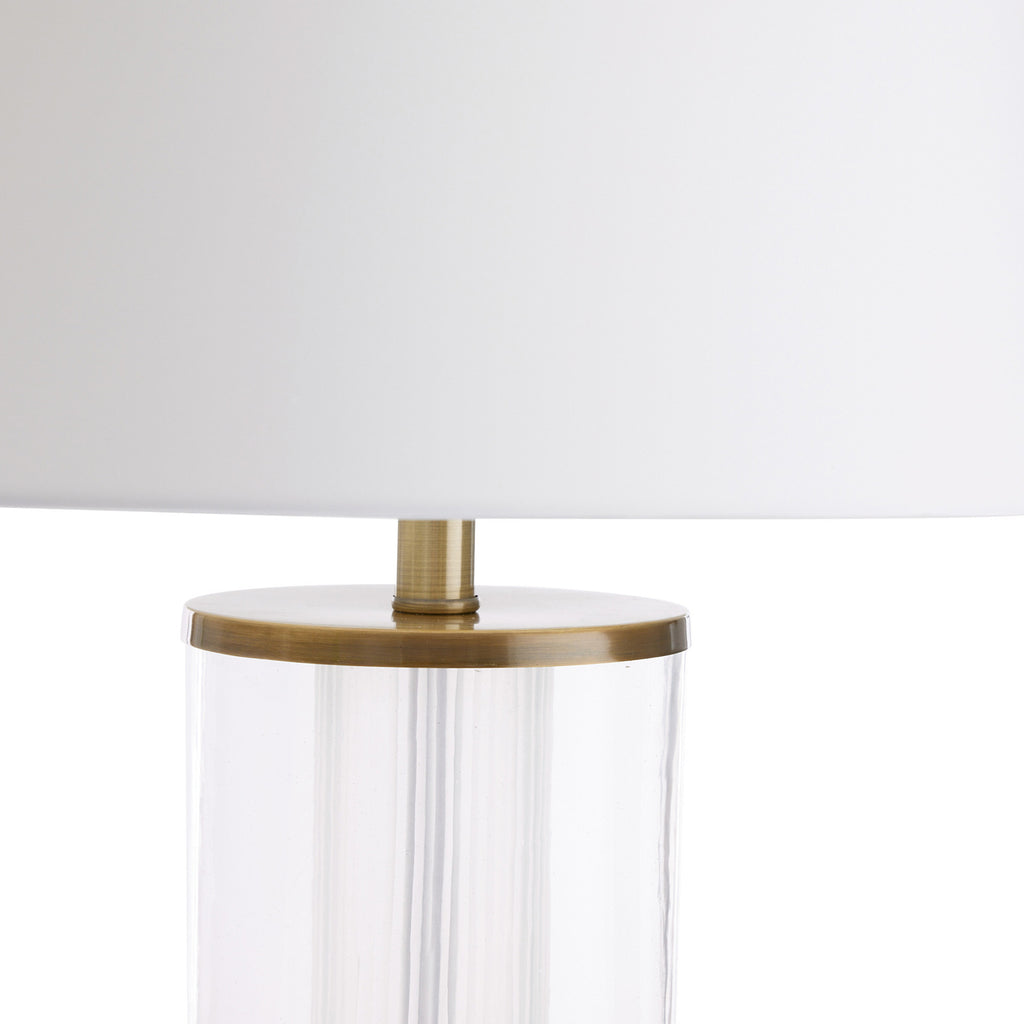 Clear etched glass and vintage brass form an alluring combination on our tailored table lamp. A brass-plated iron base is surrounded by intersecting etched cylinders that play with layering and transparency. An off-white microfiber drum shade lined in off-white cotton is secured with a matching finial.