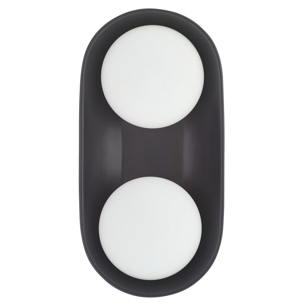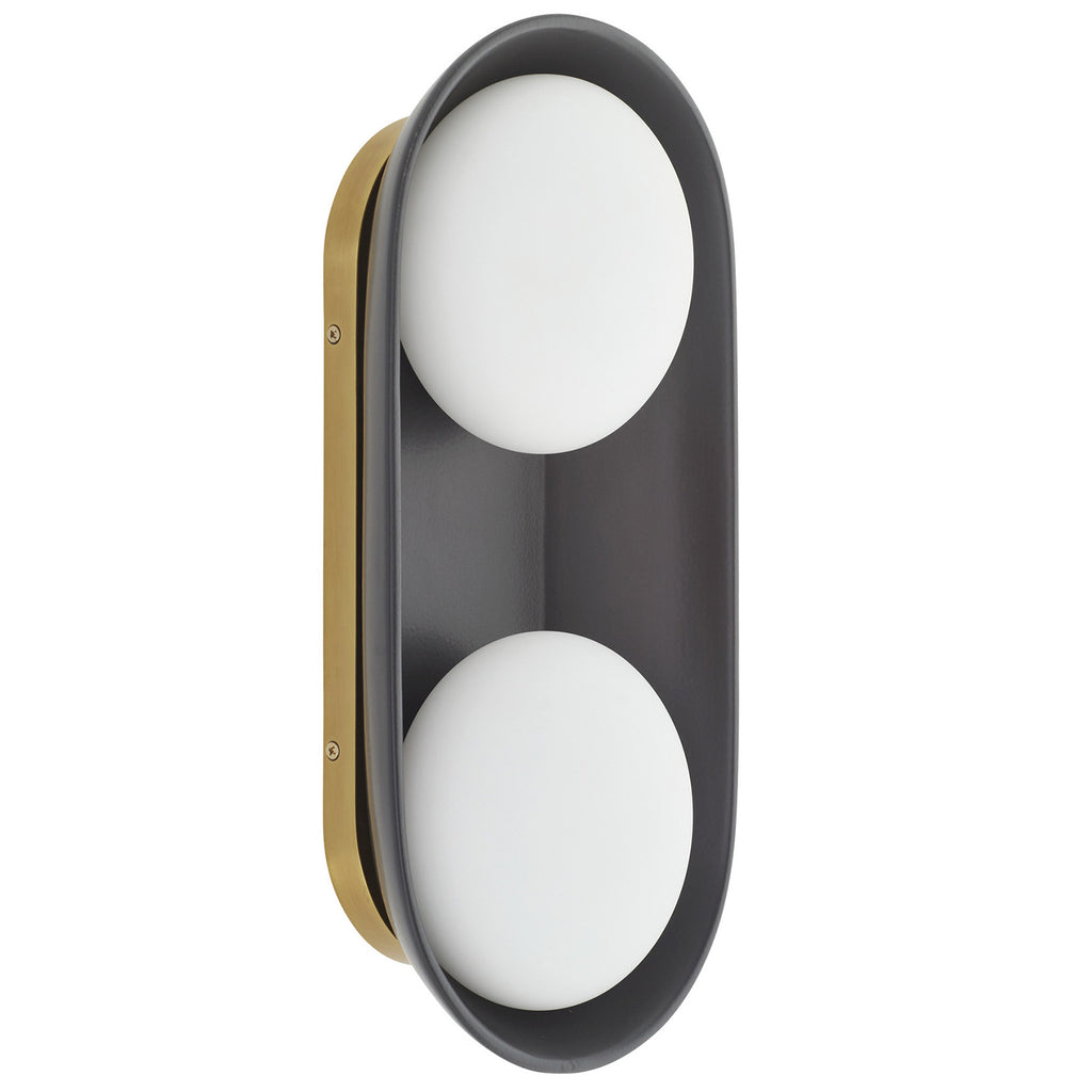 A stunning matte black brings warmth and depth to this uniquely modern, minimalist design held by antique brass-plated steel. The ceramic shade is complimented by double frosted glass lights that cast a warm, flattering glow. Equally at home in bathrooms, corridors, at the bedside and in hospitality settings, this ADA-compliant sconce is versatile and playful; finish will vary.