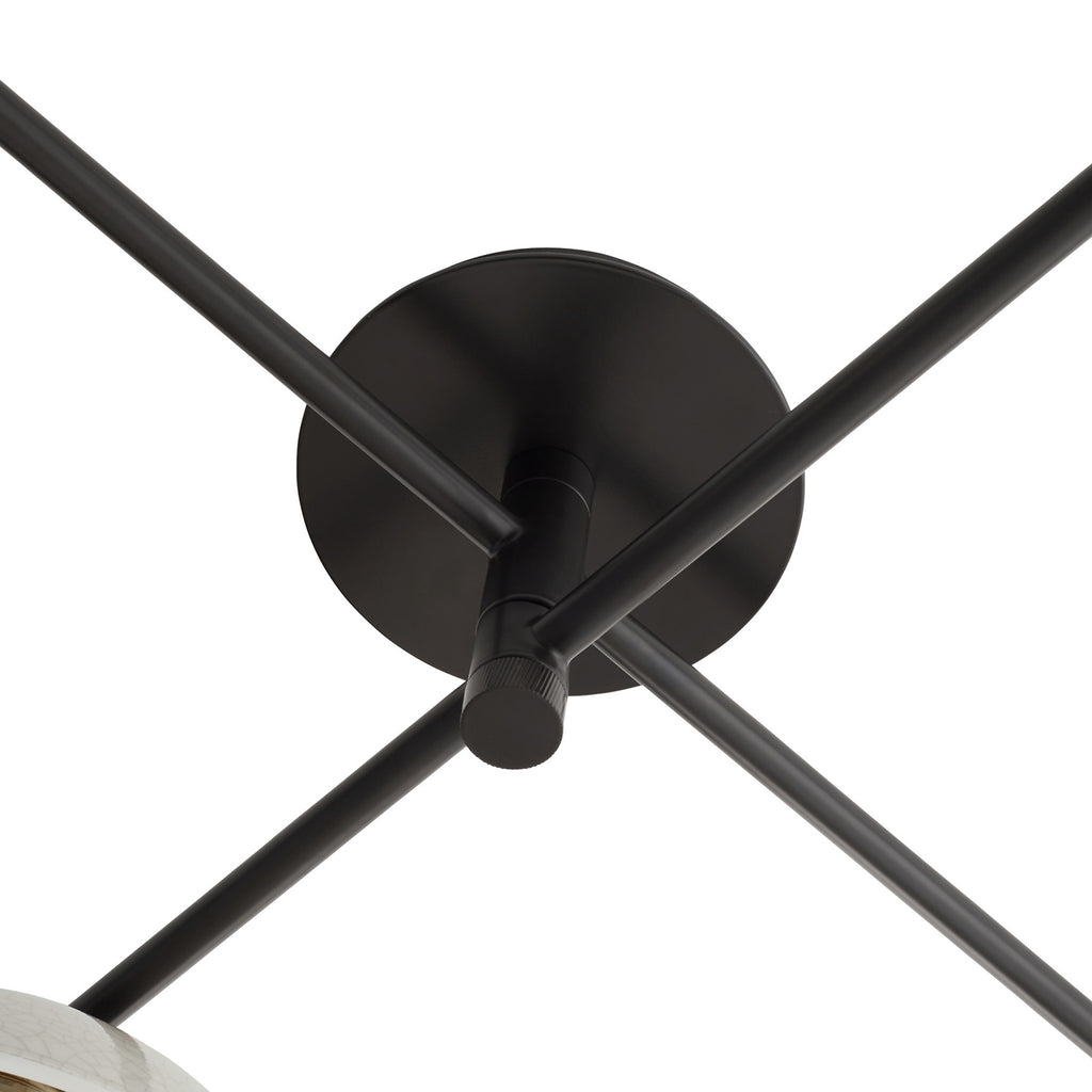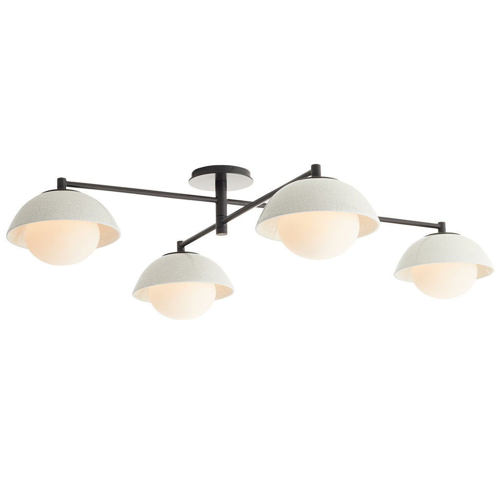 A highly flexible solution for spaces of all kinds, the Glaze multipoint flushmount features two adjustable, pivoting arms with four frosted glass lights with stained ivory crackle ceramic shades. The design offers users the ability to customize the blackened steel fixture’s layout to the space, casting light where it is needed. Excellent for transitional areas like foyers or hallways; finish will vary.