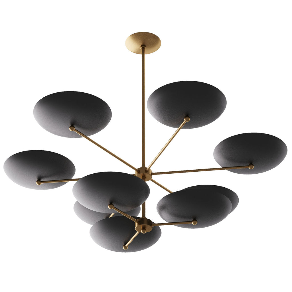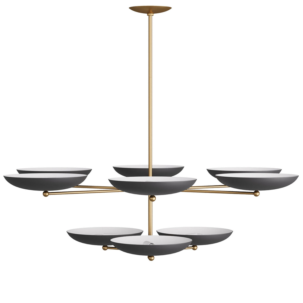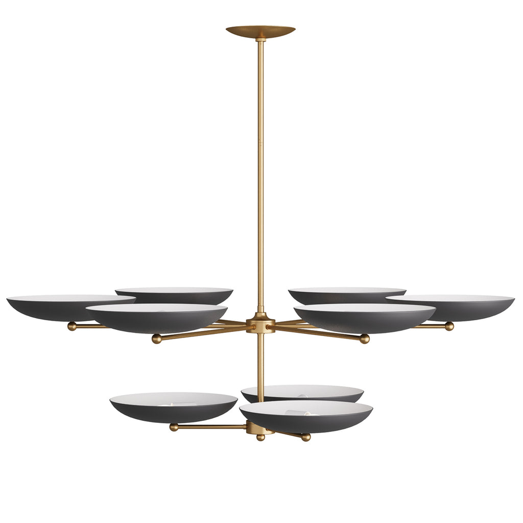 The new Arteriors two-tiered Griffith Chandelier provides a bold presence in any room. Inspired by the grand public spaces of the mid-century era, this architectural chandelier is designed with bronze shades accented by a contrasting antique brass finished steel frame. This fixture’s upward facing plates reflect light, creating a warm, even glow. Damp-rated, although limited covered outdoor conditions may affect finish. Finish will vary.
