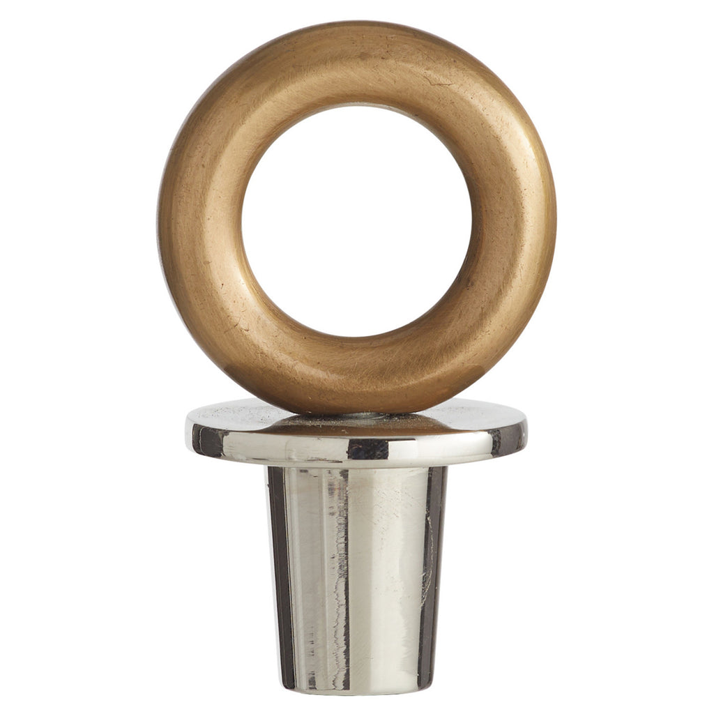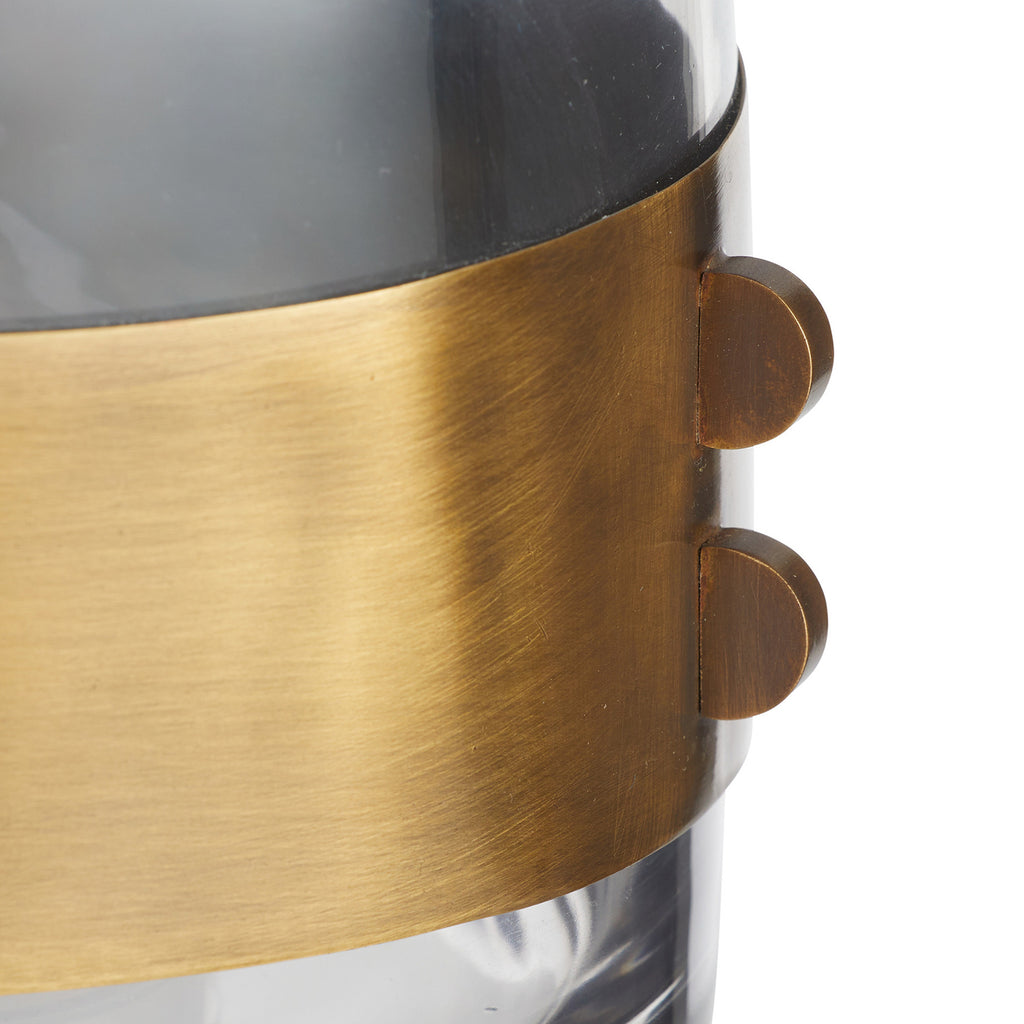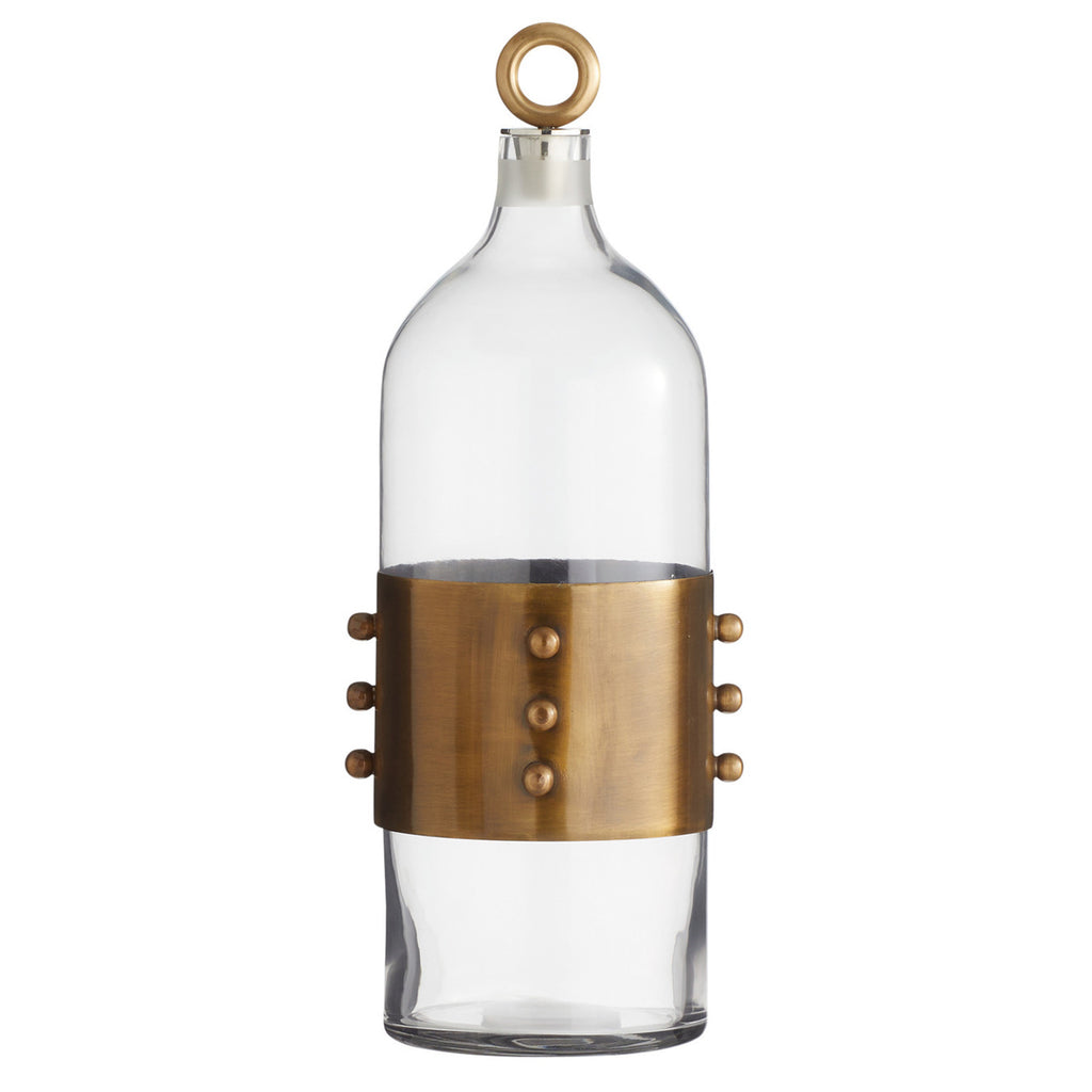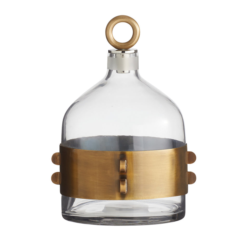 Over-scaled decanters of clear leaded glass are encircled with bold studded cuffs of antique brass and topped with circular stoppers—this growler-shaped duo adds an industrial edge to any bar. Finish will not vary.