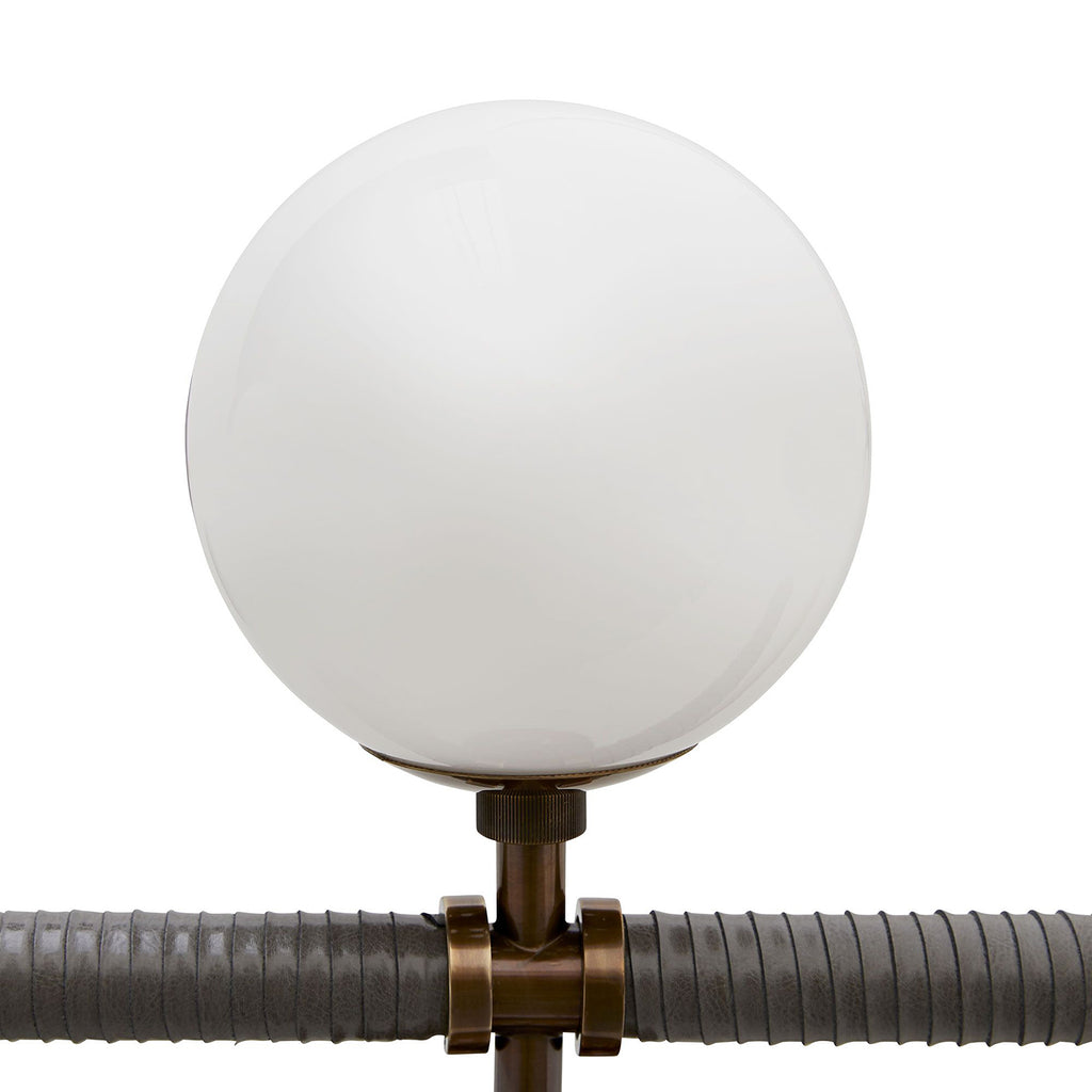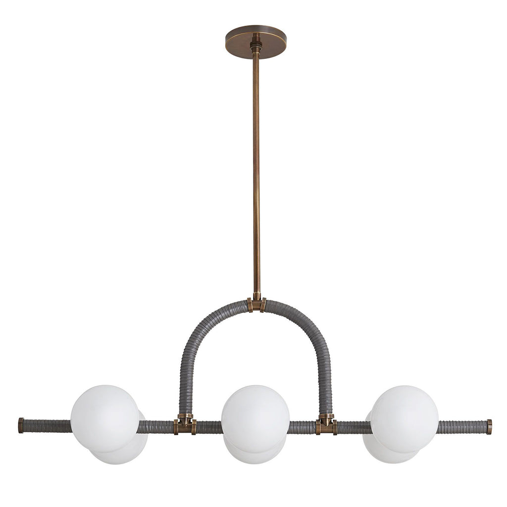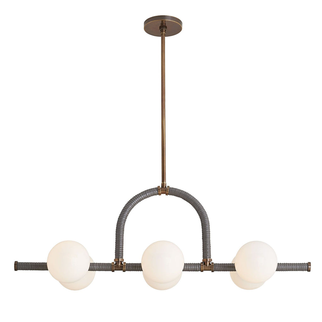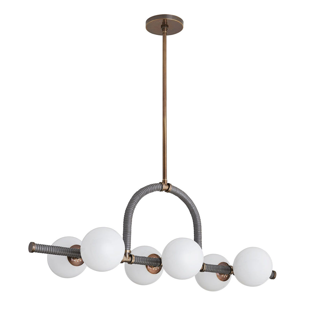 Arteriors Home lighting embodies the perfect balance of form and function, creating an ambiance that is both captivating and inviting. With an emphasis on superior craftsmanship, Arteriors ensures that their chandeliers not only illuminate the room but also make a statement. Minimalist and modern, the Arteriors Harrison is a paradigm of linear lighting. Its lined silhouette presents six opal glass globes and is composed of heritage brass steel that has been wrapped in graphite leather. The middle of the frame features an arch that was inspired by the grand corridors of historic buildings, lending an architectural element to its straightforward design. Finish will vary. Damp rated, though limited outdoor conditions may affect finish.