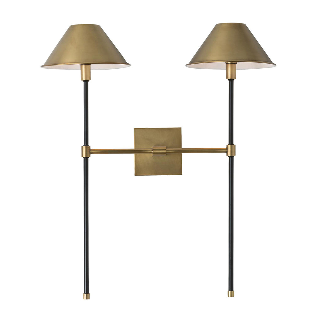 Minimal in visual weight, but heavy in design detail. The Havana sconce is an arresting blend of varying steel finishes. Bronze steel pipes give way to dueling antique brass shades, with matching antique brass details; each shade features a matte white lining. Damp-rated, although limited covered outdoor conditions may affect finish; finish will vary.