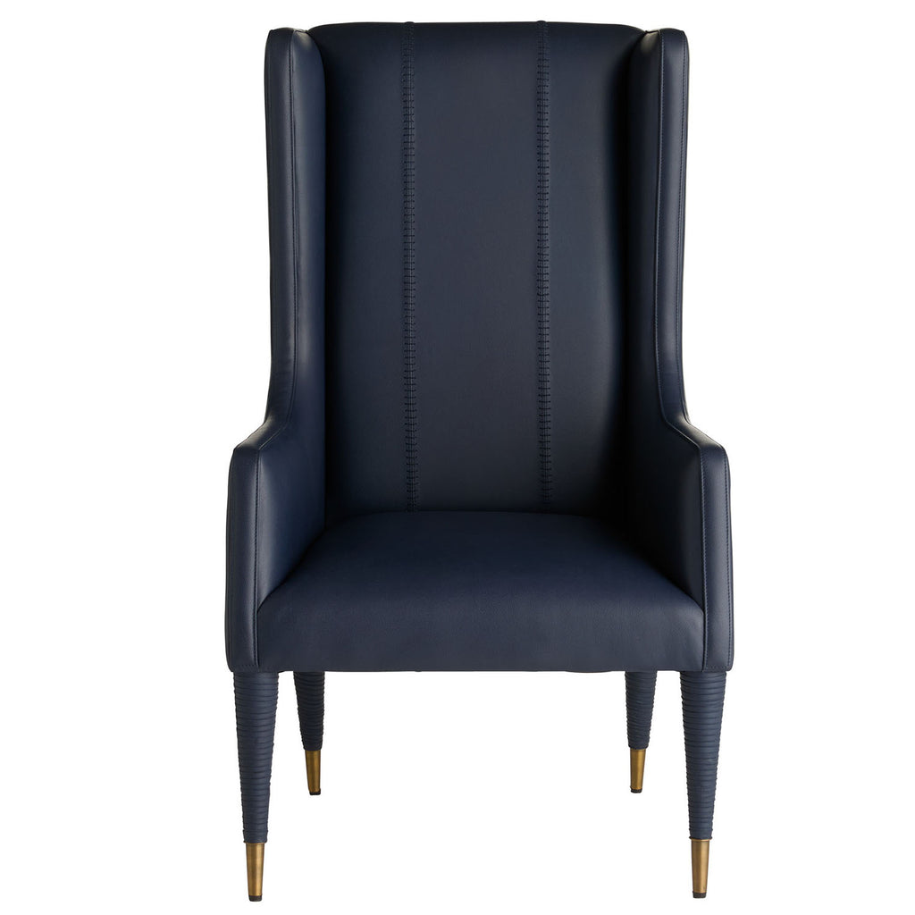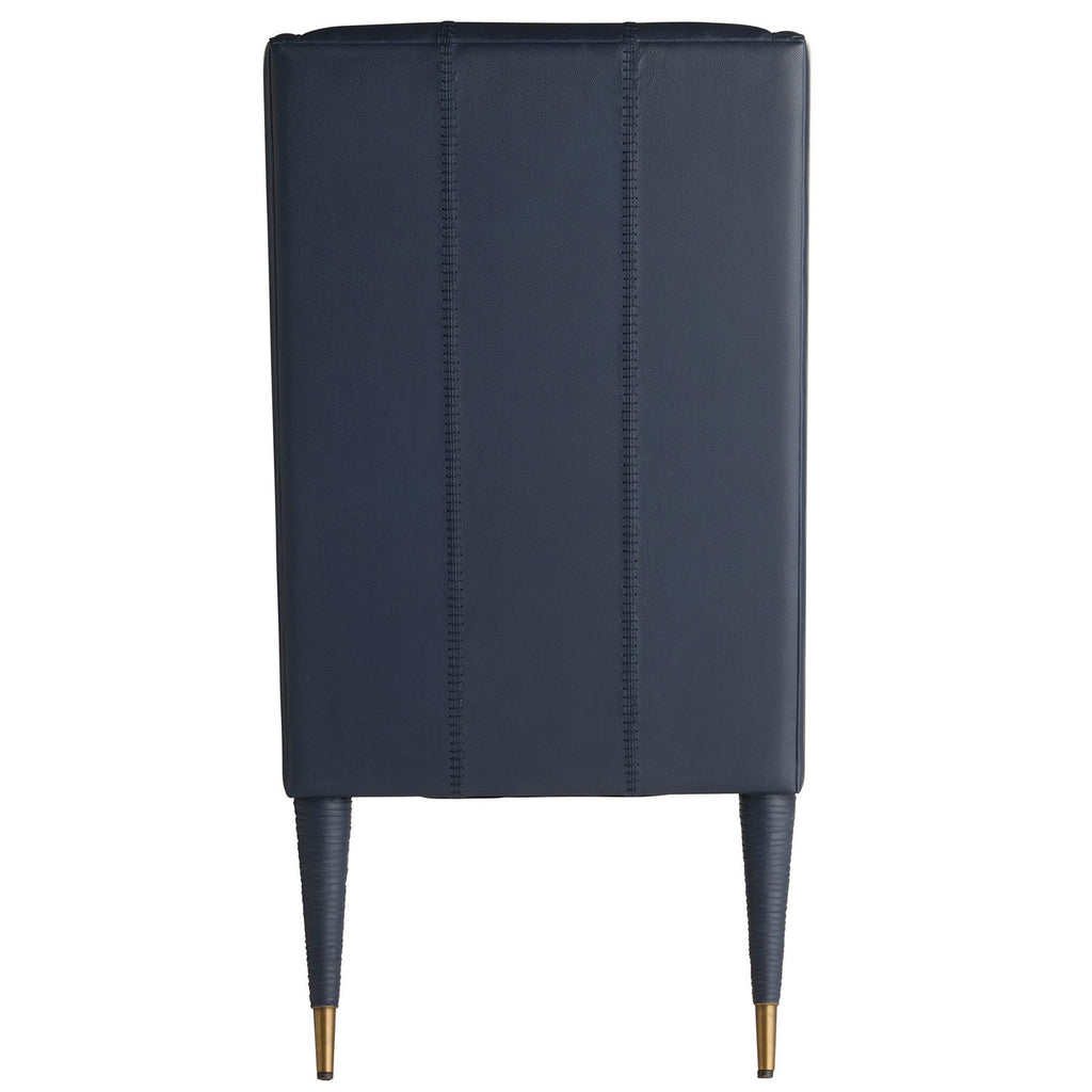 Perfectly scaled for a host or hostess chair, this navy leather chair features race strip paneling and defined topstitching. Each exaggerated tapered leg is wrapped in leather cord and tipped with an antique brass ferrule. Stitching continues at the back so this piece can float within the room. Leather will vary.