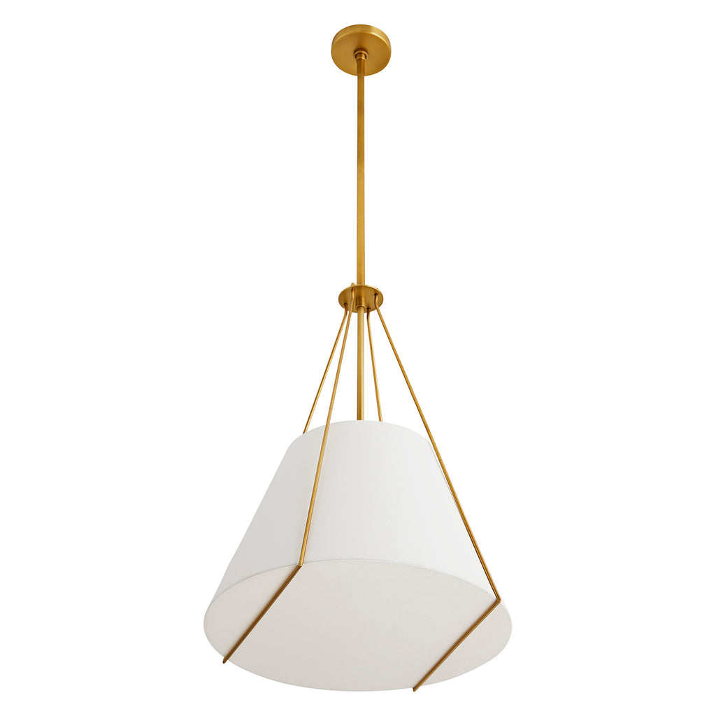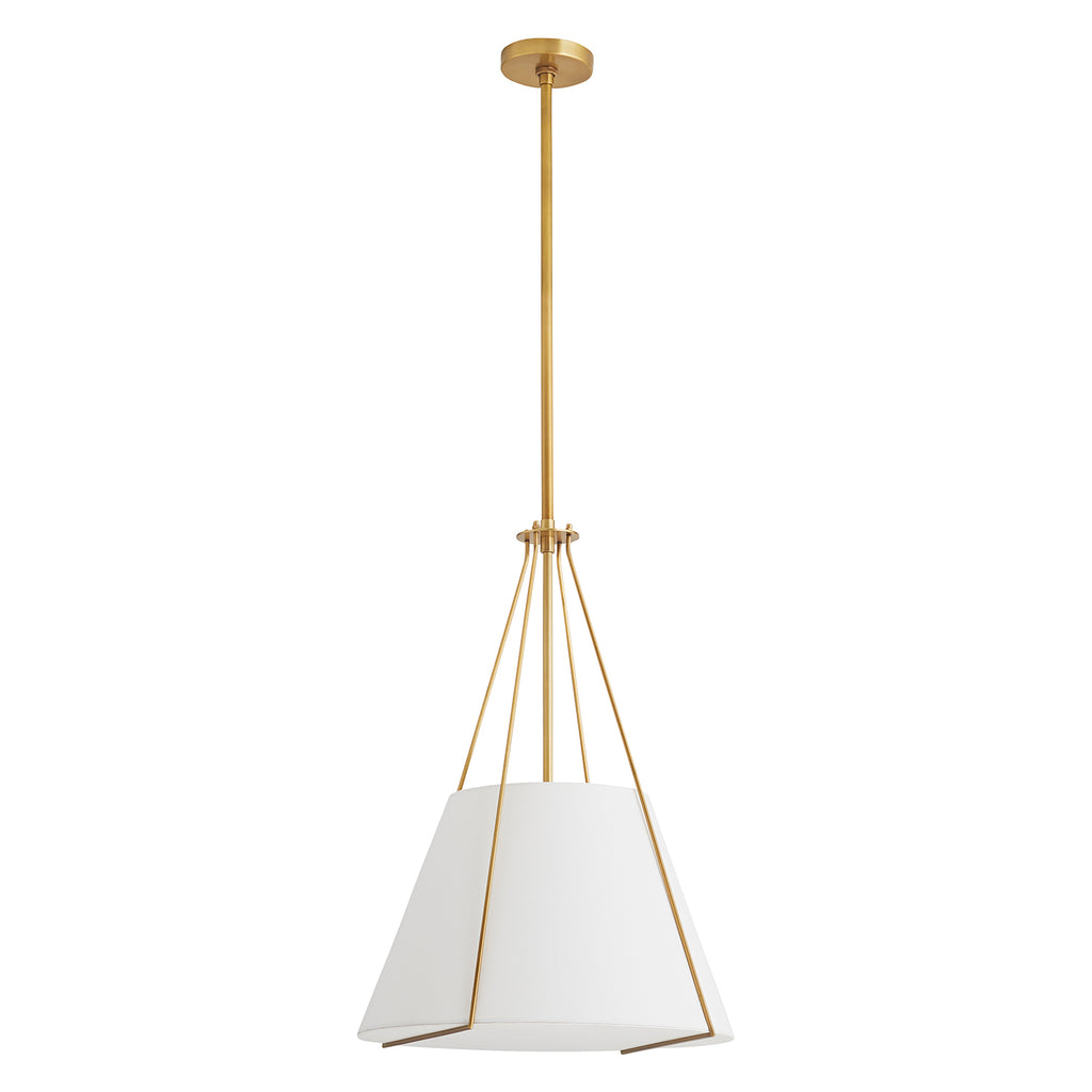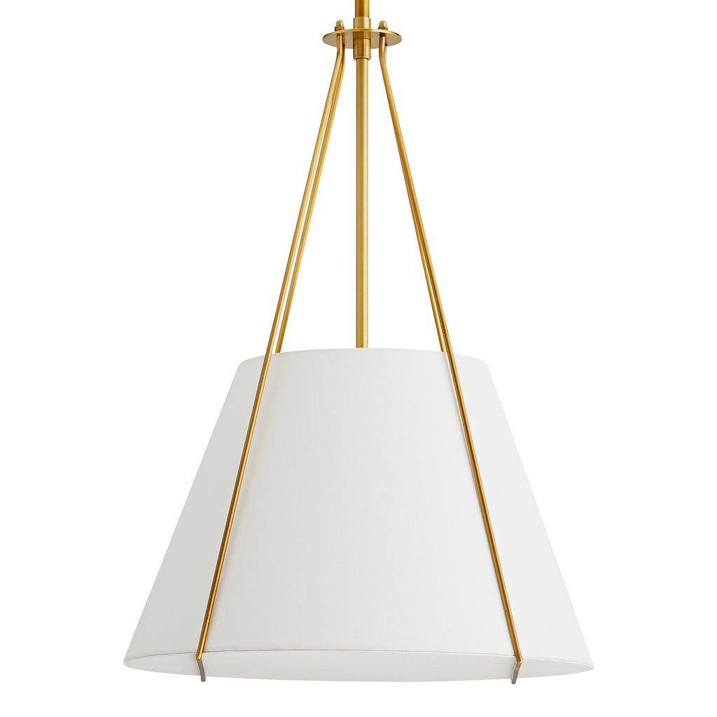 Arteriors Home lighting embodies the perfect balance of form and function, creating an ambiance that is both captivating and inviting. From sleek and minimalist lighting to more ornate and intricate fixtures, the Arteriors Home pendants offer something for every taste and style. Finding a balance between modern and traditional elements, the Arteriors Heloise creates architectural interest. A classic conical white linen shade is suspended within an antique brass steel frame to contemporize the look. When in use, the iron detail on the bottom of the shade plays on its architectonic appeal by creating an interesting lightscape. We see this hung in multiples over a kitchen island or breakfast nook table.
