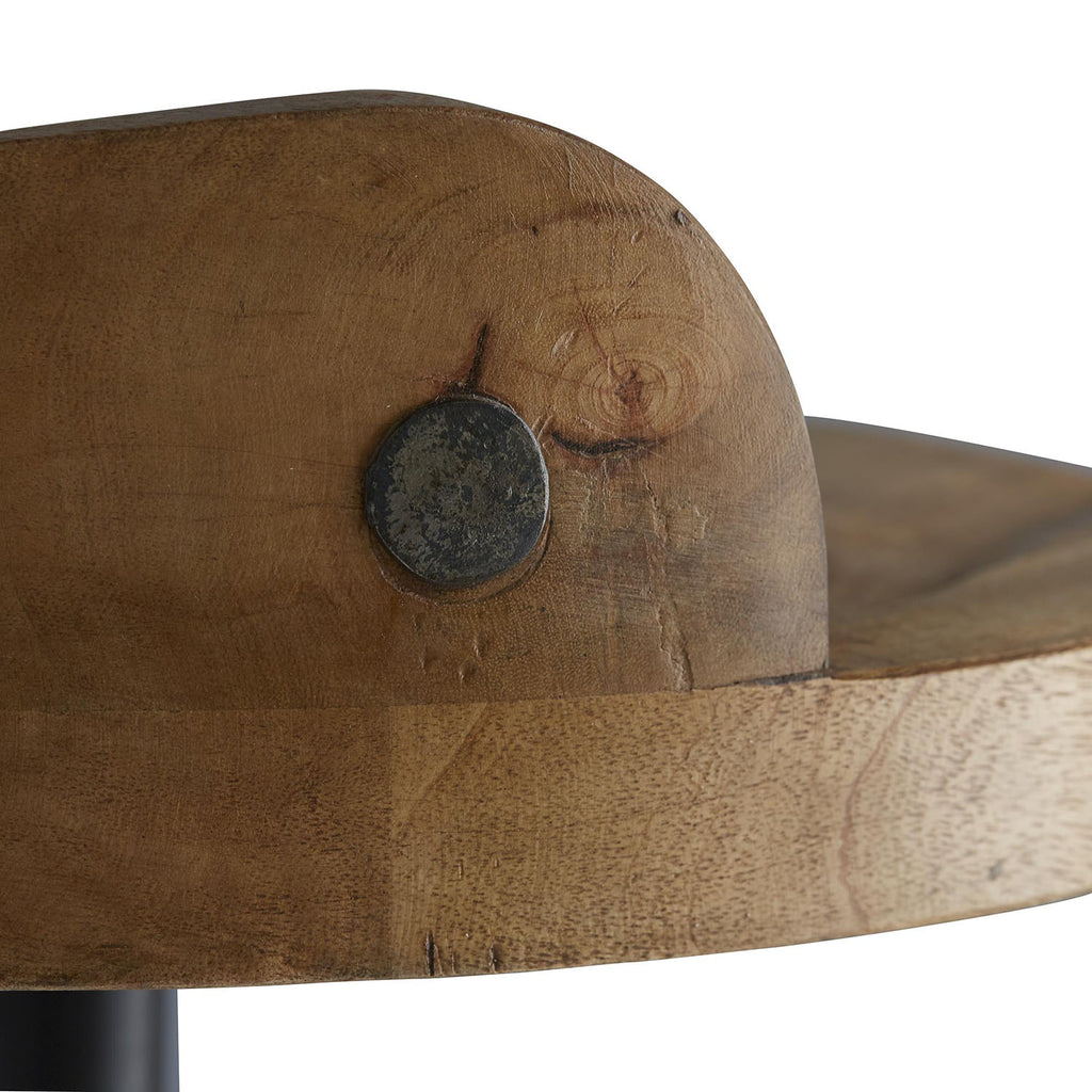Rustic counter stool features sandblast antique waxed wooden swivel seat and natural iron base. Seat height is fixed. Support bar placement may vary up to 1".