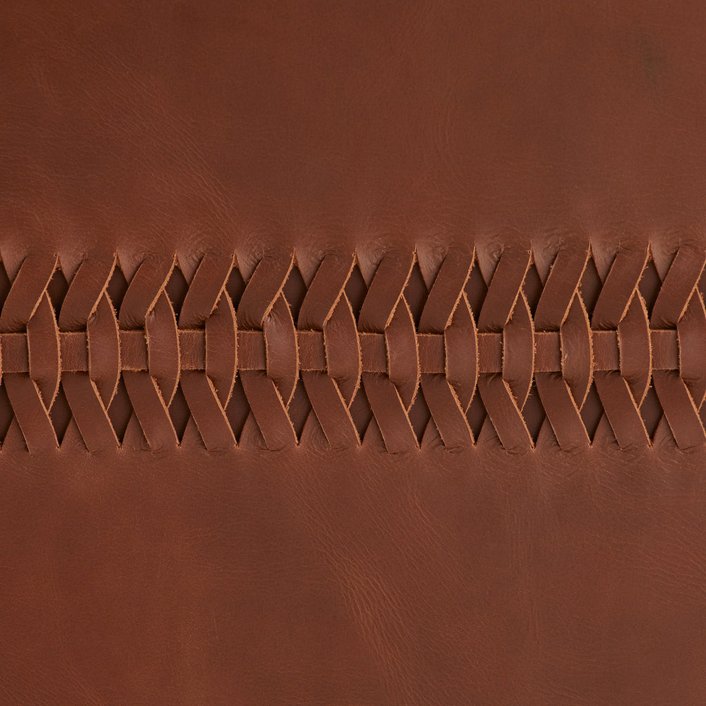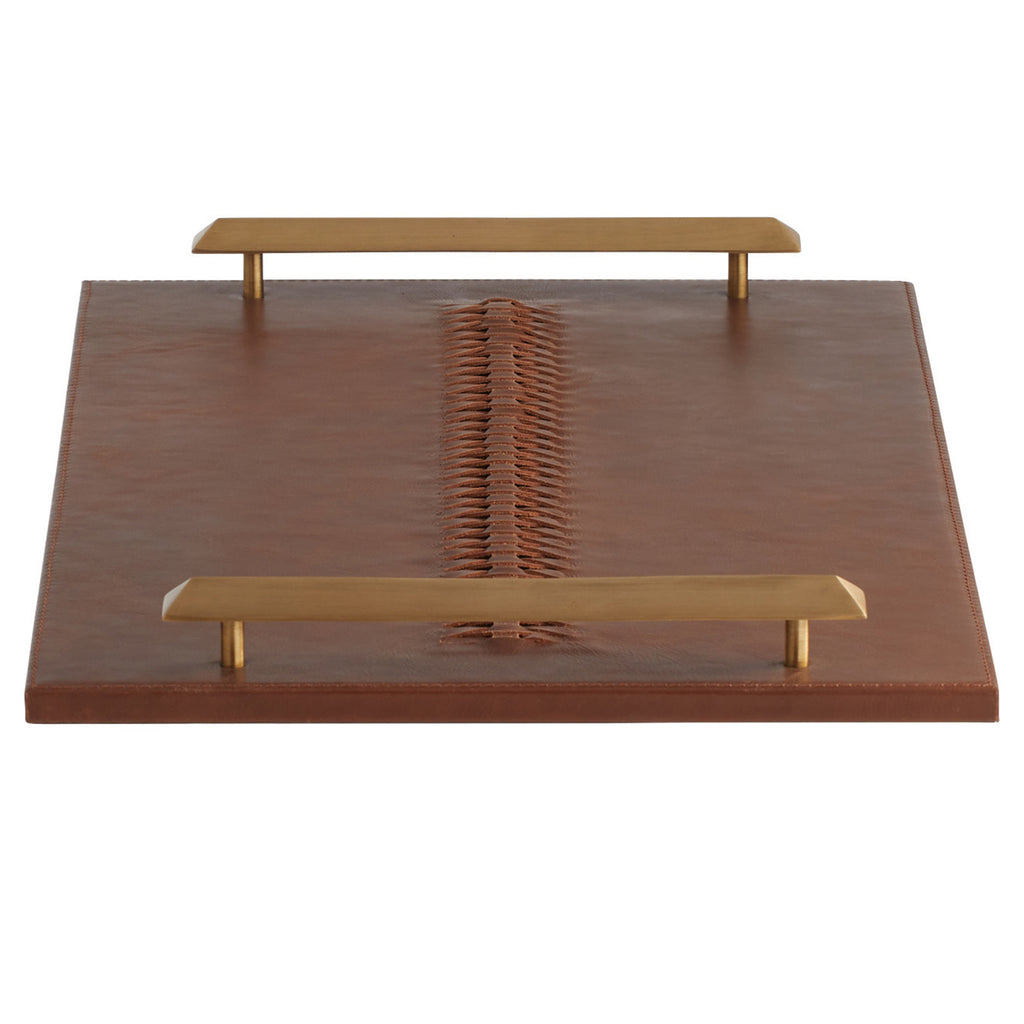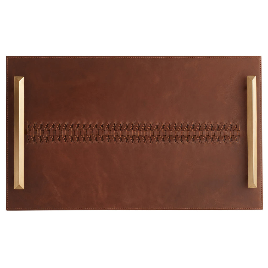 A tray of deep russet leather is bisected with a braided fishtail spine, resembling the lacing on a corset, and accented with sturdy antique brass handles at either end. Finish will vary.