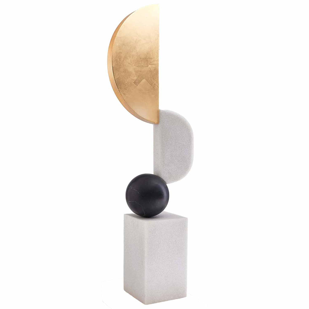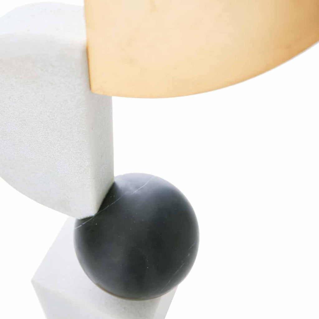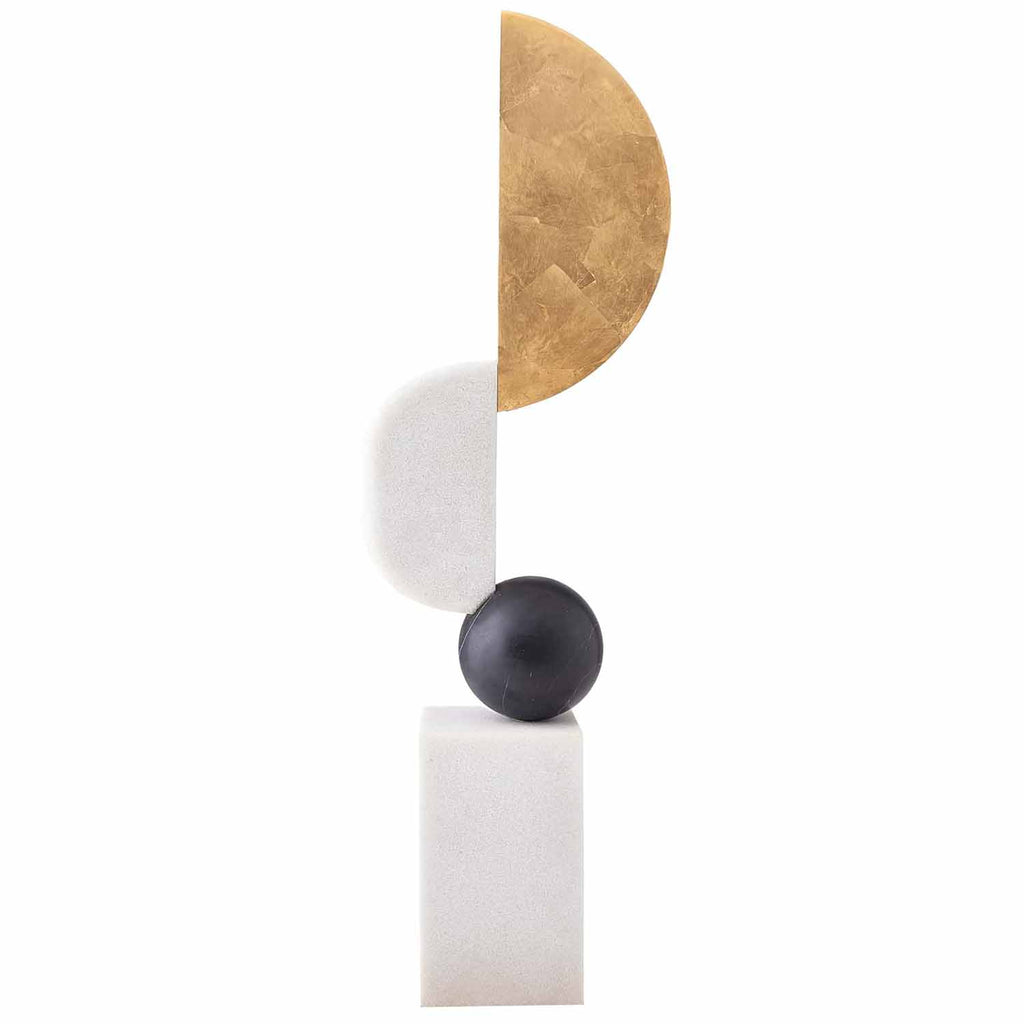 Arteriors Home brings sophistication and style to any interior design project with their collection of decor and tabletop pieces. The modern Hiroshi floor sculpture nods to the geometry found in cubist art. Showcasing a rich, contrasting mix of materials, the Hiroshi floor sculpture balances antique brass and ivory ricestone composite half-moon shapes against a black marble sphere and a ricestone composite pedestal base. This dynamic statue renders a true contemporary art conversation piece. Finishes will vary.