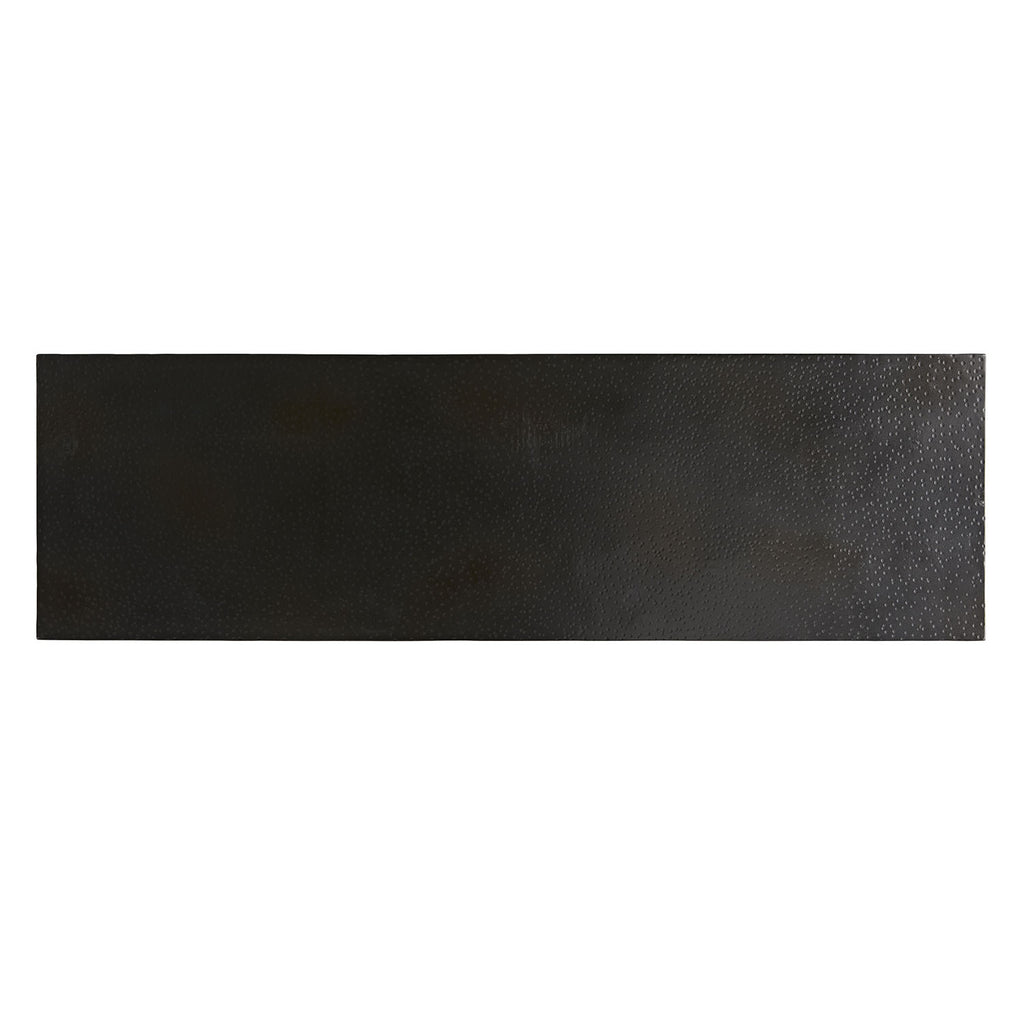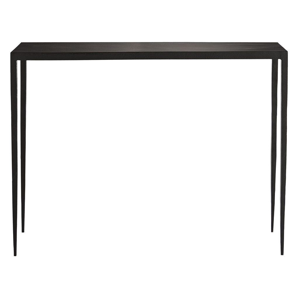 Simple and stylish—this large console is fashioned from hand-hammered solid iron for a textured industrial frame. Its ultra-thin top flows into slightly tapered legs that appear delicate yet provide exceptional stability. Visually lightweight, it offers an airy aesthetic. Finish will vary.