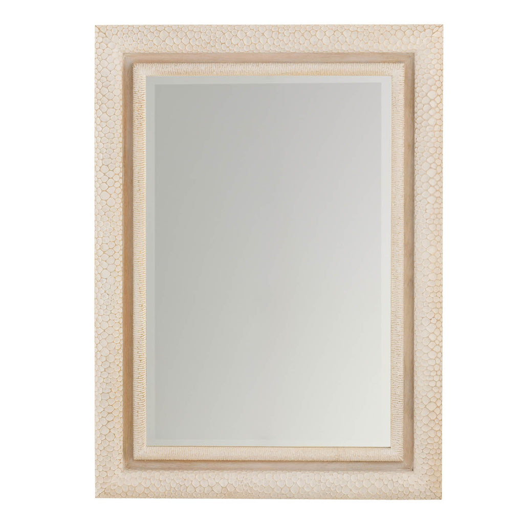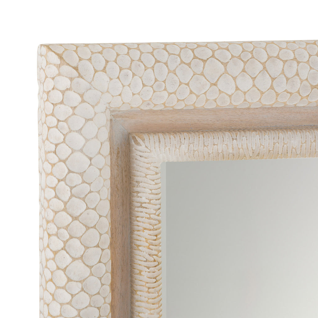 The organic pattern of a tree trunk guided our artisans’ carving to create the textural mix of the Indo. Crafted of whitewashed mango wood, this recessed frame offsets a beveled mirror. Designed to be displayed vertically only by a back cleat. Hanging hardware included; finish will vary.