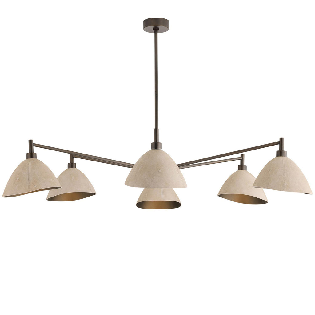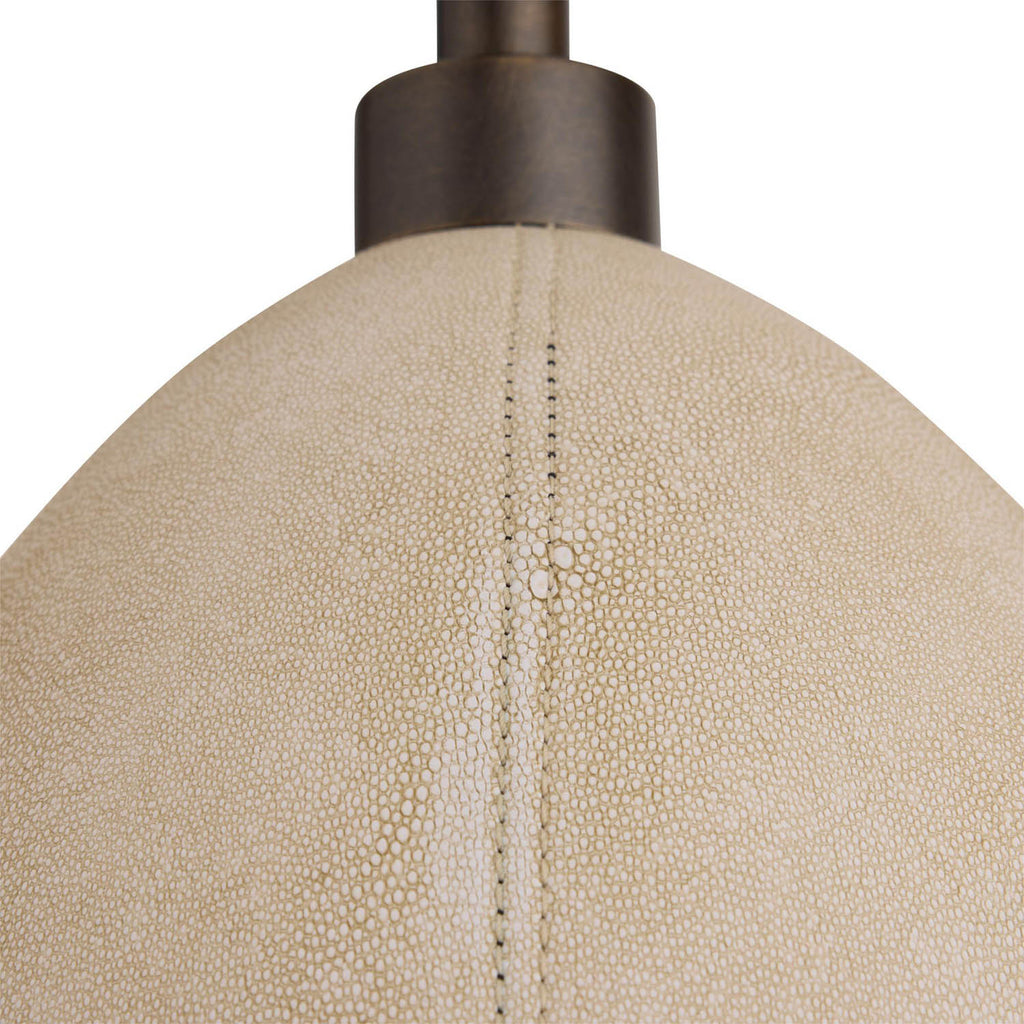 Faux shagreen leather is carefully shaped and stitched to form the shades of the Inlet. Embossed with a shagreen stingray texture, the ivory domes suspend from a linear arm of English bronze steel. A leather cap centers the base of this dynamic style. A dramatic accessory that pairs beautifully with the matching Inlet Sconce. Damp-rated, though limited covered outdoor areas may affect finish; finish will vary.