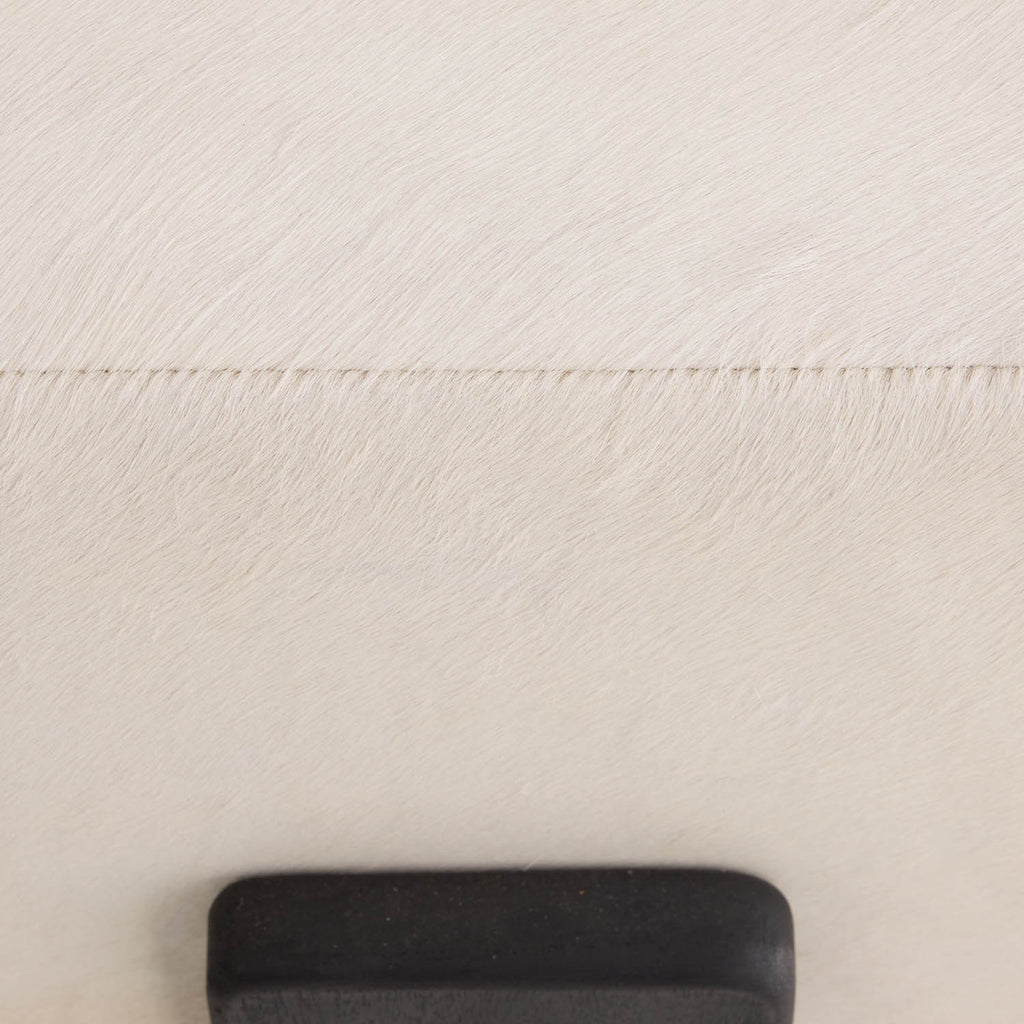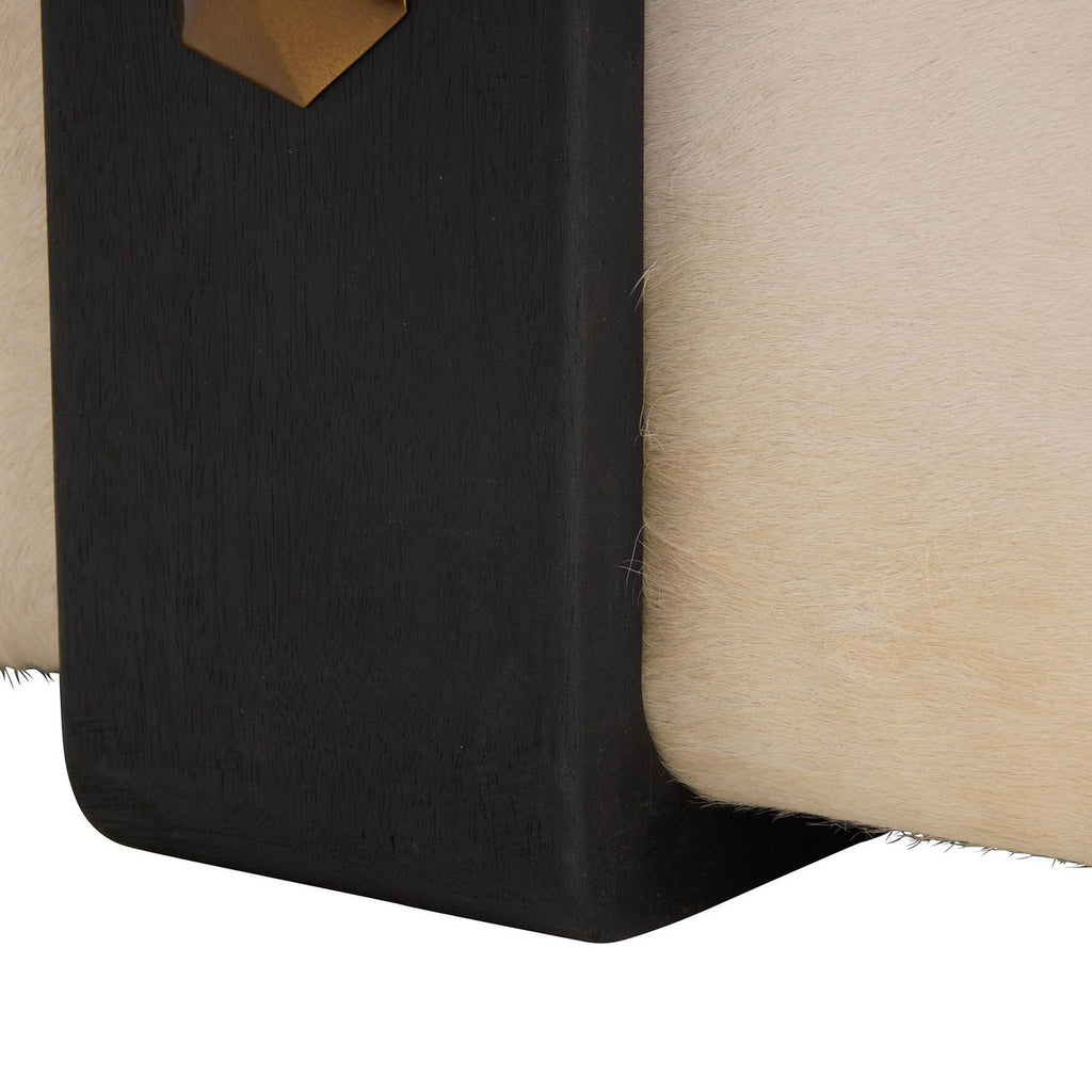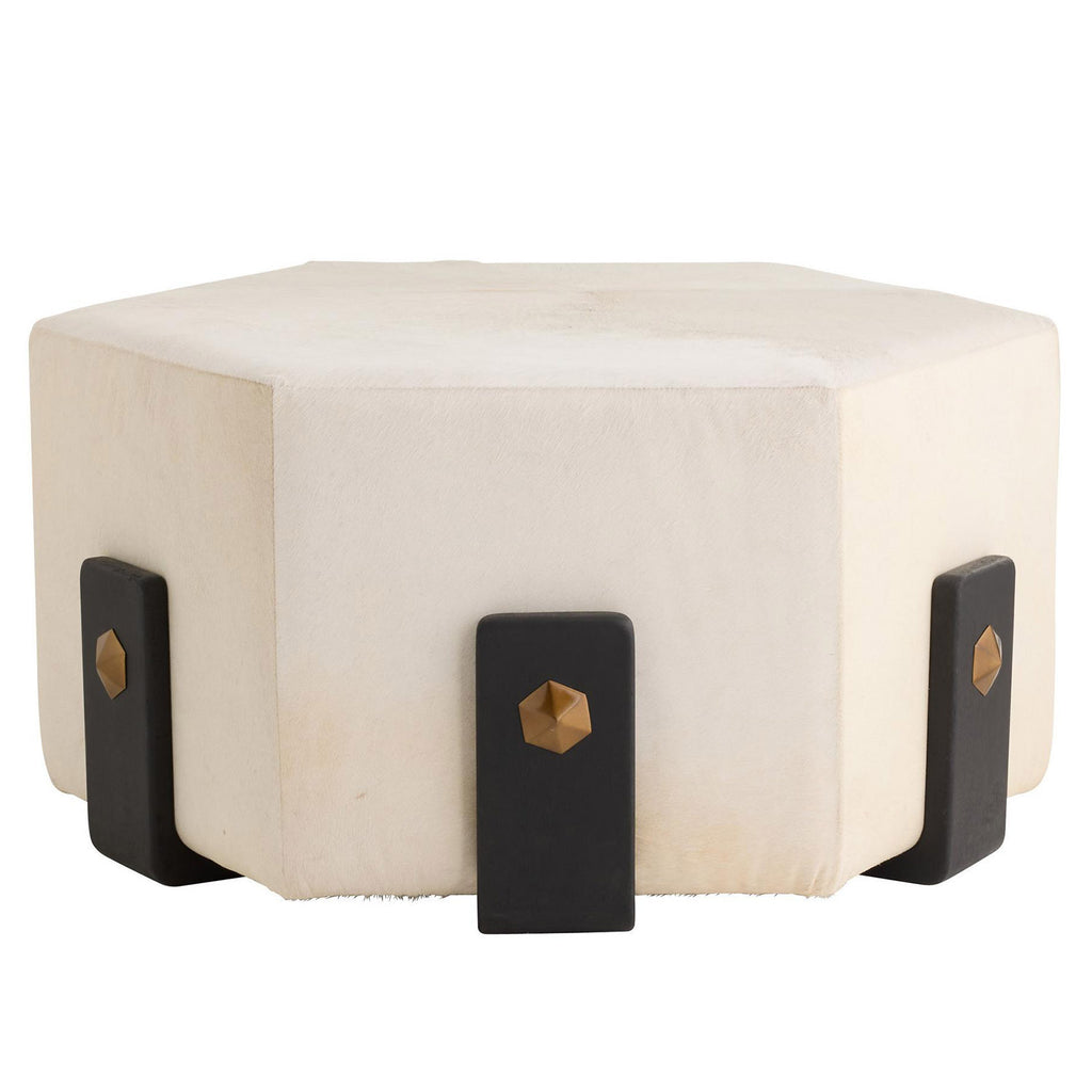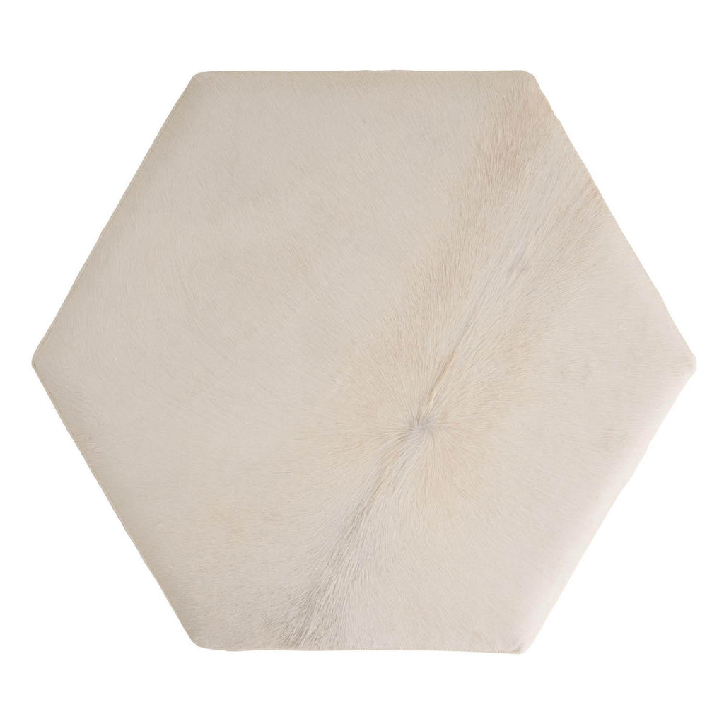 Crafted of sumptuous white hair-on-hide, this hexagonal ottoman makes a sophisticated addition to any cocktail seating arrangement. Bracketed by clasps of ebony mango wood accented with antique brass hardware, each piece is unique, as the spine of the hide will never fall in the same place twice. Finish will vary.
