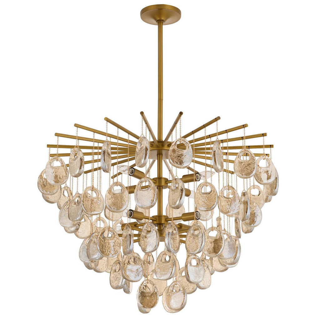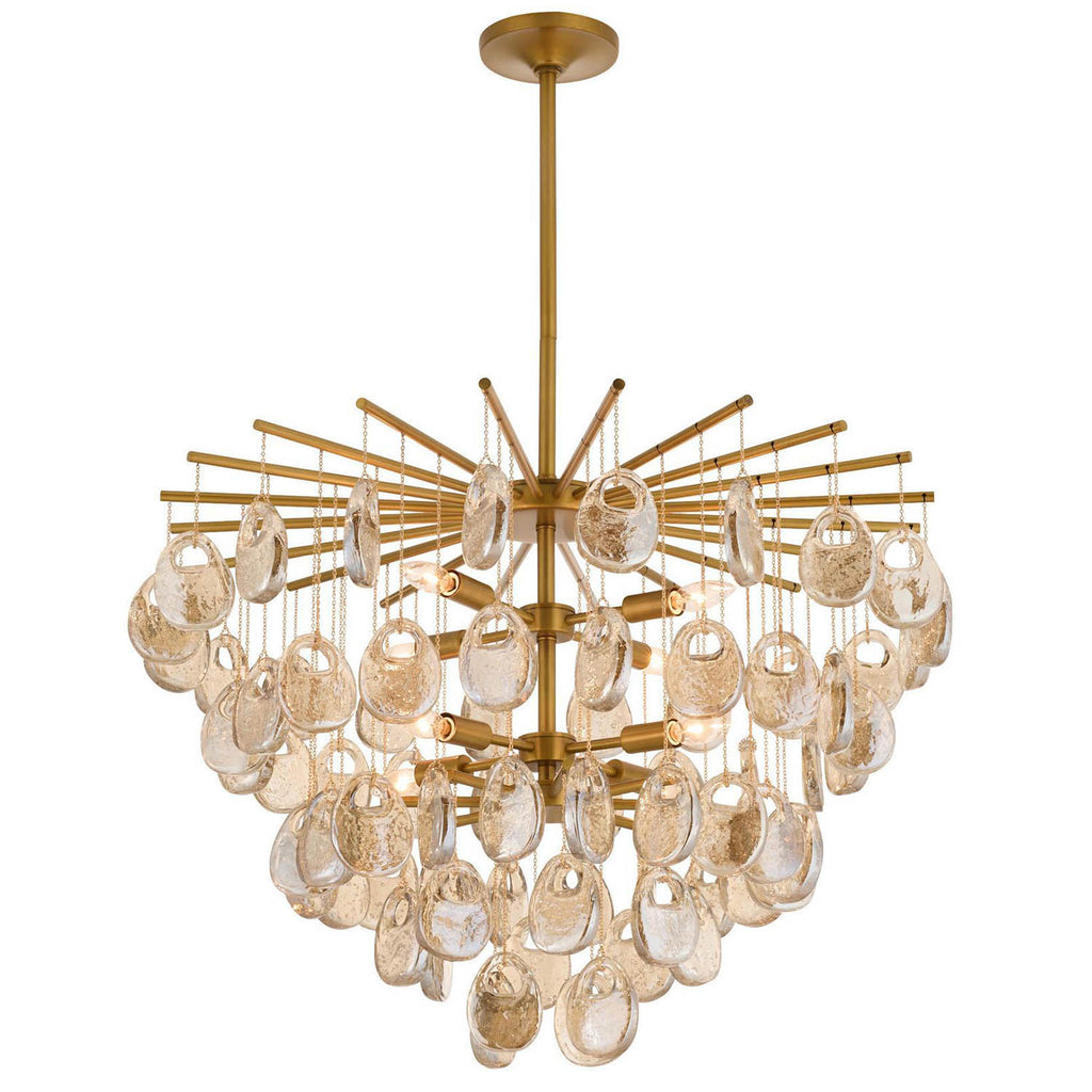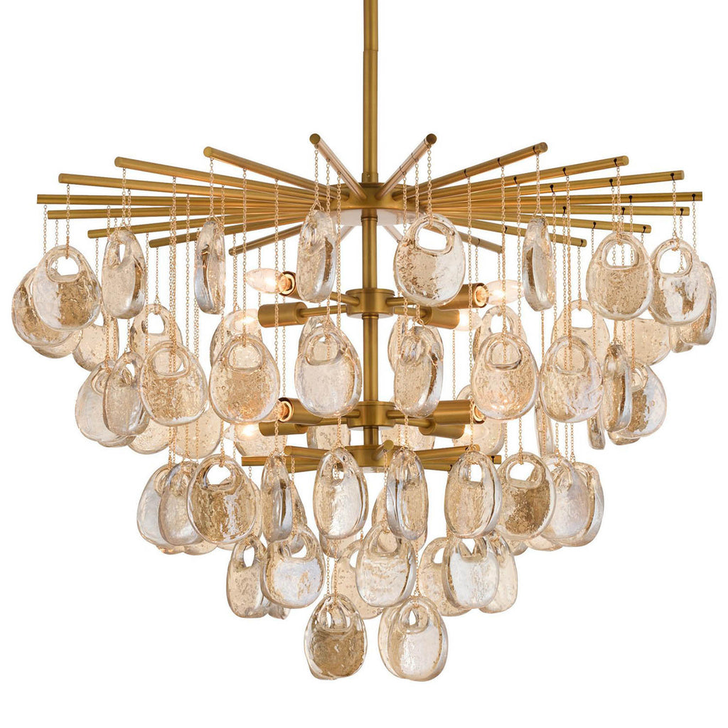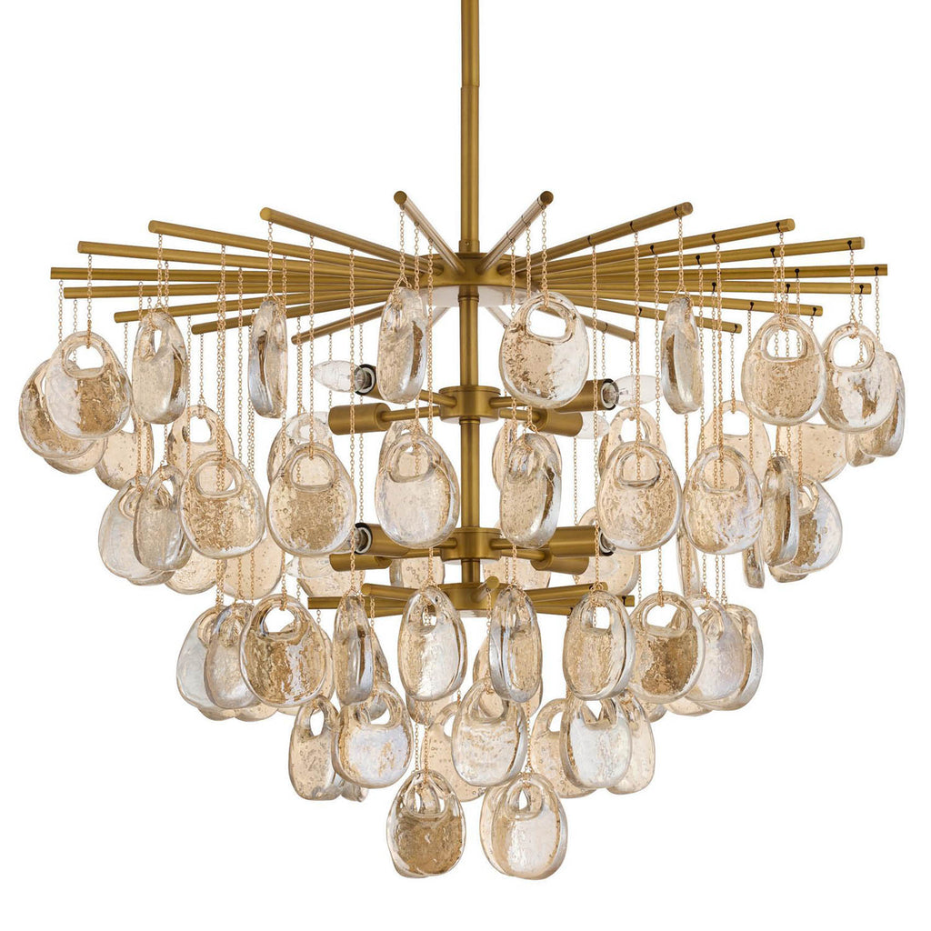 Round amber seedy glass drops are suspended in a cascading, wind-chime–inspired silhouette from an armature of antique brass-plated steel. Inspired by a handbag, each glass shape is supported by a sturdy chain threaded through its “handle,” creating a dazzling refractive effect. Damp-rated, though limited covered outdoor exposure may affect finish; finish will vary.