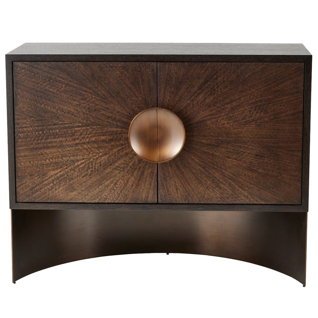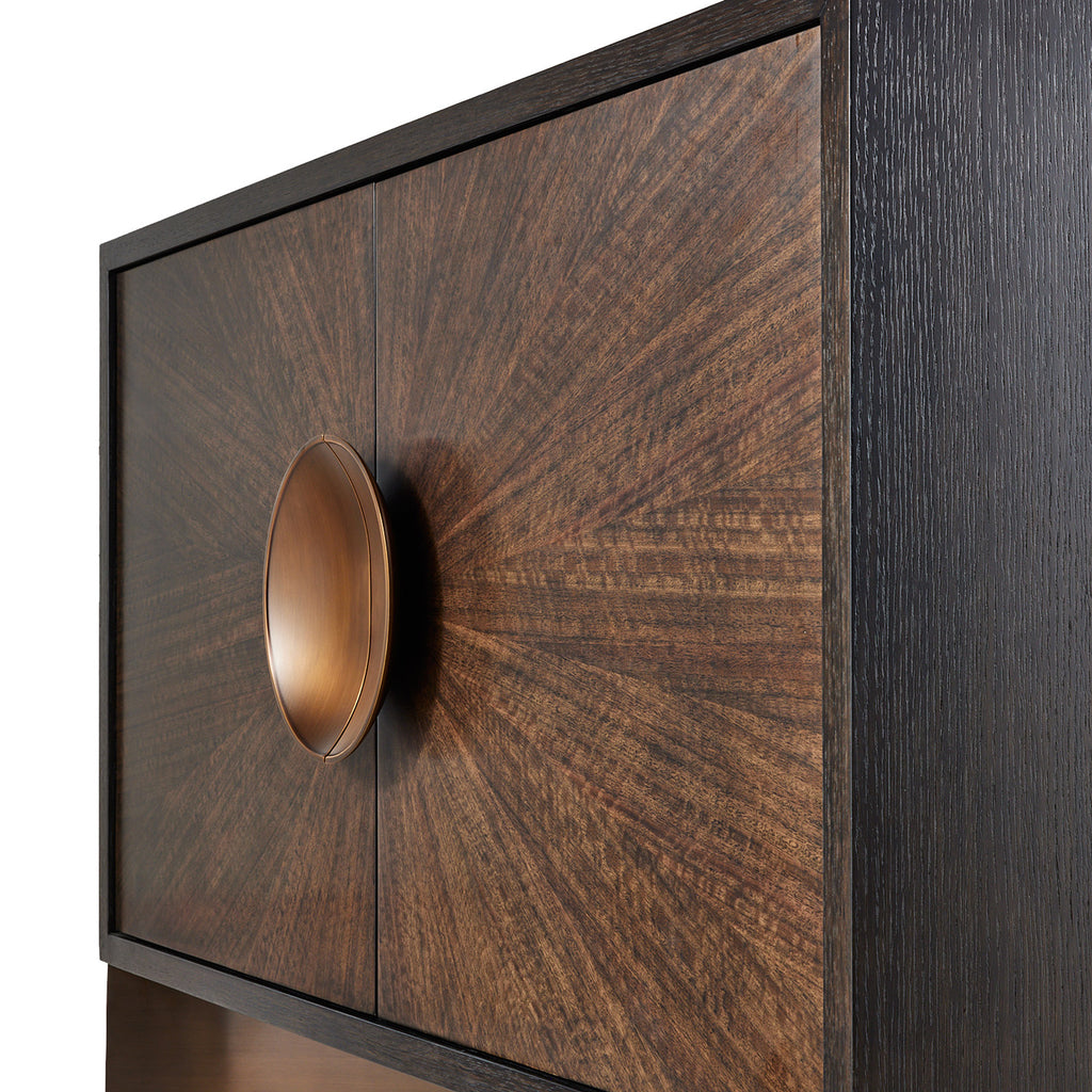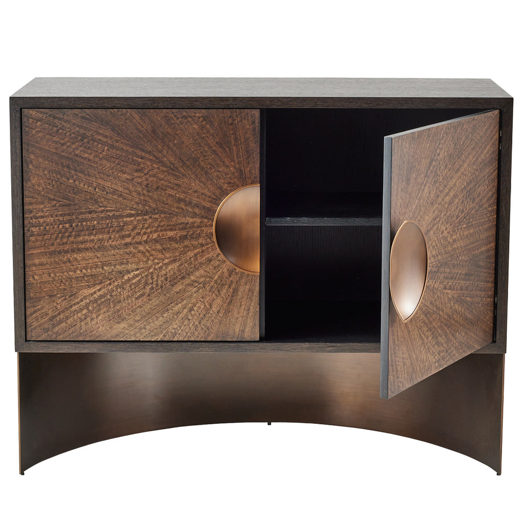 Darkly luminous, our sable oak veneer cabinet’s doors are accented with dual iron antique brass pulls. Adorned in a deco-inspired radial eucalyptus veneer pattern in a brindle finish, this style draws the eye wherever it is placed. The flowing metal planes of its rounded base lends an airy yet grounded quality to this essential piece. Single adjustable shelf. Finish will vary.