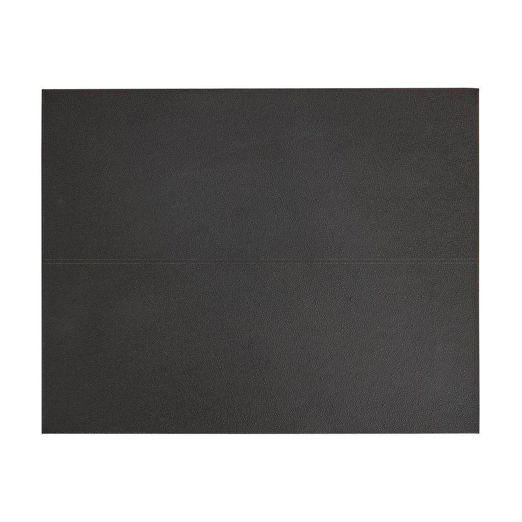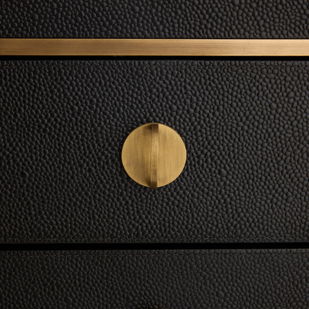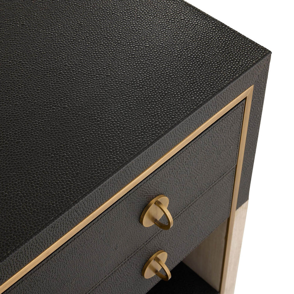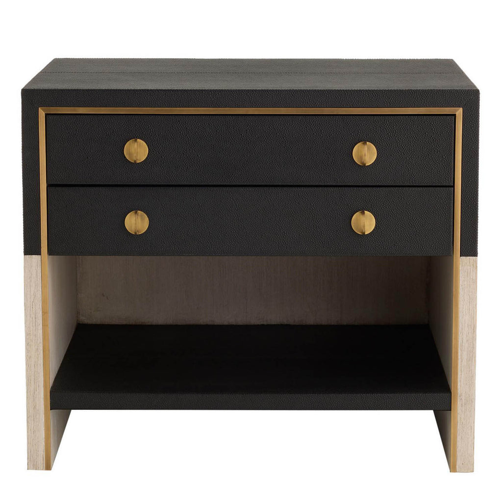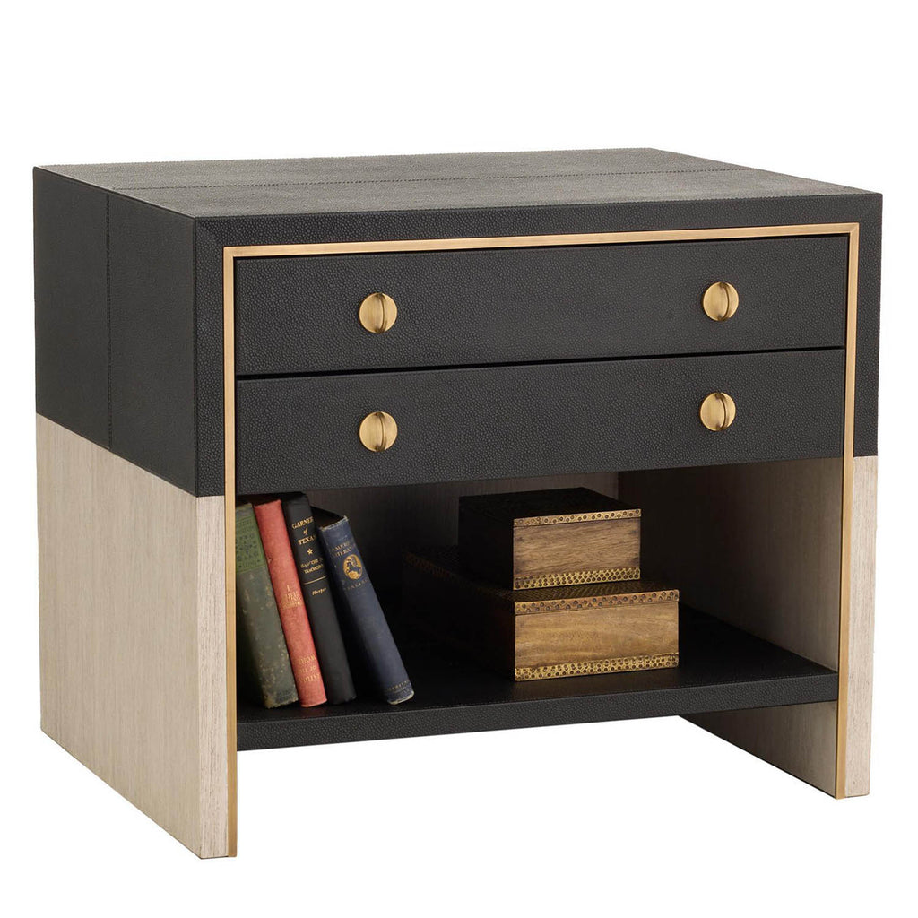 A modern mix of materials elevates our sophisticated side table. The smoke oak wood waterfall case is juxtaposed with luxe black embossed leather on the top and front, with stitched details to highlight the black shagreen. Punctuated by antique brass inlay and delicate pulls, this handsome piece features two soft-close drawers and an open shelf for essentials. Finish will vary.