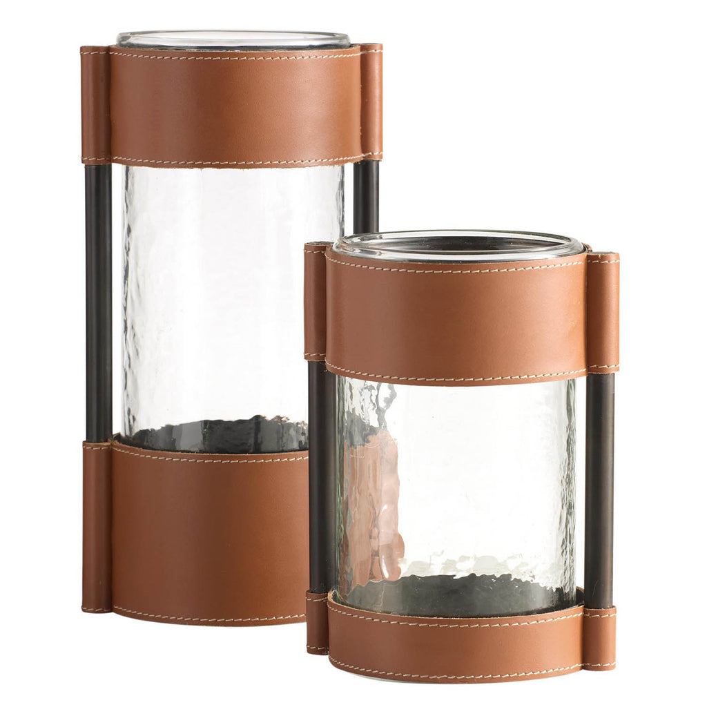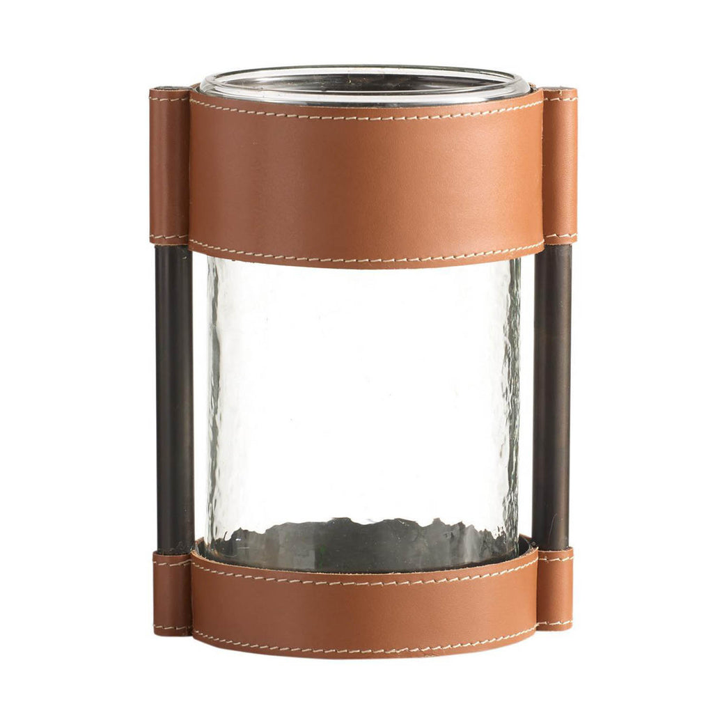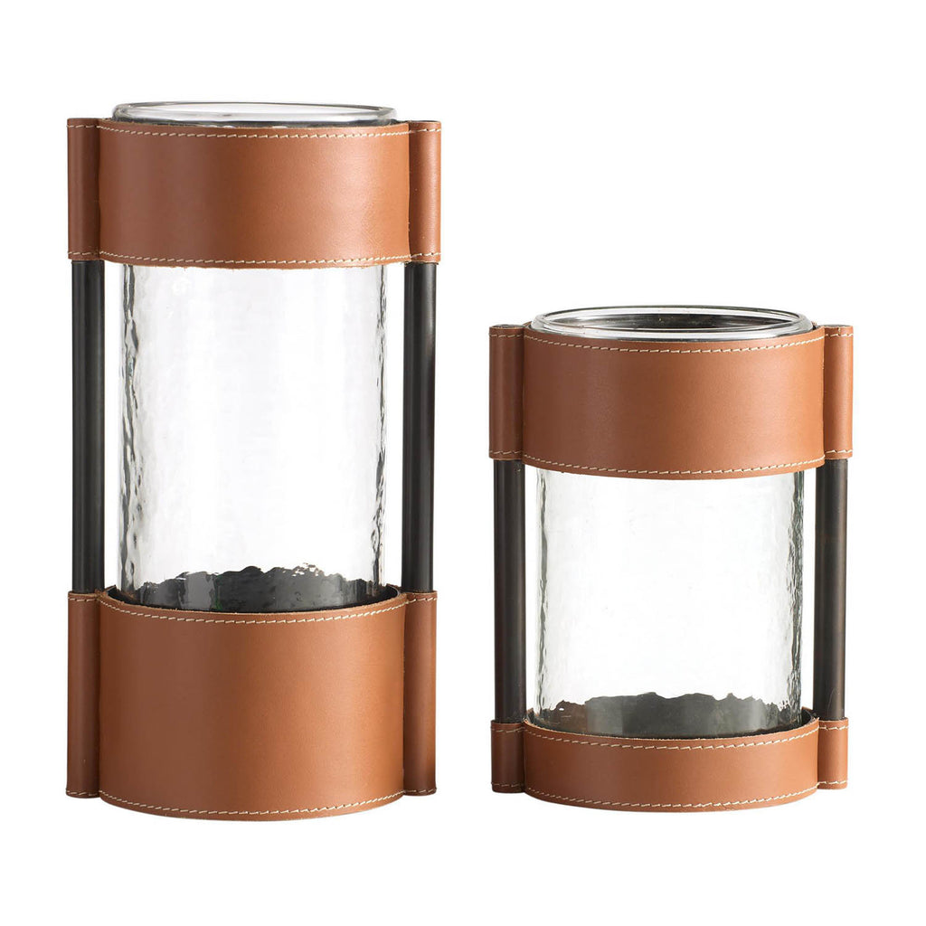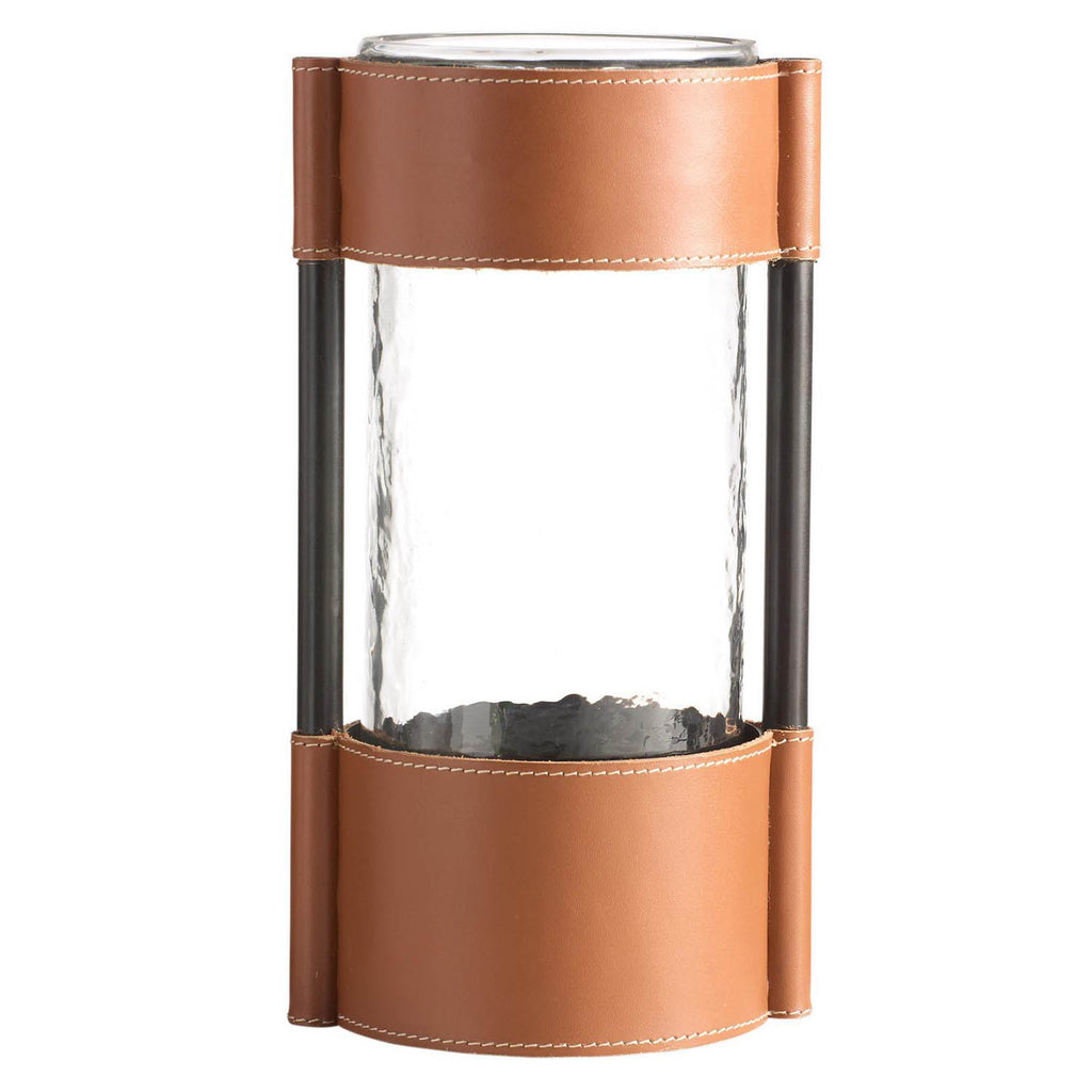Drawing from the iconography of the equestrian set, a pair of clear hammered glass vases are suspended in brown leather settings. Topstitched and held by bronze iron supports, the staggered heights create visual interest. The watertight cylinders are removable for cleaning. Finish will vary.