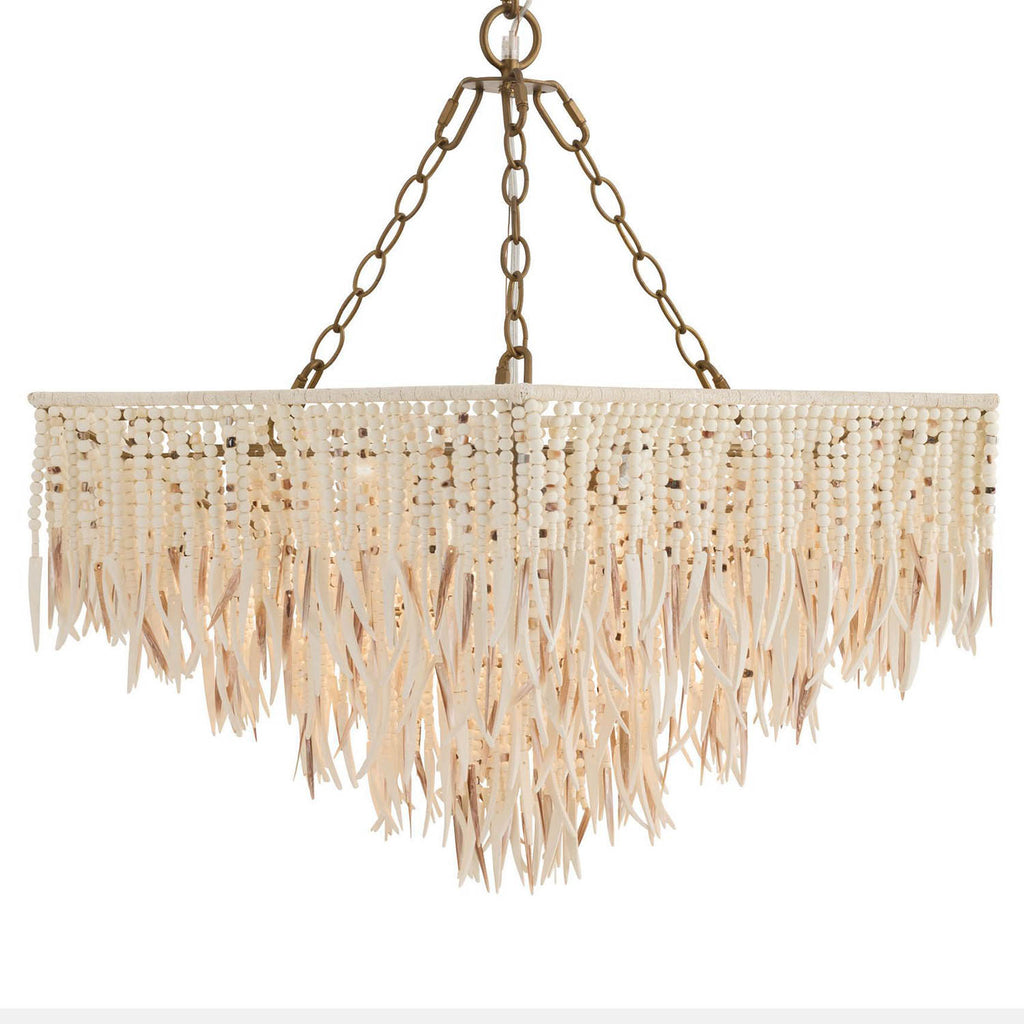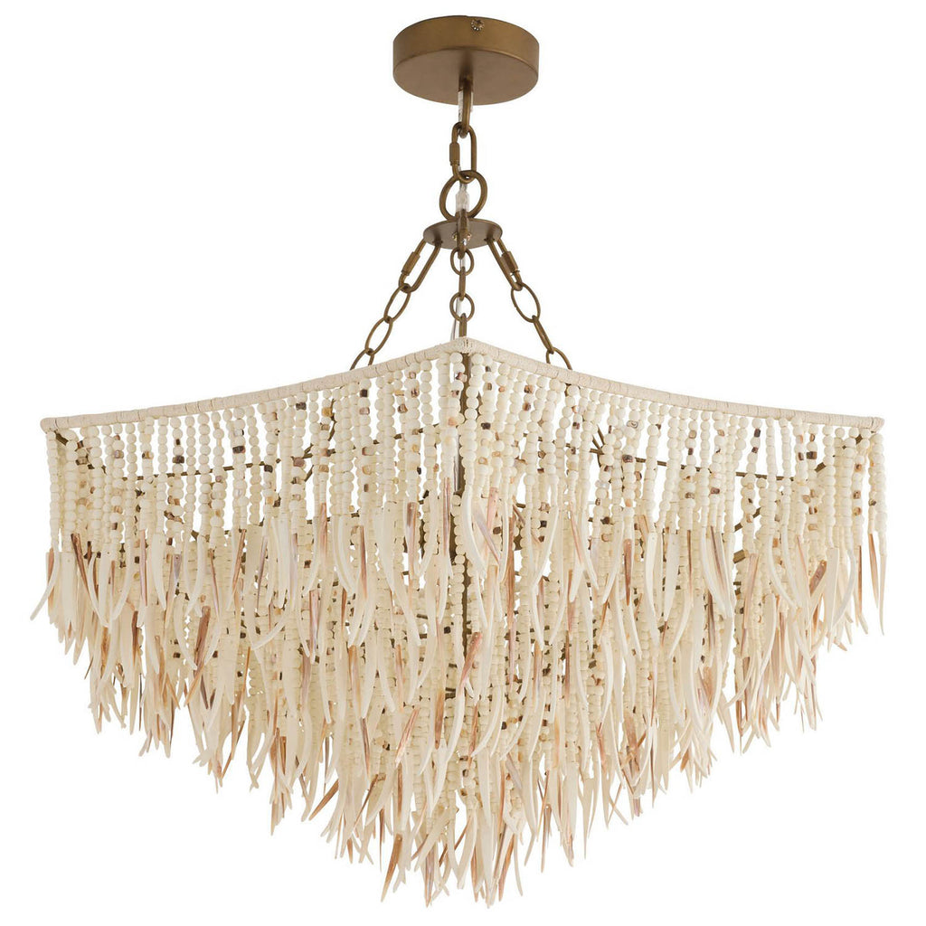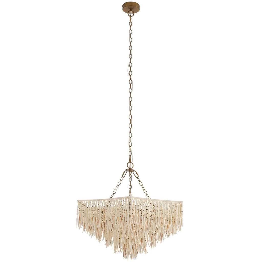 Like a fringed skirt, strands of natural mother-of-pearl shell, white wooden beads and ivory coconut shell give the feeling of movement to our scalloped fixture. Suspended on an umbrella framework, this exotic style's mix of materials assures an added glimmer when illuminated. Hung from chains of antique brass-plated iron, it can also be displayed as a semi-flush fixture. Finish will vary.