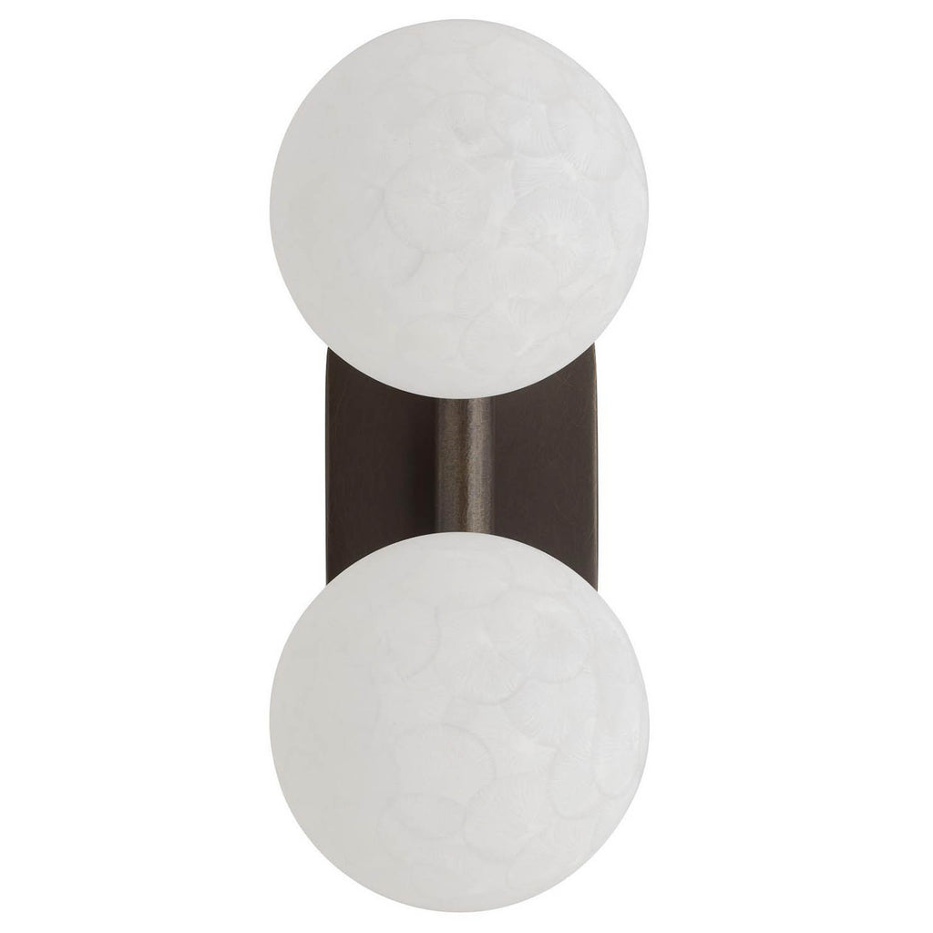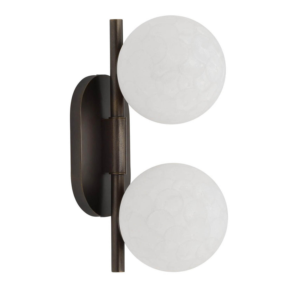 Like the moon orbiting around a planet, double globes of matte white textured glass offer a lunar allure. Finished with a stony coral texture, this clever celestial-inspired fixture's globes can be rotated left or right to deliver light where it is needed most. Mounted on a backplate of English bronze-plated steel. Certified for damp locations and intended for interior use; finish will vary.