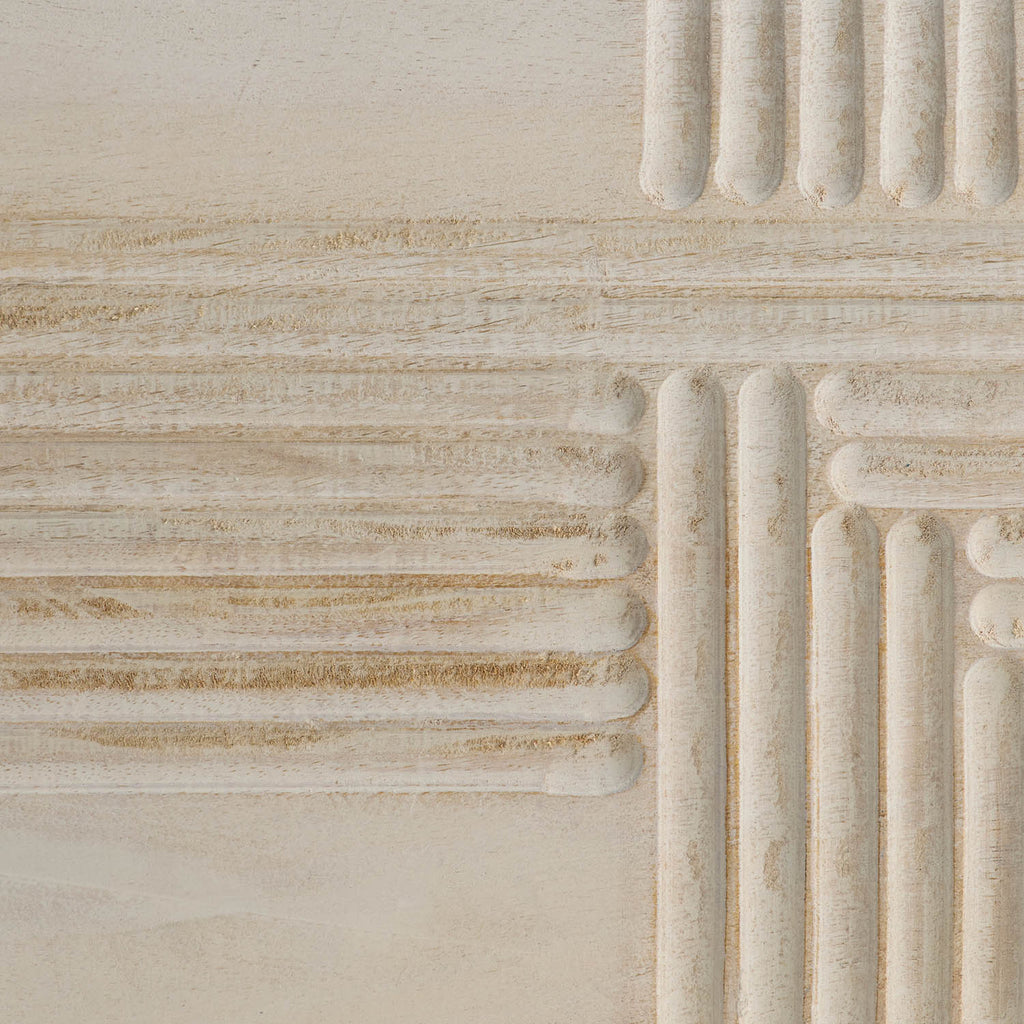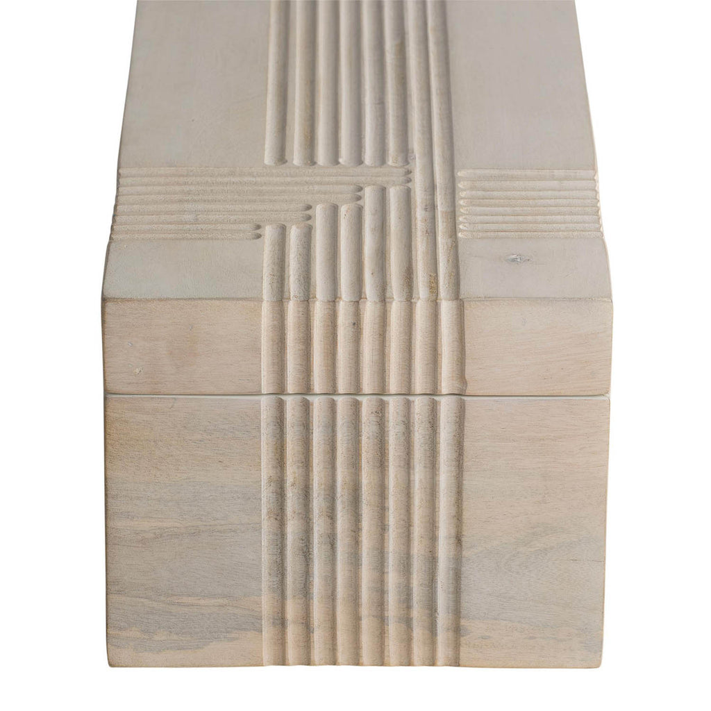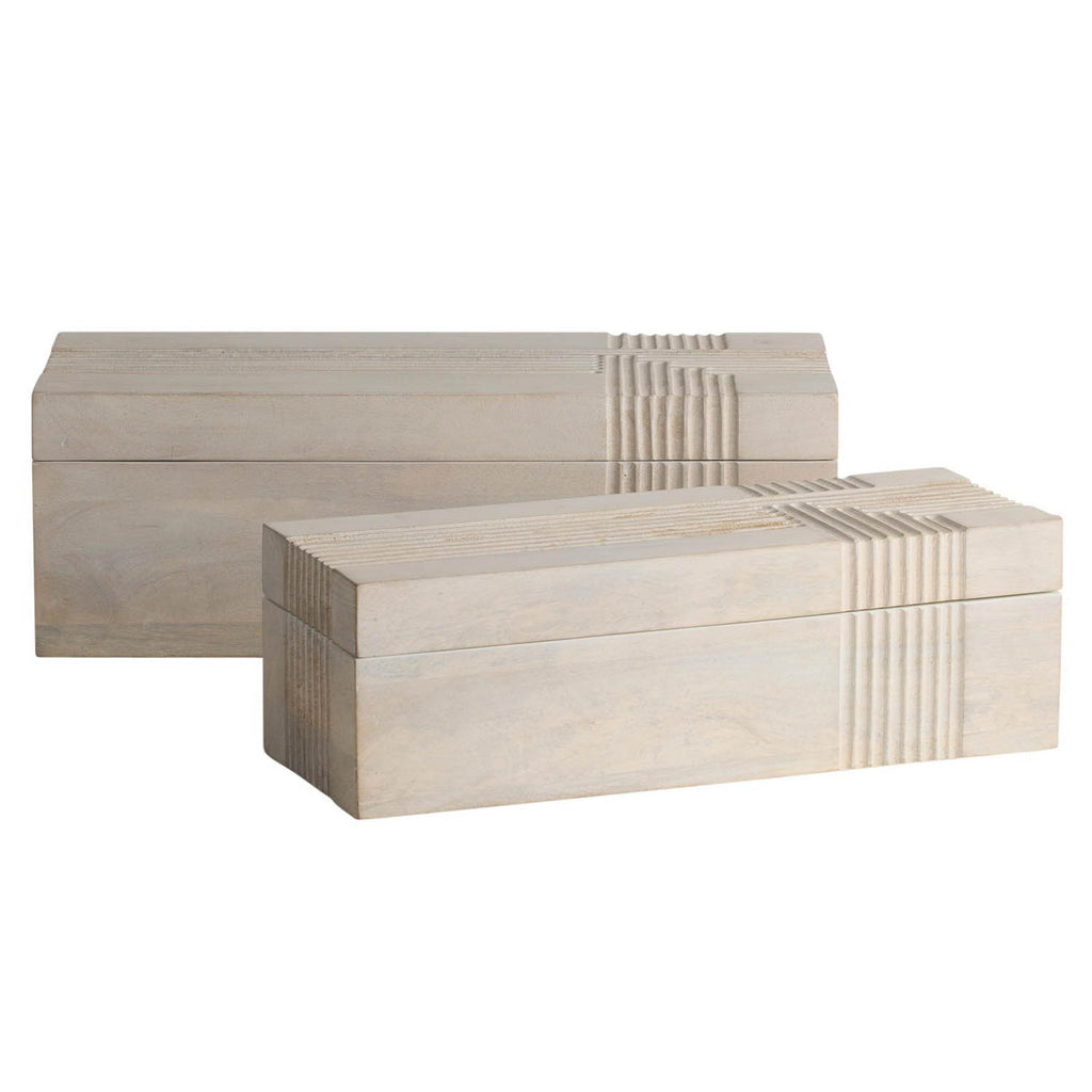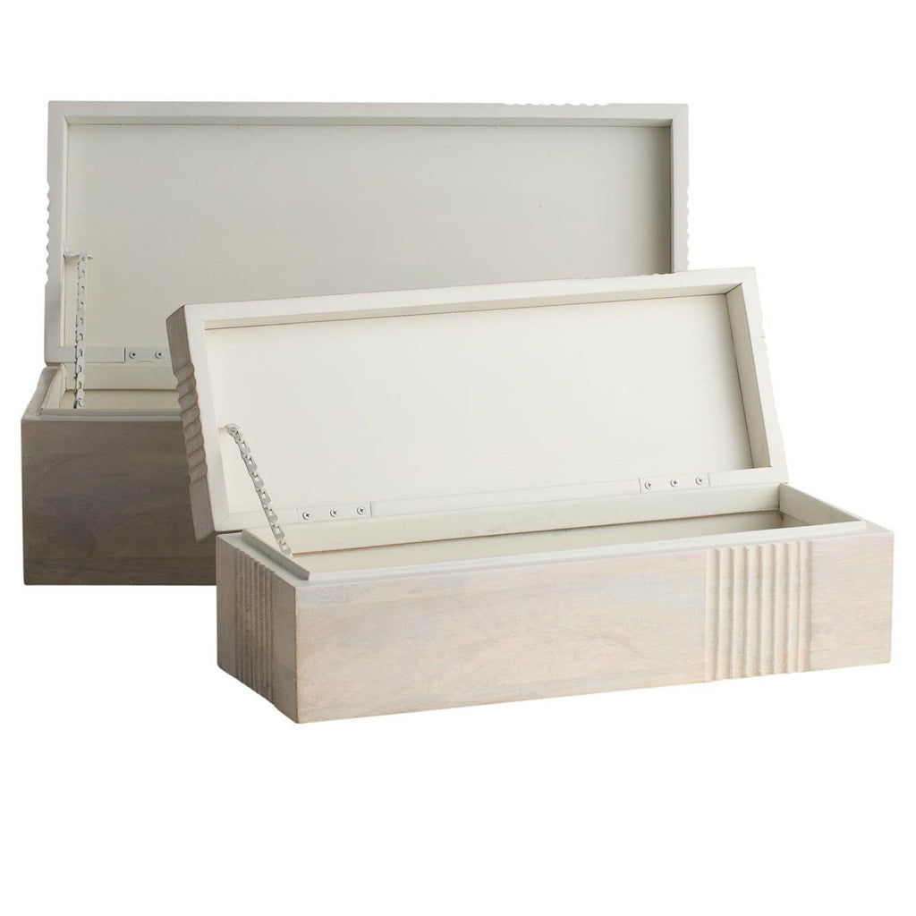 Dual oversized containers of whitewash mango wood make an elegant storage solution. Carved linework cascades in a flowing effect over the sides to draw the eye to this neutral accessory. Hinge and chain interior closure; finish will vary.