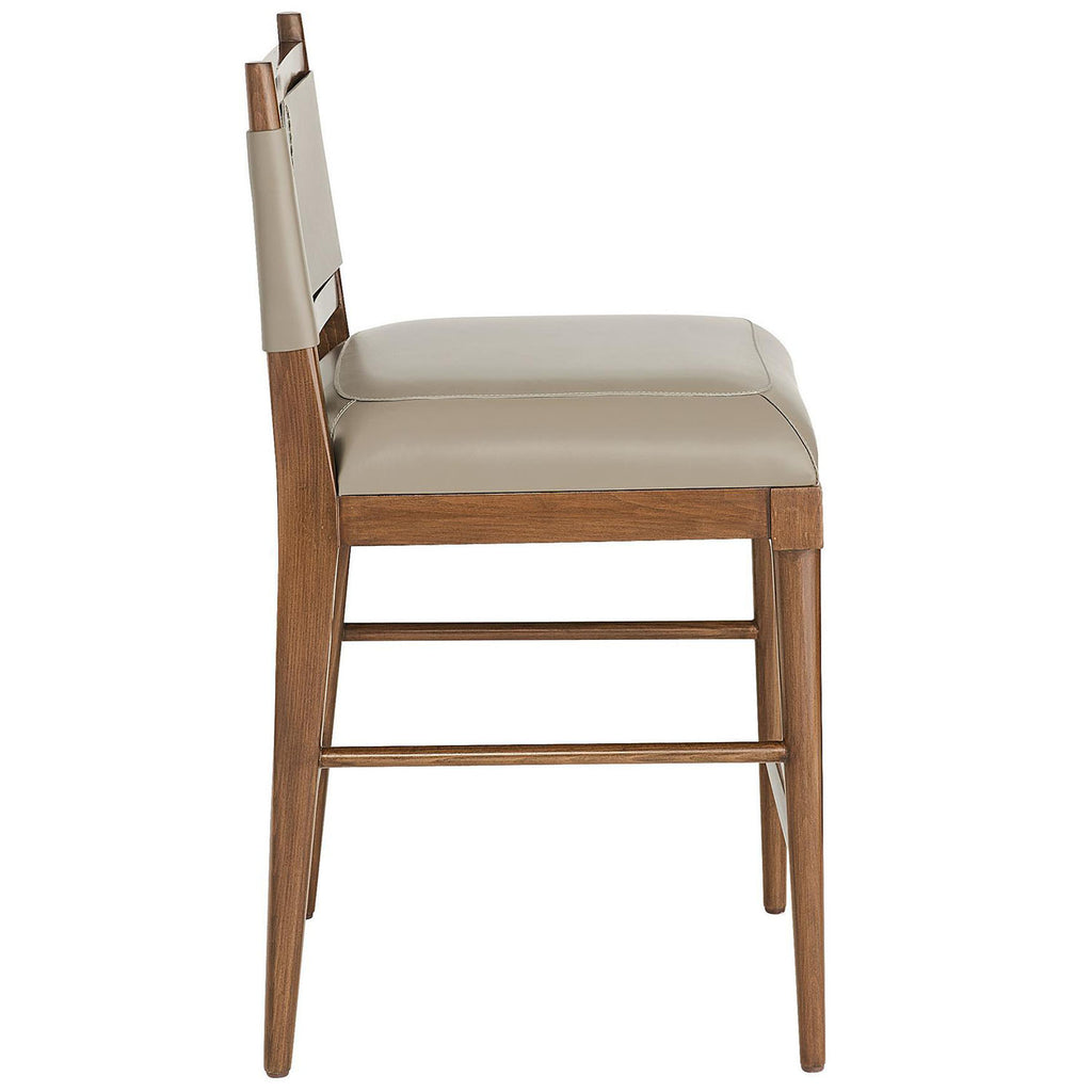 Blending classic and contemporary elements, this counter stool features a low back and a solid walnut frame with elegantly tapered legs that enhance its refined silhouette. Upholstered in top-stitched morel leather, the back is finished with a couture-inspired cross-stitch detail, adding a sophisticated, handcrafted touch. Thoughtfully proportioned, its transitional design complements a variety of interiors, while the sculpted lines and sturdy construction ensure both comfort and lasting durability. Finish will vary.
