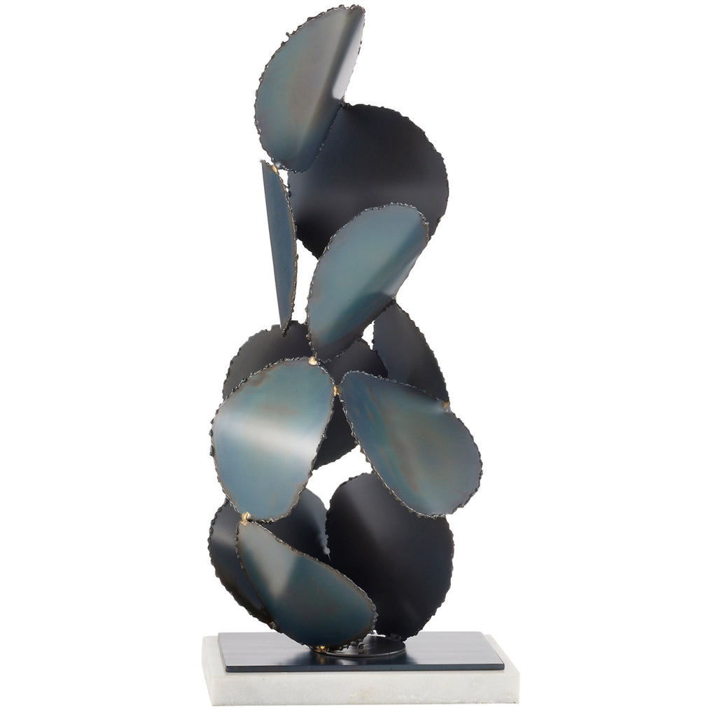Freeform discs of burnt iron gather in a gravity-defying form inspired by the best of brutalist sculpture. Conveying a feeling of constant movement, this sculpture’s purity of line is enhanced by a square base of iron and white marble. Finish will vary.