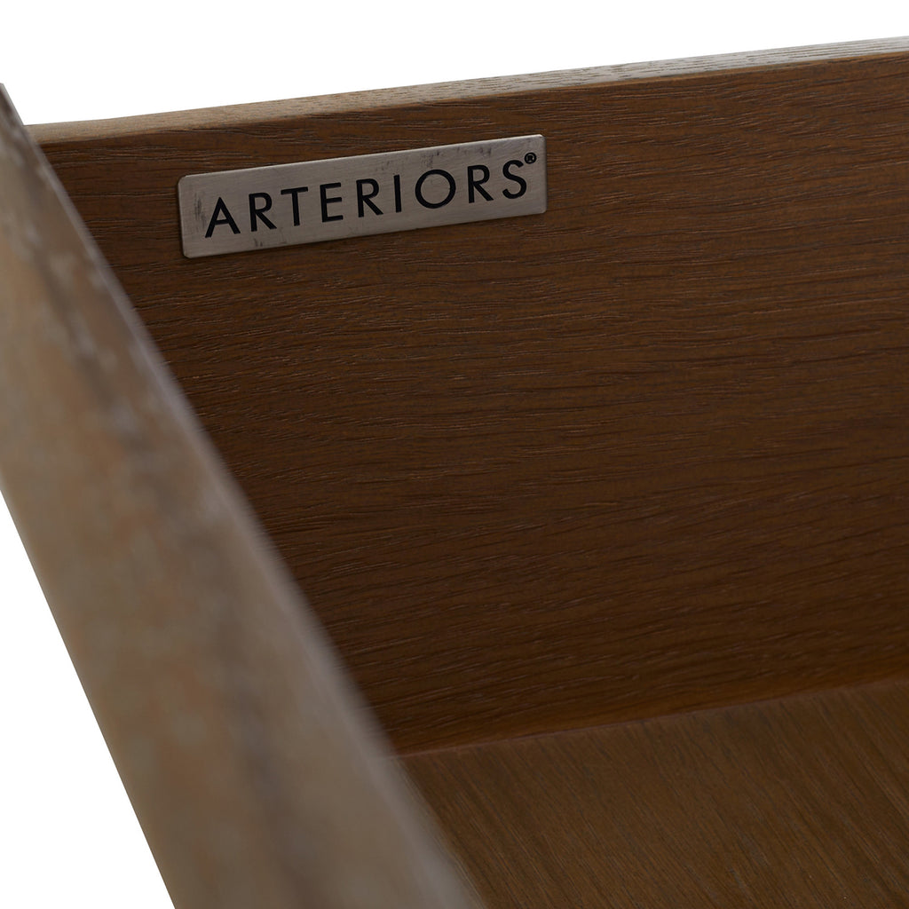 This credenza features a striking sunburst of figural ofram veneer in chateau gray, offset by horizontal grain on top and accented with integrated bronze brass hardware and a metal parting rail. Finish will vary.