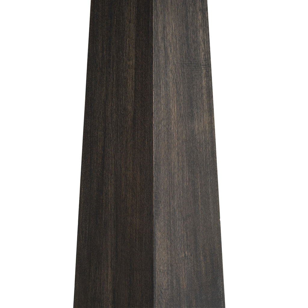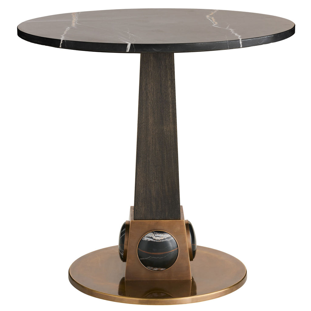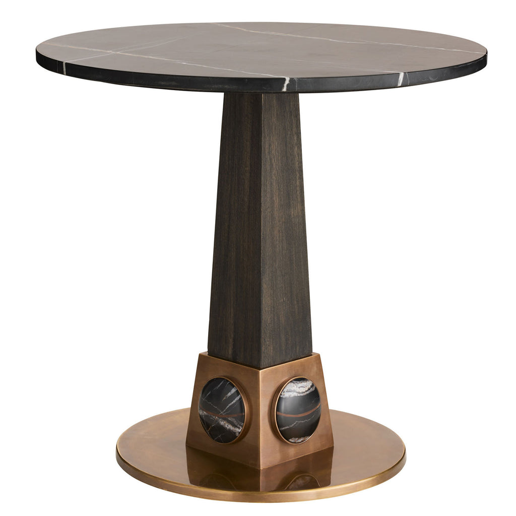 Glamorous from top to base, wire-brushed mango wood end table finished in ebony harkens back to the Art Deco era. The antique brass base, inset with oval cabochons of Bengal marble, adds a jewel-like accent to this pedestal-style piece. Finish will vary.