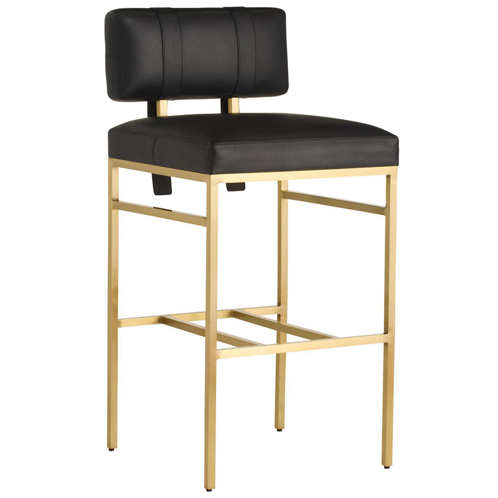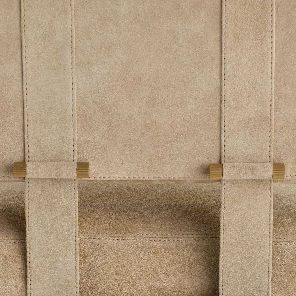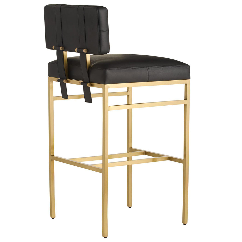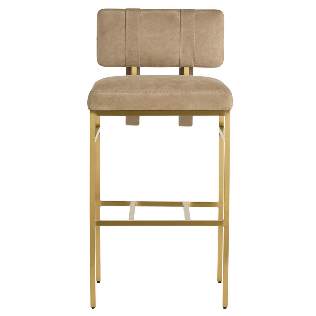 A stable seat with a slim frame of antique brass and dual cushions of soft taupe suede on the seat and back, this bar stool is eye-catching from every angle. Suede details cascade and clasp down the back. Suede will vary.
