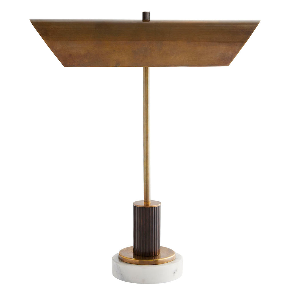 A modern library-style lamp featuring an elongated vintage-brass metal shade atop a bronze-finished aluminum post and white marble base for striking visual contrast. Two sockets for enhanced illumination; finish will vary; indoor only.