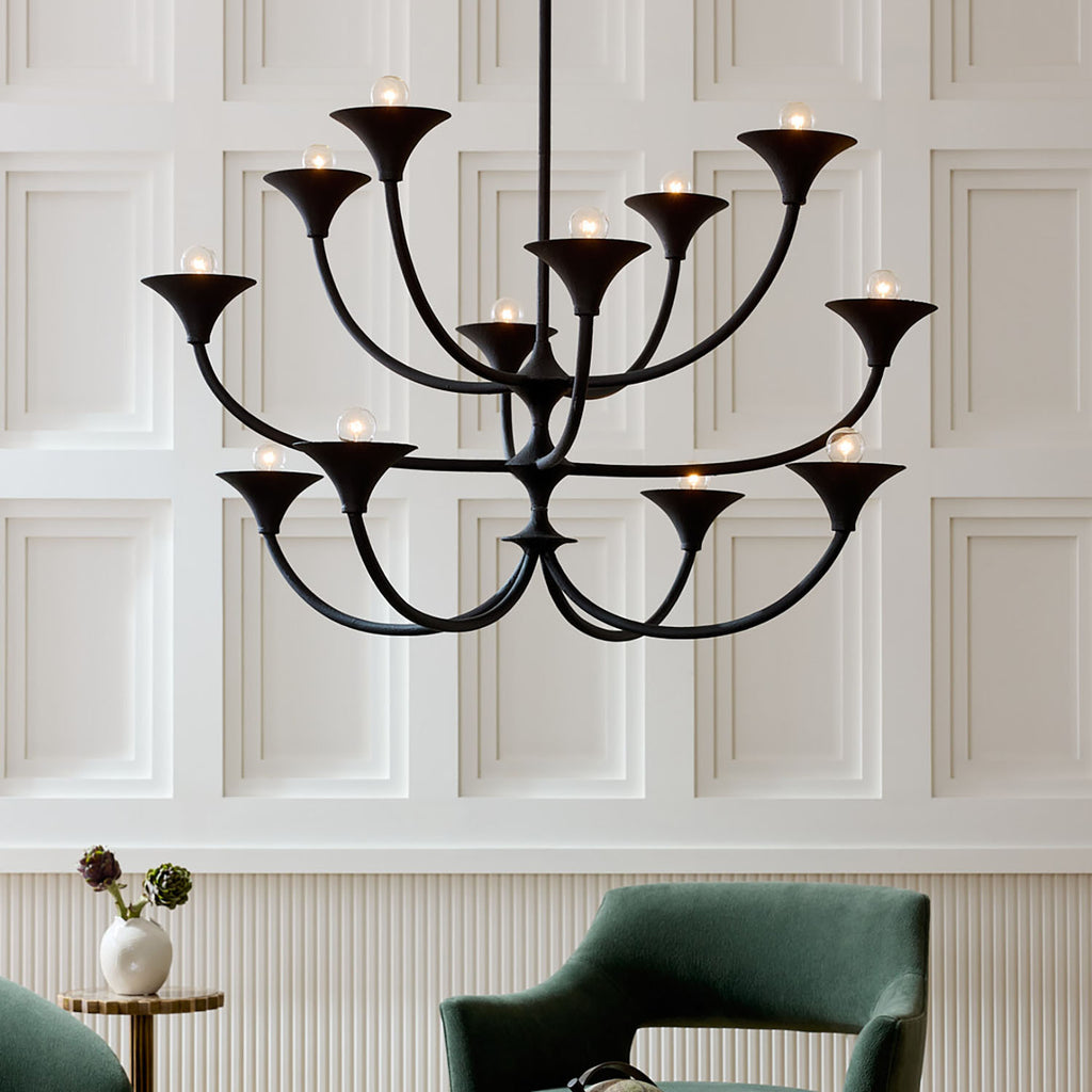 Like a biomorphic sculpture, this fixture boasts twelve black gesso iron arms to radiate light into every corner. Reminiscent of a mobile, the spiny frame hangs from a canopy, allowing this fixture to become a focal point when hung in a spacious living area or entryway. Certified for damp locations and intended for interior use. Finish will vary.