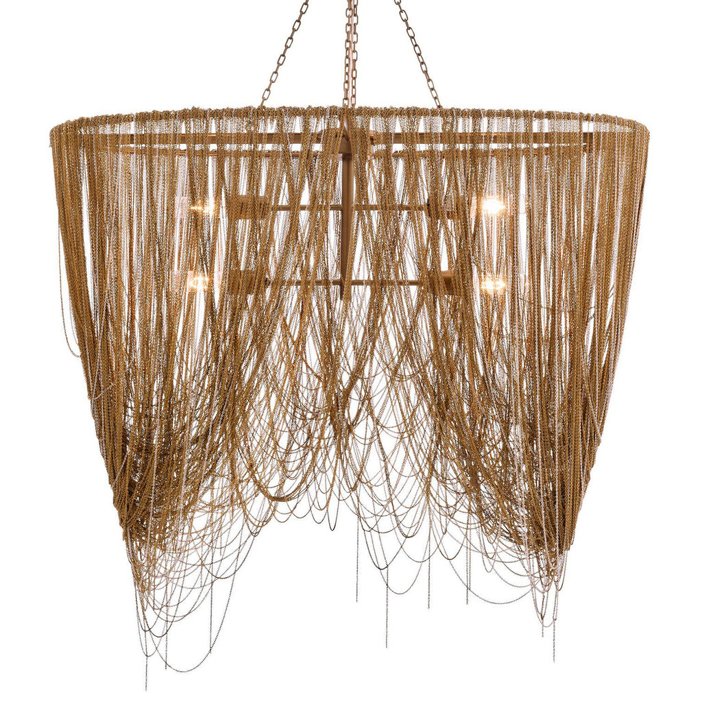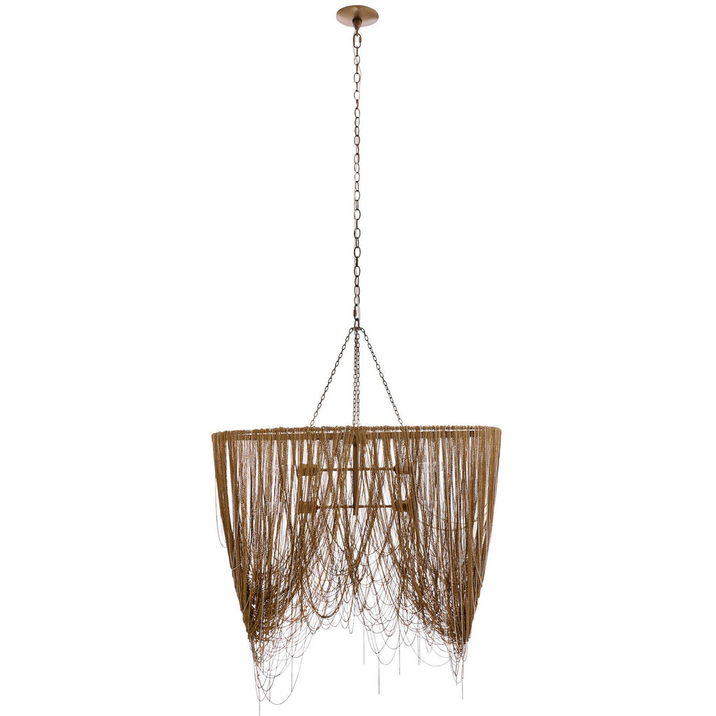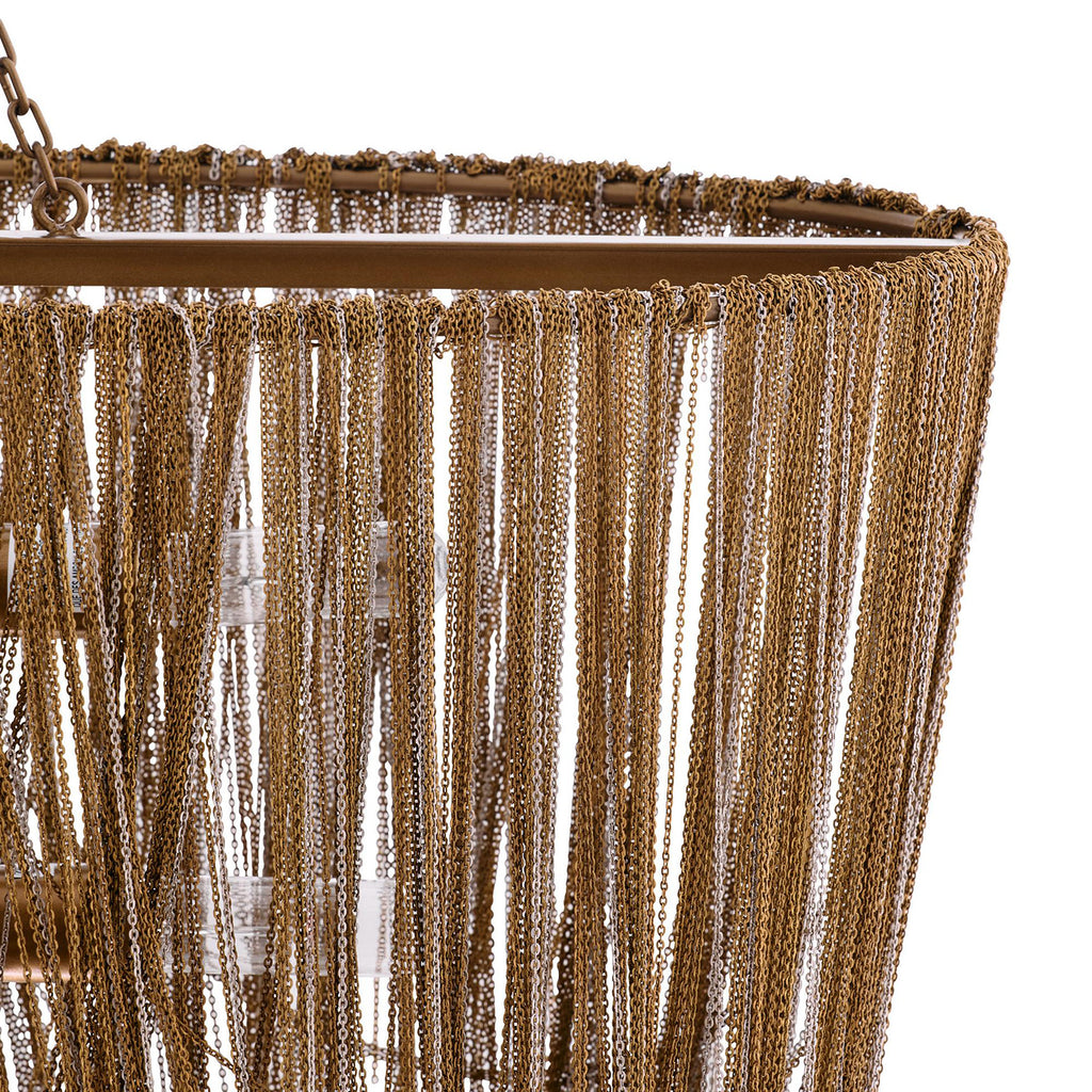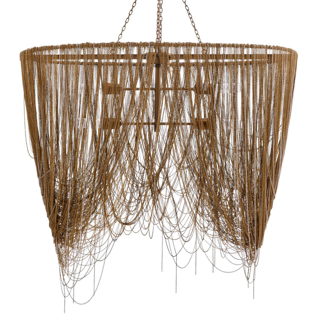 Cascading swags of fine brass chain in antique brass and nickel finishes make this chandelier a dramatic addition to any space. Each piece is handmade, so chain placement and finish will vary. Finish will vary. Damp-rated; limited covered outdoor use may affect finish.