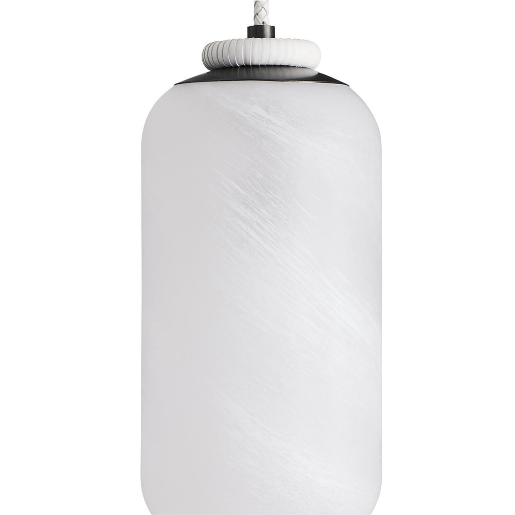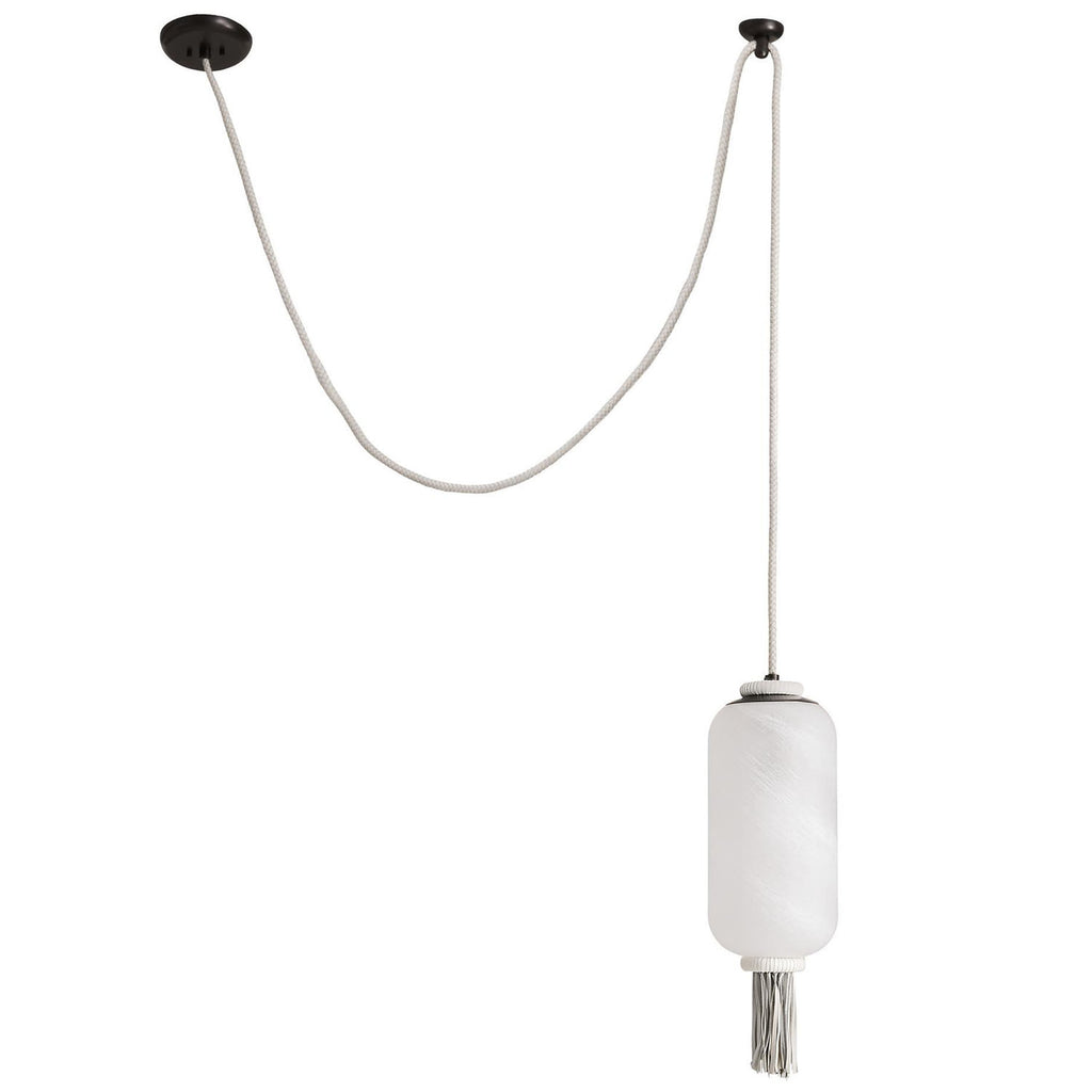A modern take on a traditional Asian lantern, this shade of opal swirl glass is suspended by hand braided white leather at the top and tasseled at the bottom. The leather-wrapped cord can be adjusted to achieve the preferred fixture height while the canopy can be repositioned to adjust the height and width of the draped section for a personalized look. Certified for damp locations and intended for interior use. Finish will vary.