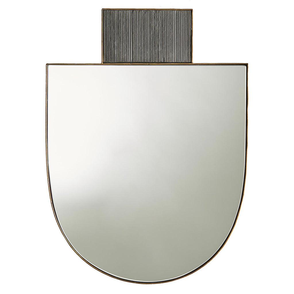 A striking statement mirror with a uniquely shaped frame: hammered gold-finished iron crowned with a black chiseled marble accent. Features a security cleat attachment; marble will vary; finish will vary.