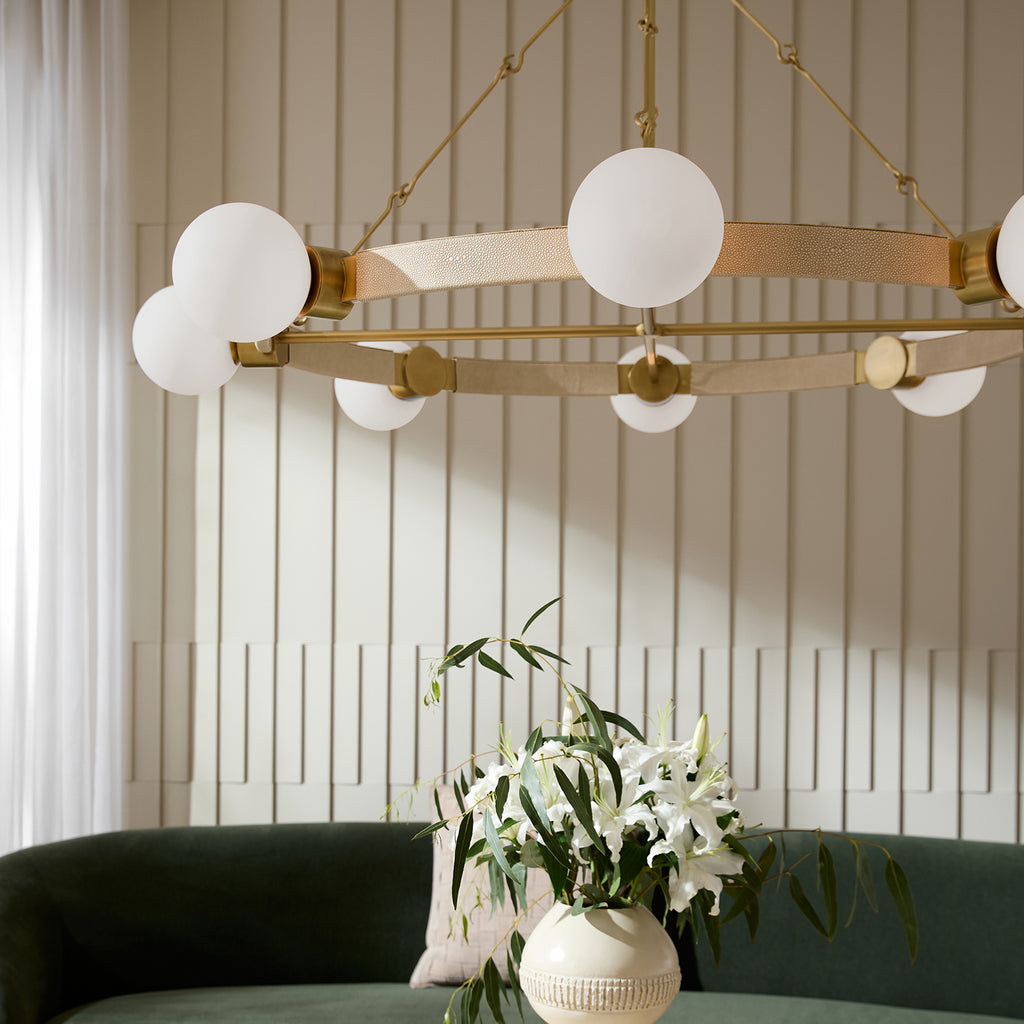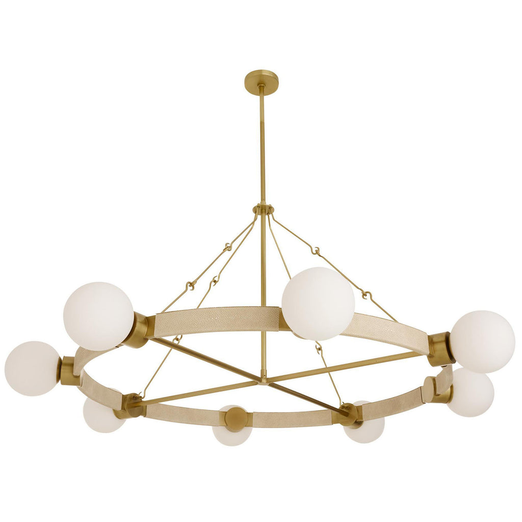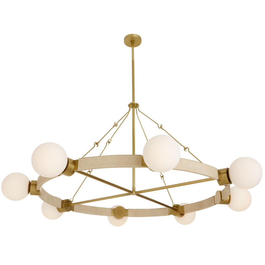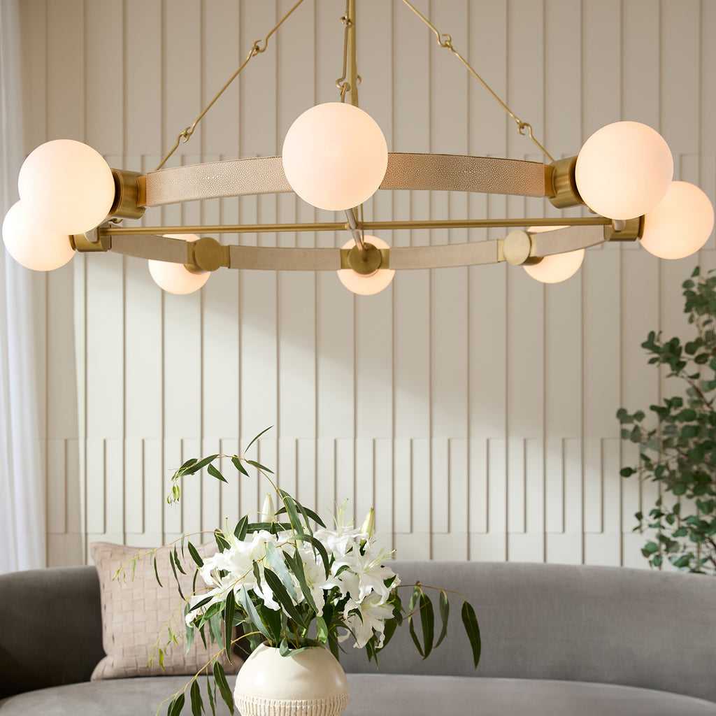An upscale theater marquee light inspired our oversized, round chandelier. Punctuated with eight globes of matte opal glass, a frame of antique brass-plated iron is covered with hand-stitched sleeves of faux shagreen leather that adds a subtle contrast to the polished surface. The scale and texture of this piece make it an eye-catching option for an entryway or large living room. Finish will vary.