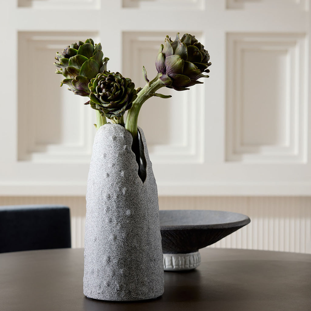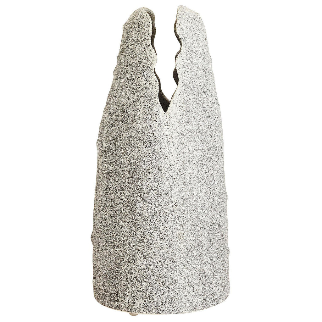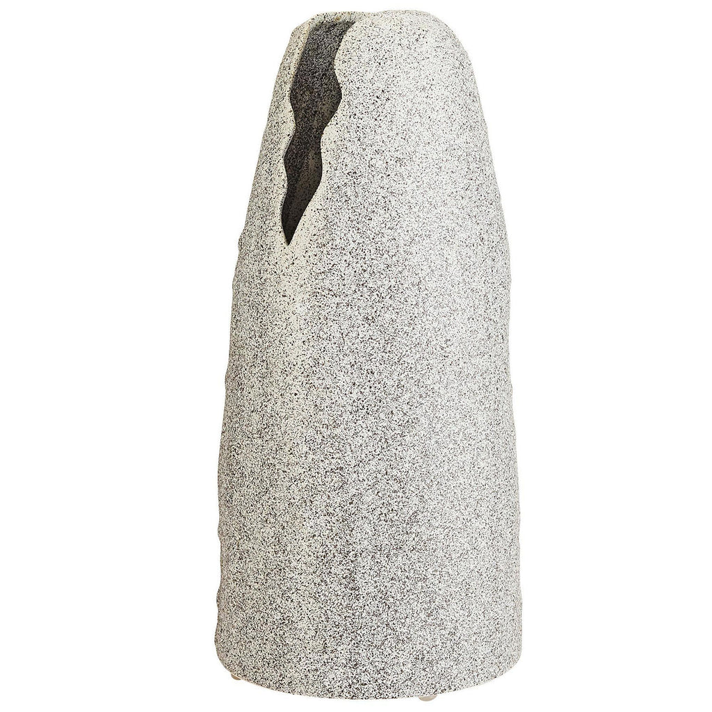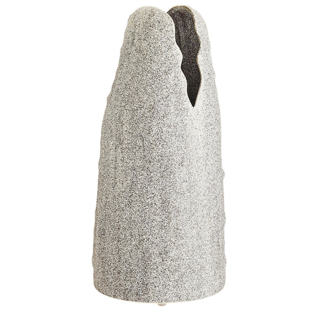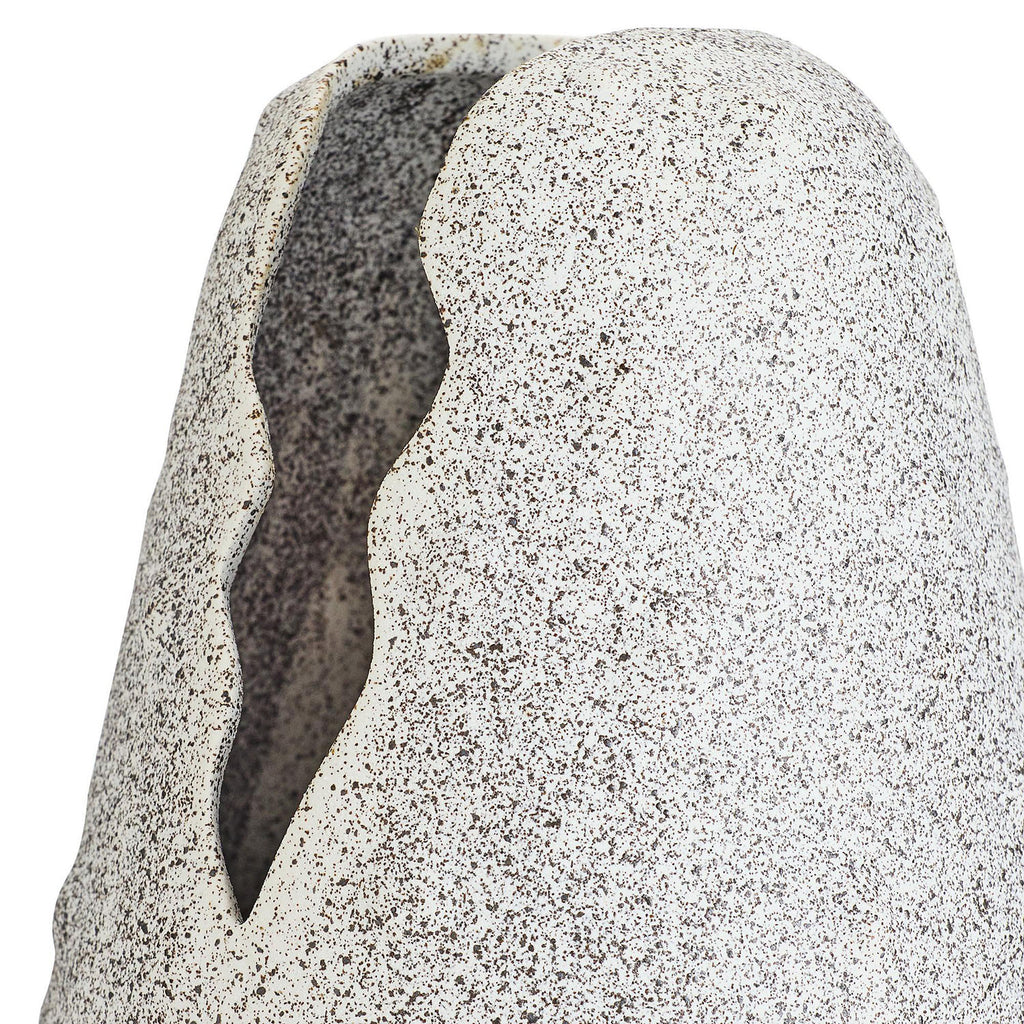 This vase of hand-thrown ceramics' textural surface enchants from every viewpoint. Glazed in a white crackle charcoal wash, its freeform opening makes it an impactful vessel for a large bouquet. Finish will vary.
