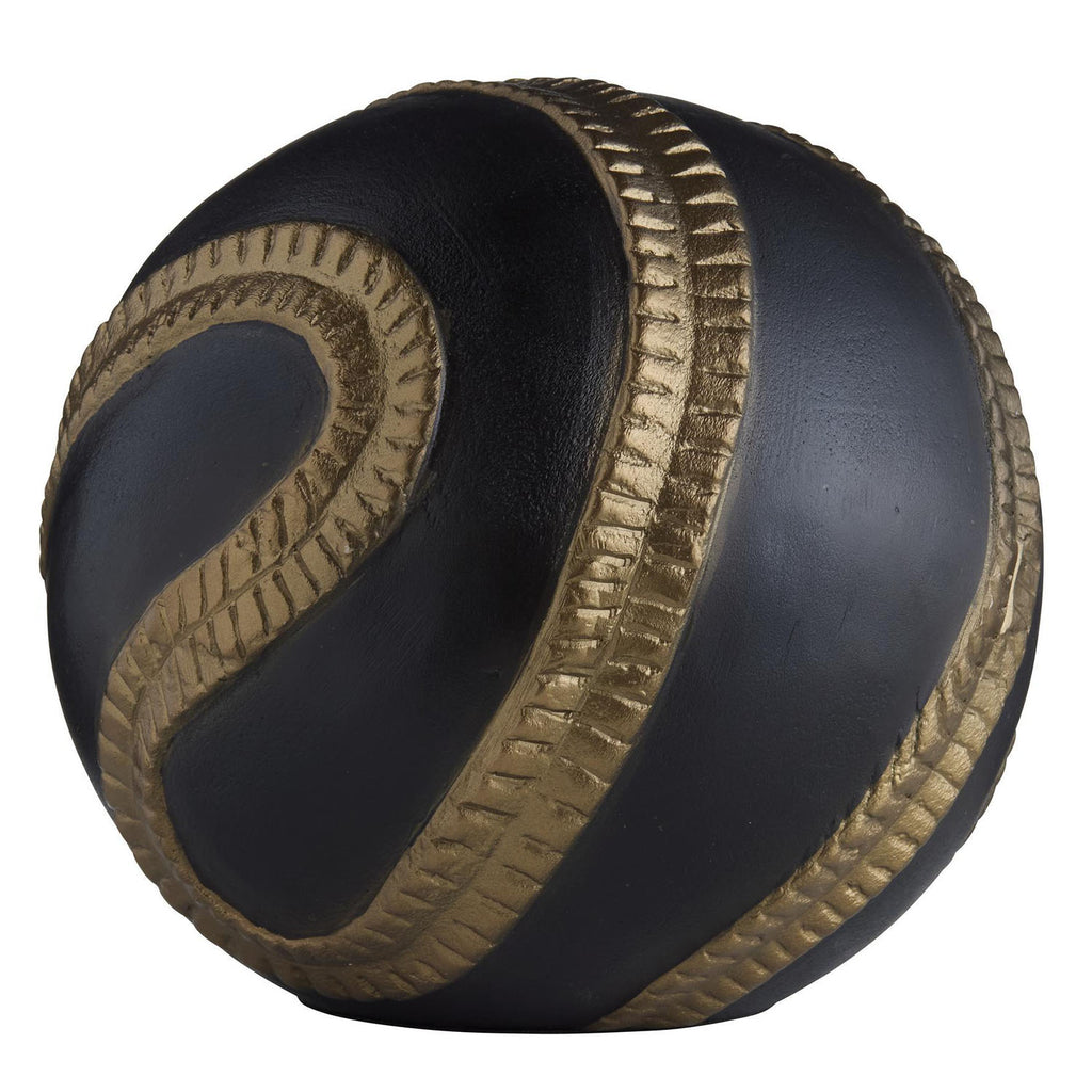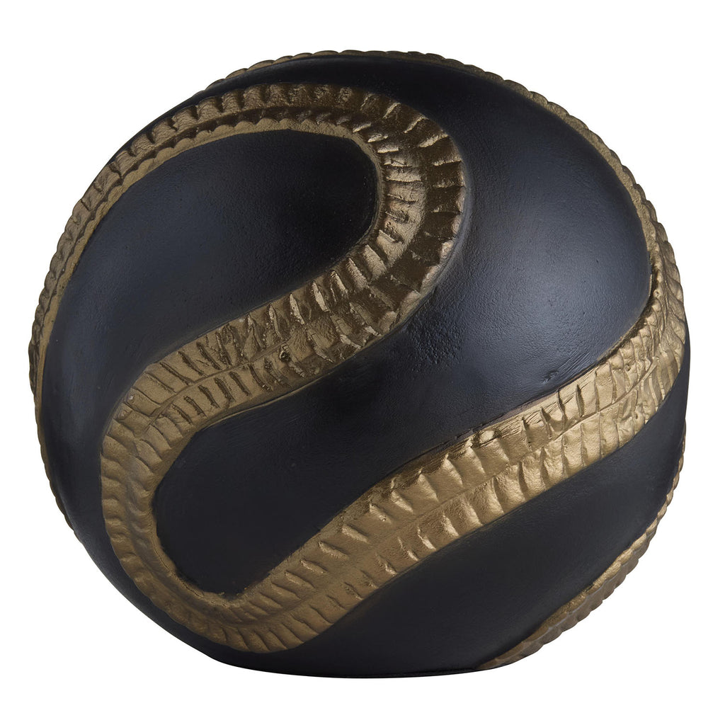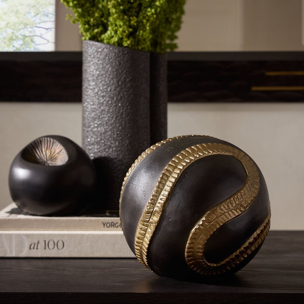 A timeless sphere is reimagined with an antique brass aluminum ribbon appliqué that coils gracefully around its curves like a serpent. Cast in bronze-toned aluminum, this hollow form introduces a sense of movement and rhythm to any display. The artisanal craftsmanship becomes even more striking when arranged in multiples.