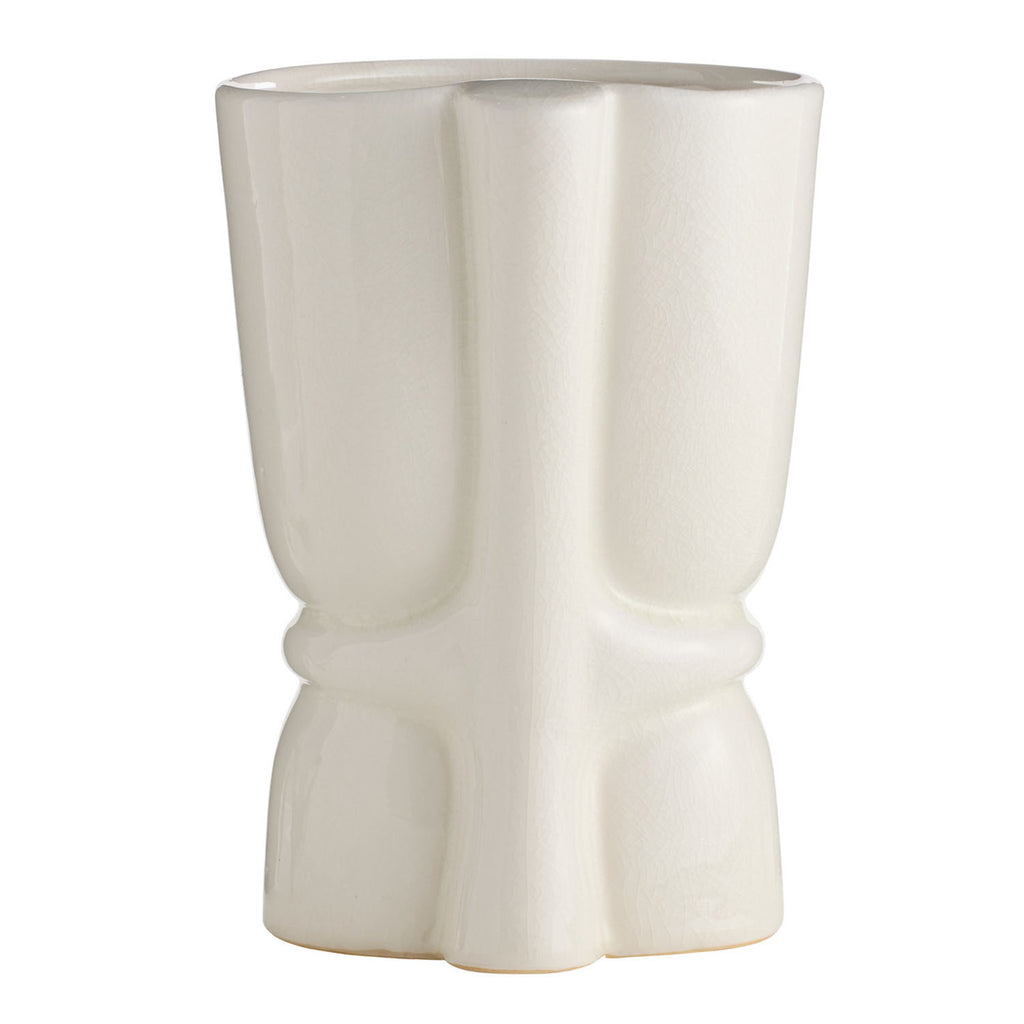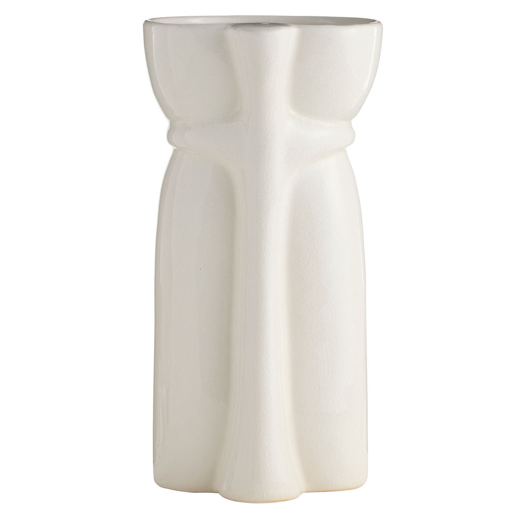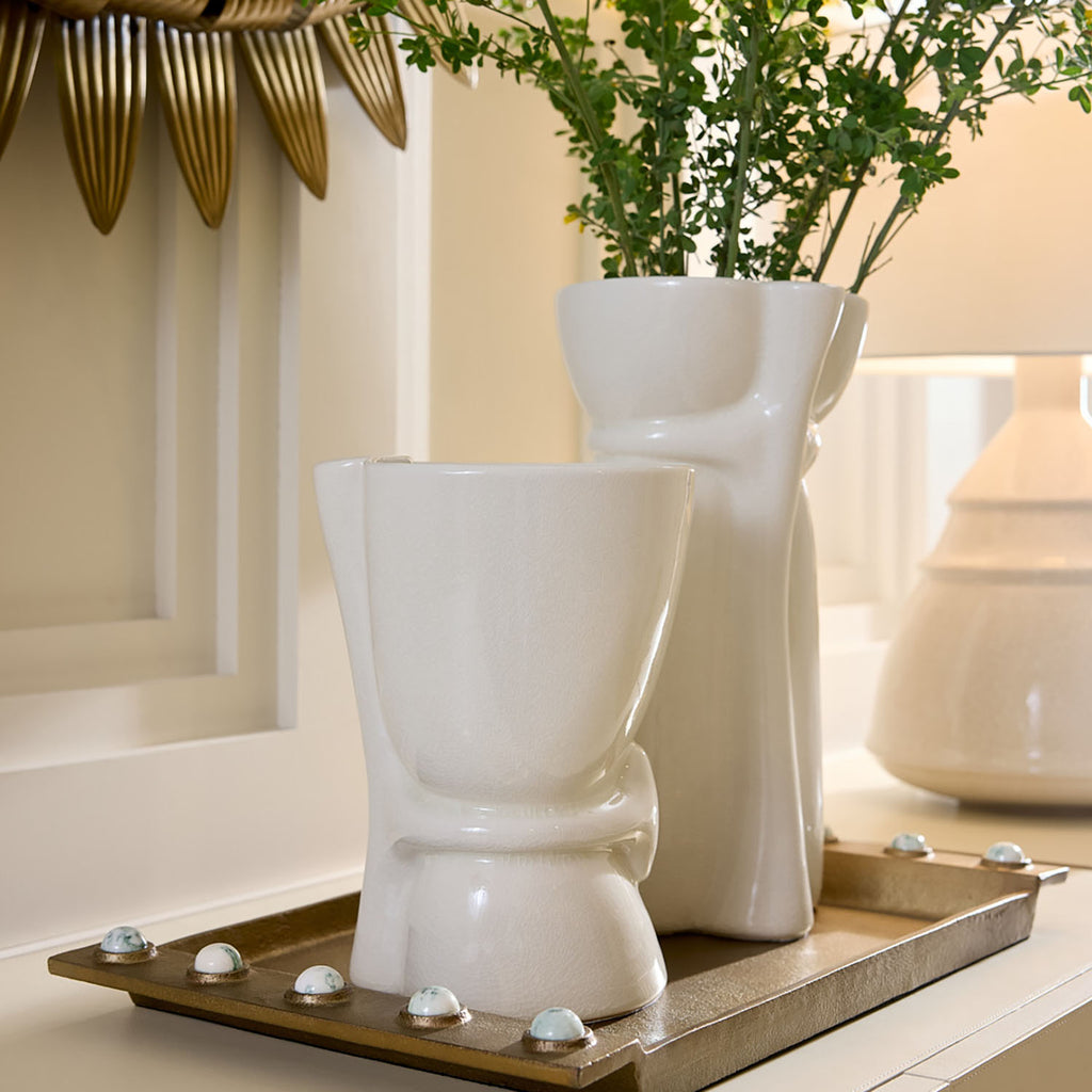 The stylized, flowing forms of Art Nouveau are embodied in this pair of ivory crackle ceramic vases. Each organic silhouette is subtly offset from its companion, creating a harmonious yet contrasting display. Finish will vary.