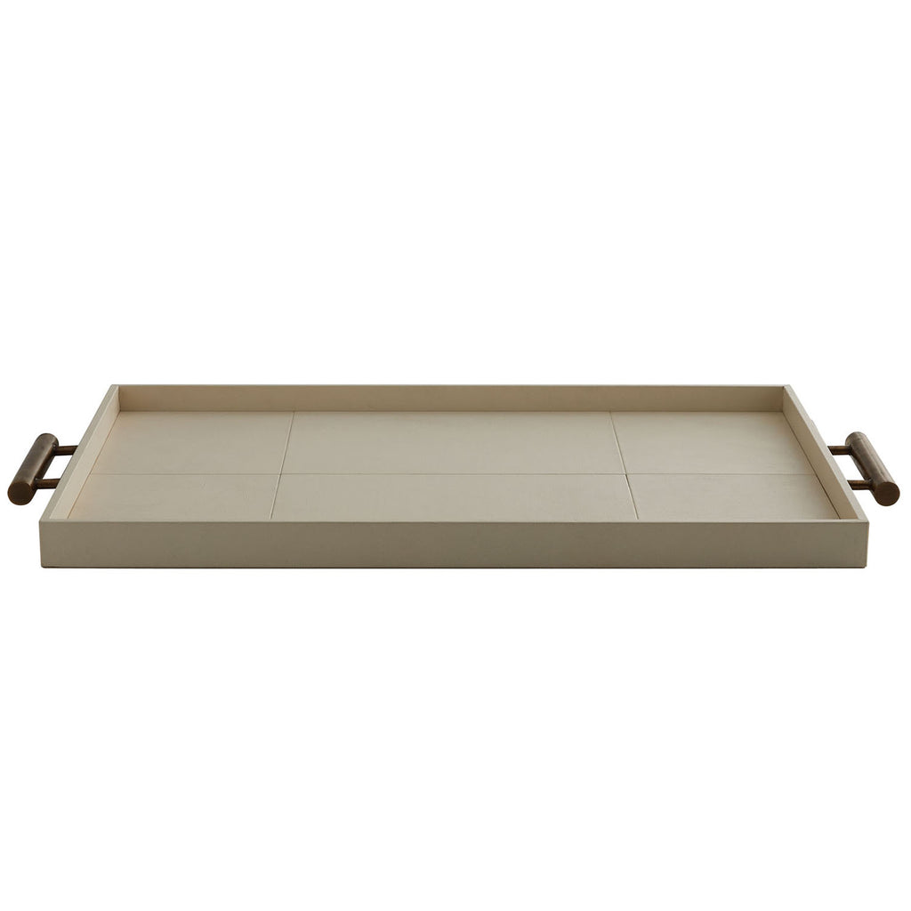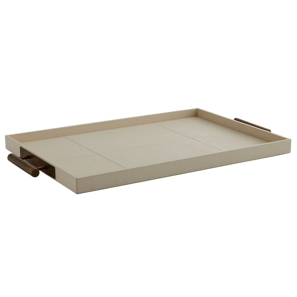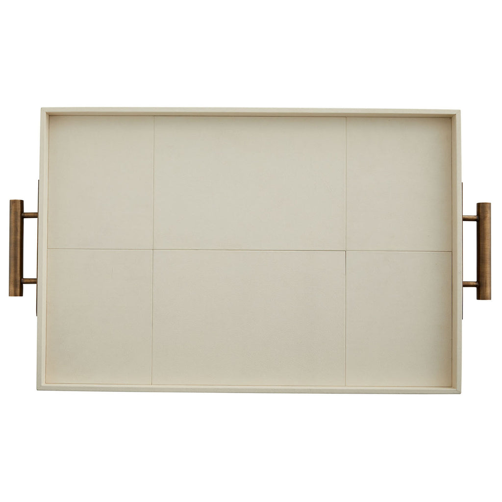 Elegant geometry and refined materials bring this contemporary tray to life. Wrapped entirely in supple ivory leather with tailored stitching is beautifully crafted, adding to its quality and charm. For ease of use, brass handles rest on either side — each finished in a classic antiquing. Leather will vary.
