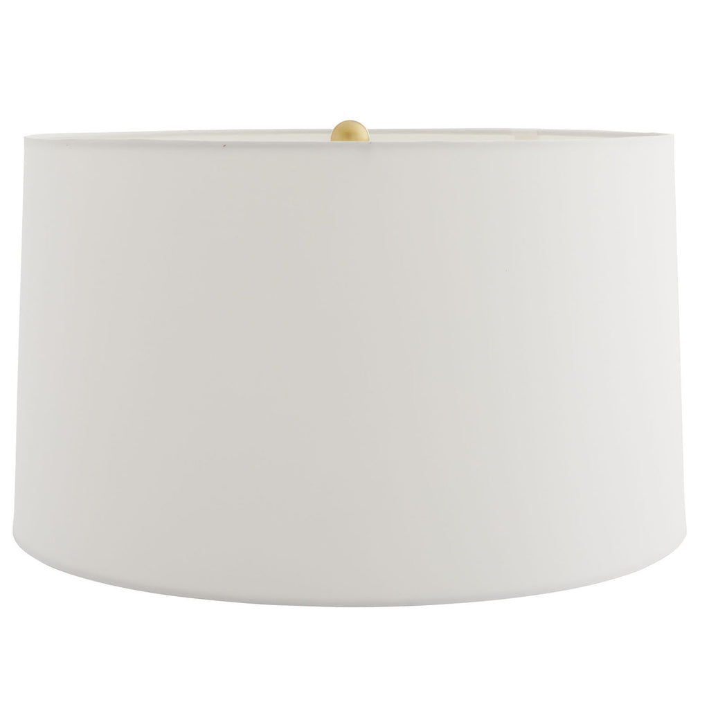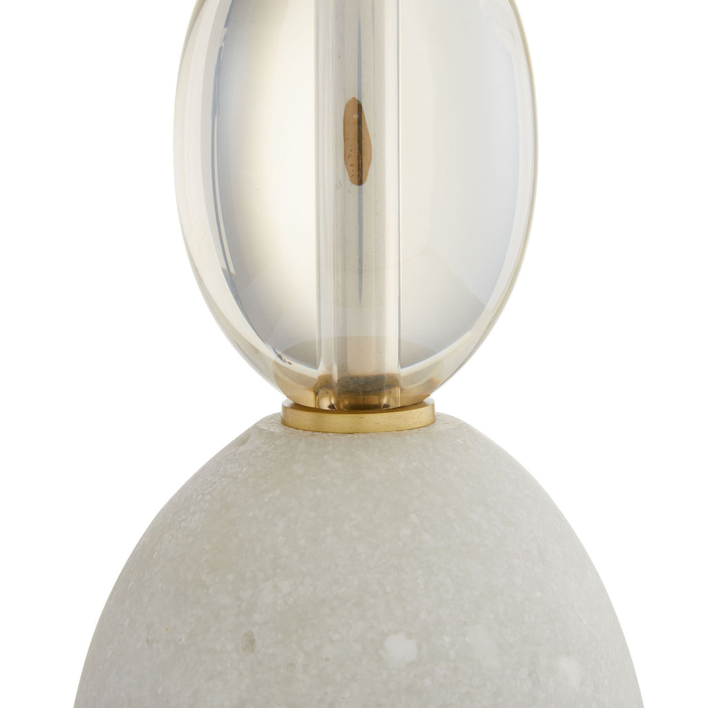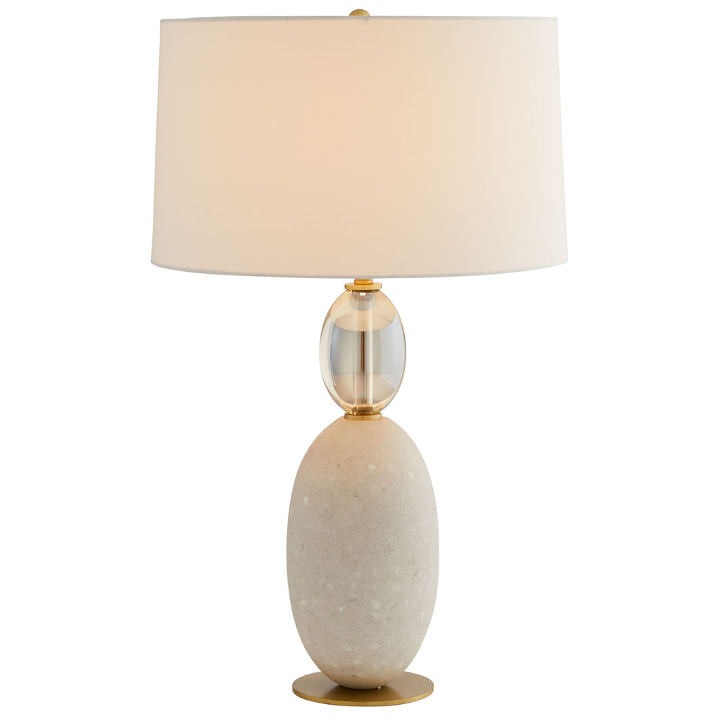 Hollywood glam–inspired, the Minato lamp features stacked ivory glass stone and clear crystal on an antique brass steel base with an off-white microfiber shade and sphere finial. Finish will vary.