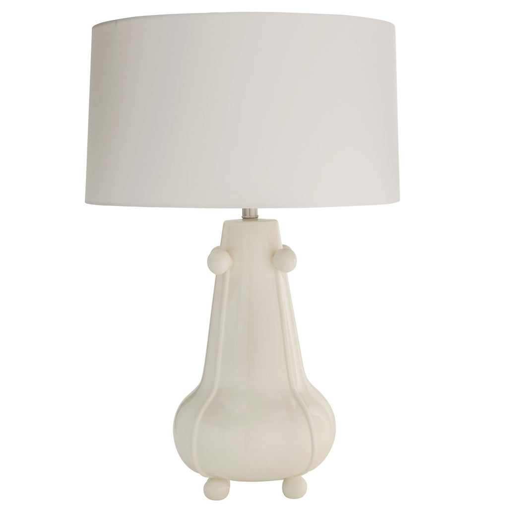 Drawing inspiration from the sinuous lines of Art Nouveau, this hand-crafted ceramic lamp features an elegant, flowing silhouette perched on four spherical feet that echo the base’s detailing. Glazed in an ivory crackle finish that contrasts with polished nickel-plated steel hardware, it is topped with an ivory microfiber drum shade lined in off-white cotton. Finish will vary